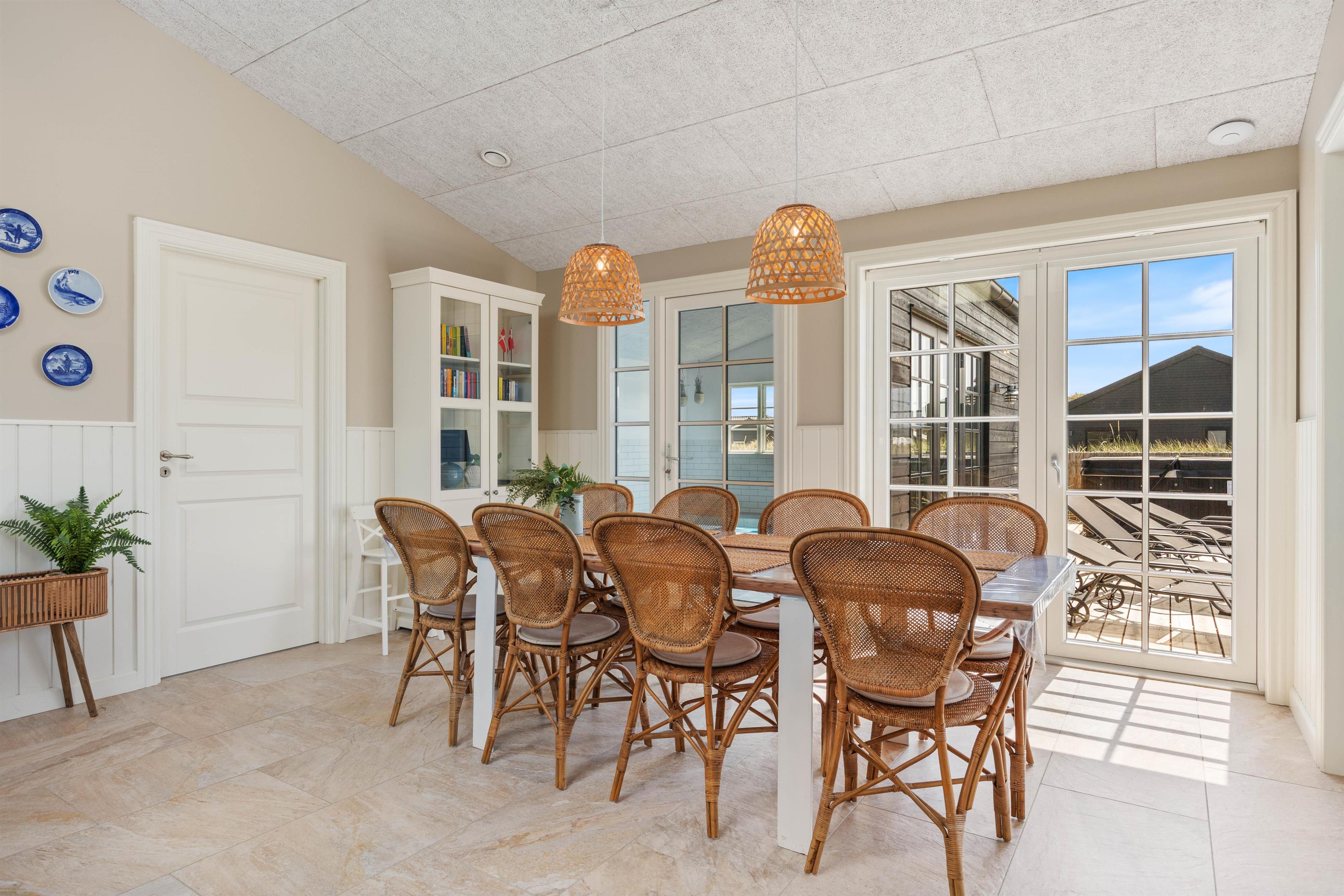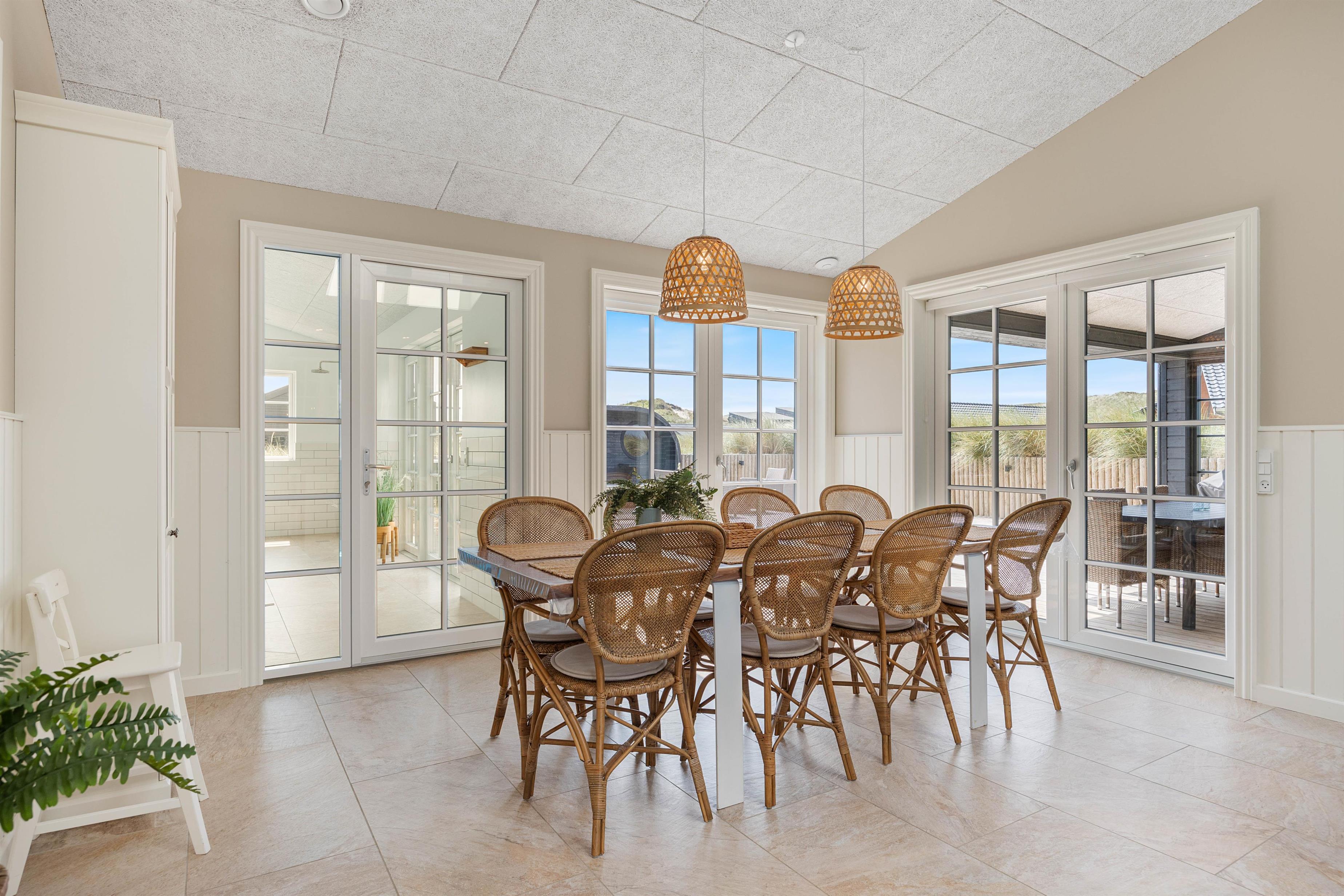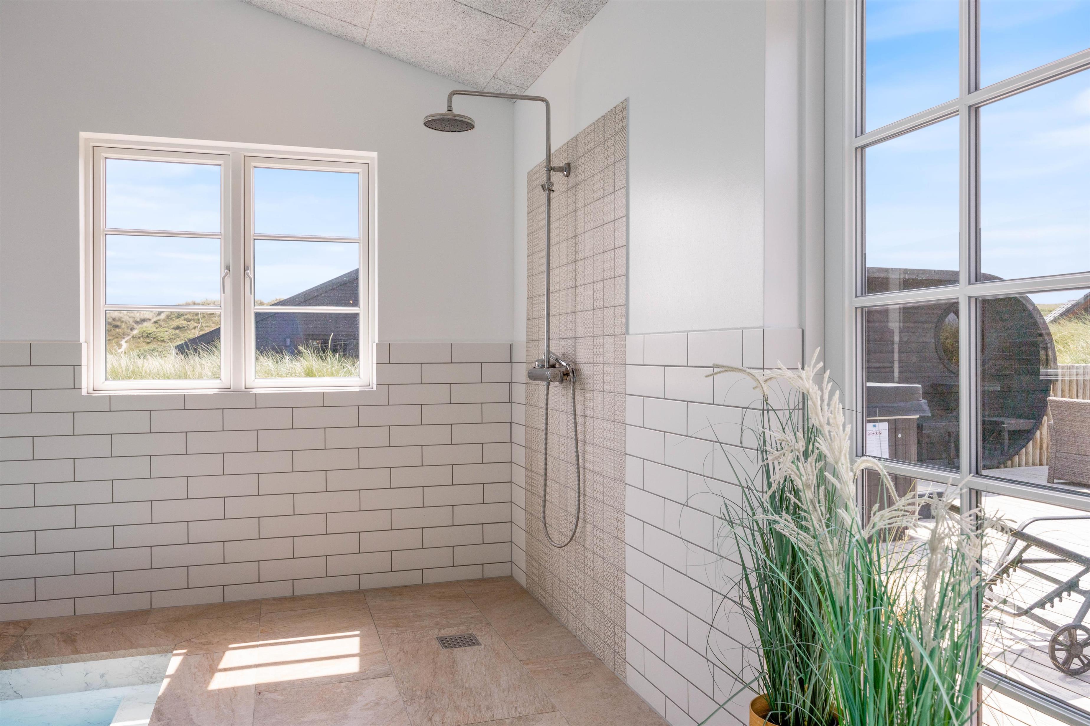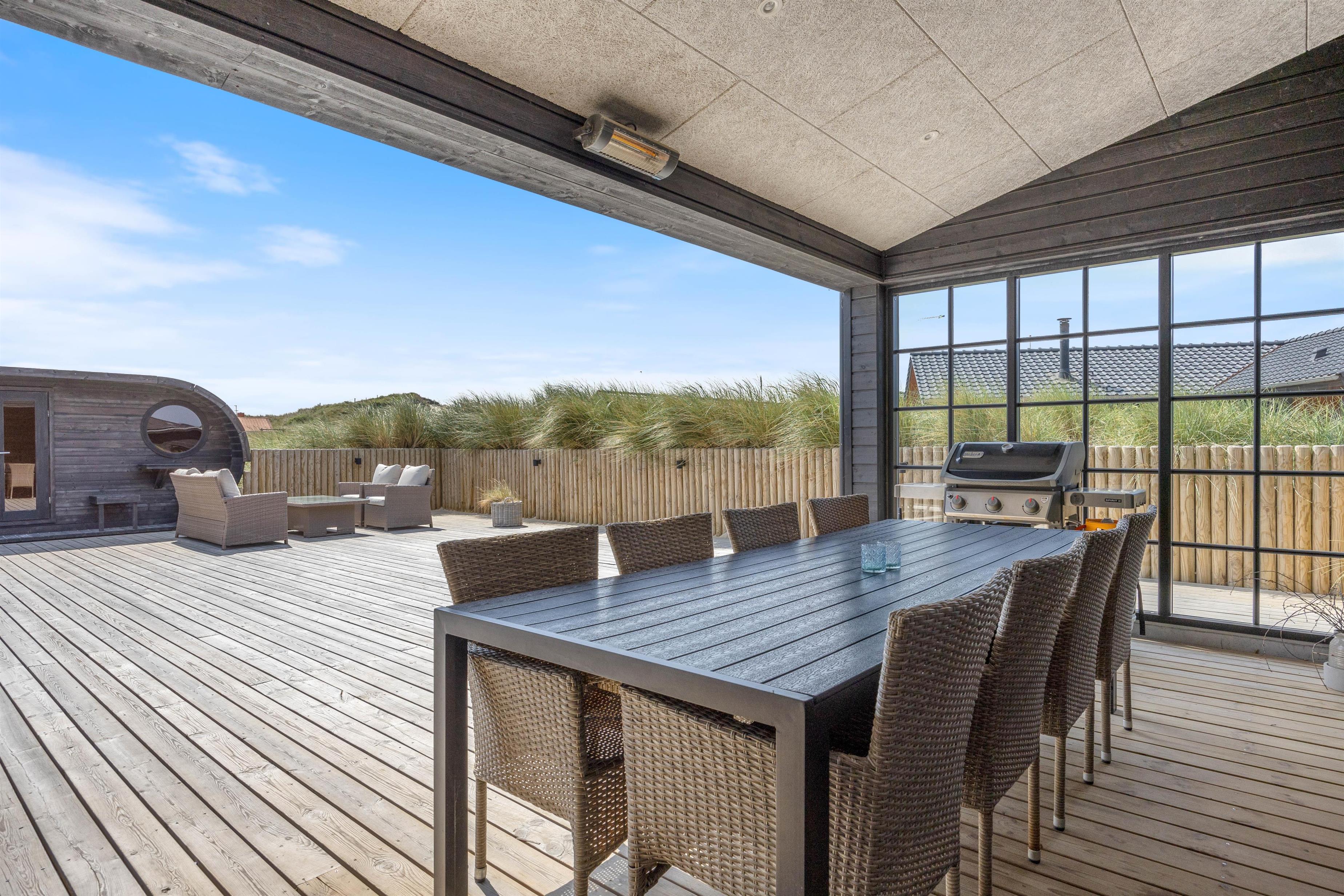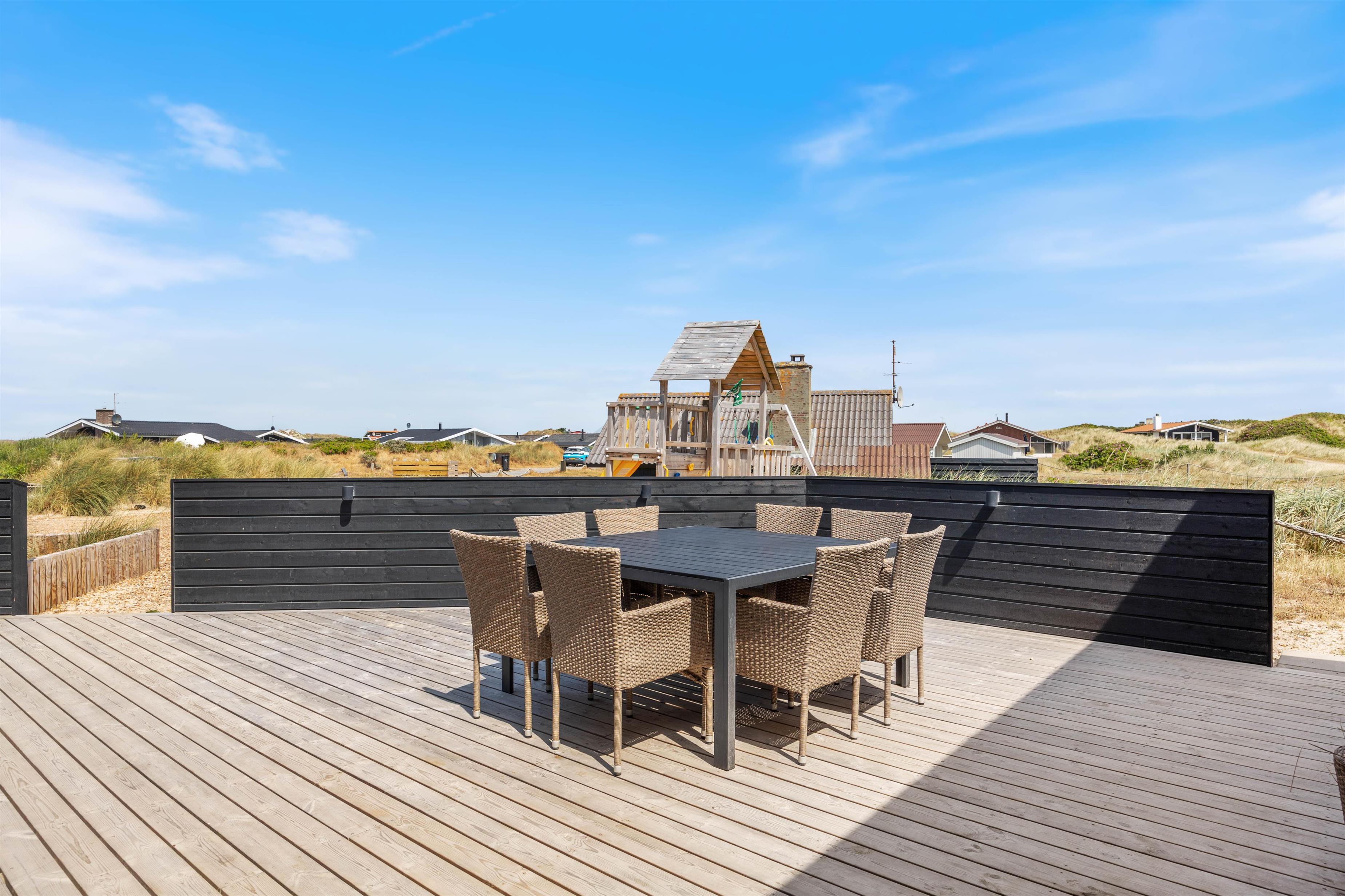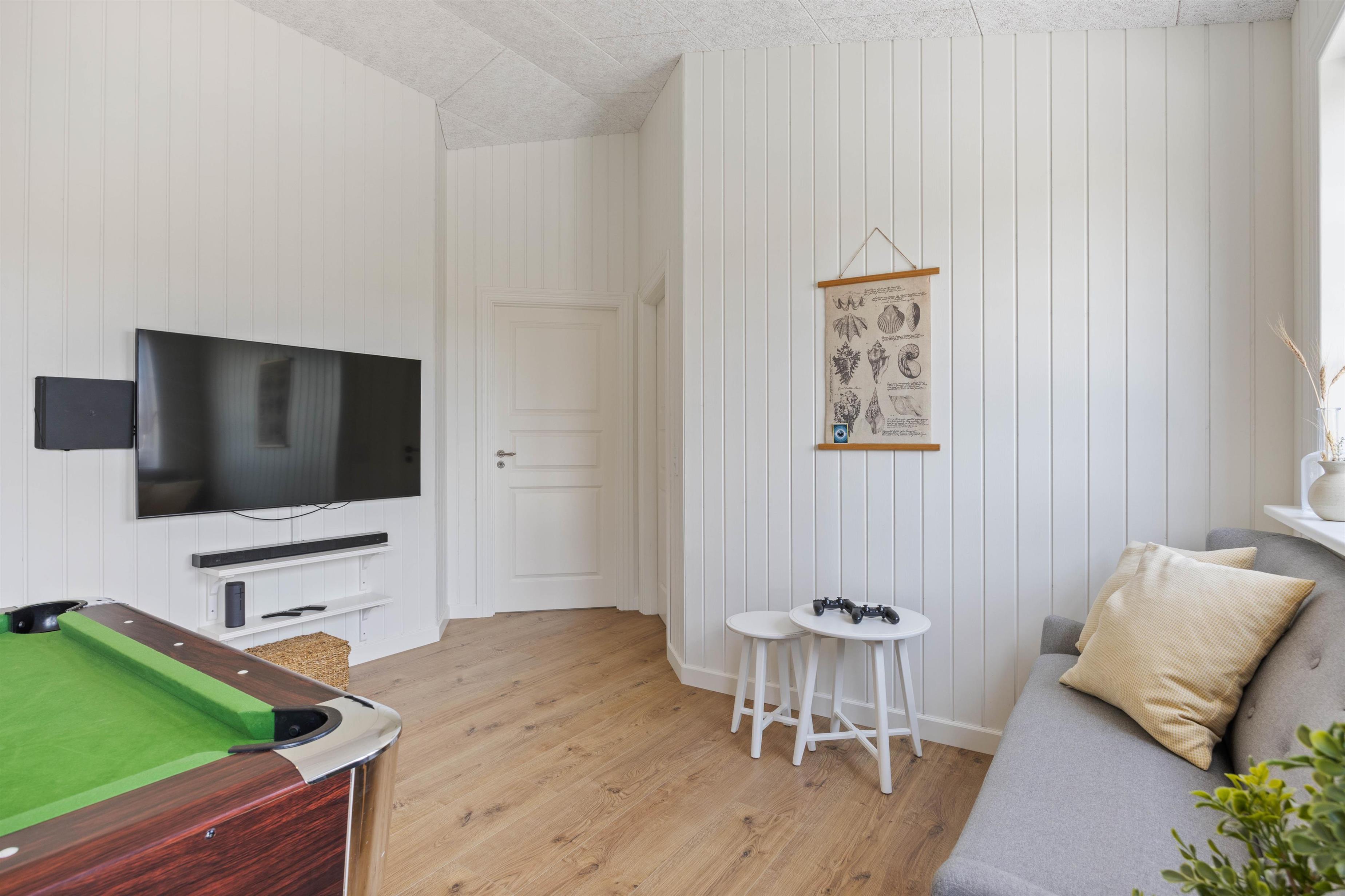 Kan I bruge en dukkert i swimmingpoolen, er den lige ved siden af. Alle aldersgrupper kan i det hele taget være aktive næsten døgnet rundt i dette feriehus, f.eks i det fine aktivitetsrum midt i feriehuset, hvor I kan få gang i energiomsætningen. Afslapning indendørs eller udendørs er også tilgængeligt, enten i de behagelige sofaer og stole eller udendørs i de komfortable møbler. I de fire soveværelser med dobbeltsenge kan I få godt udsovet i den friske vesterhavsluft. De 2 badeværelser gør, at I ikke behøver at stå i kø til morgenbadet.