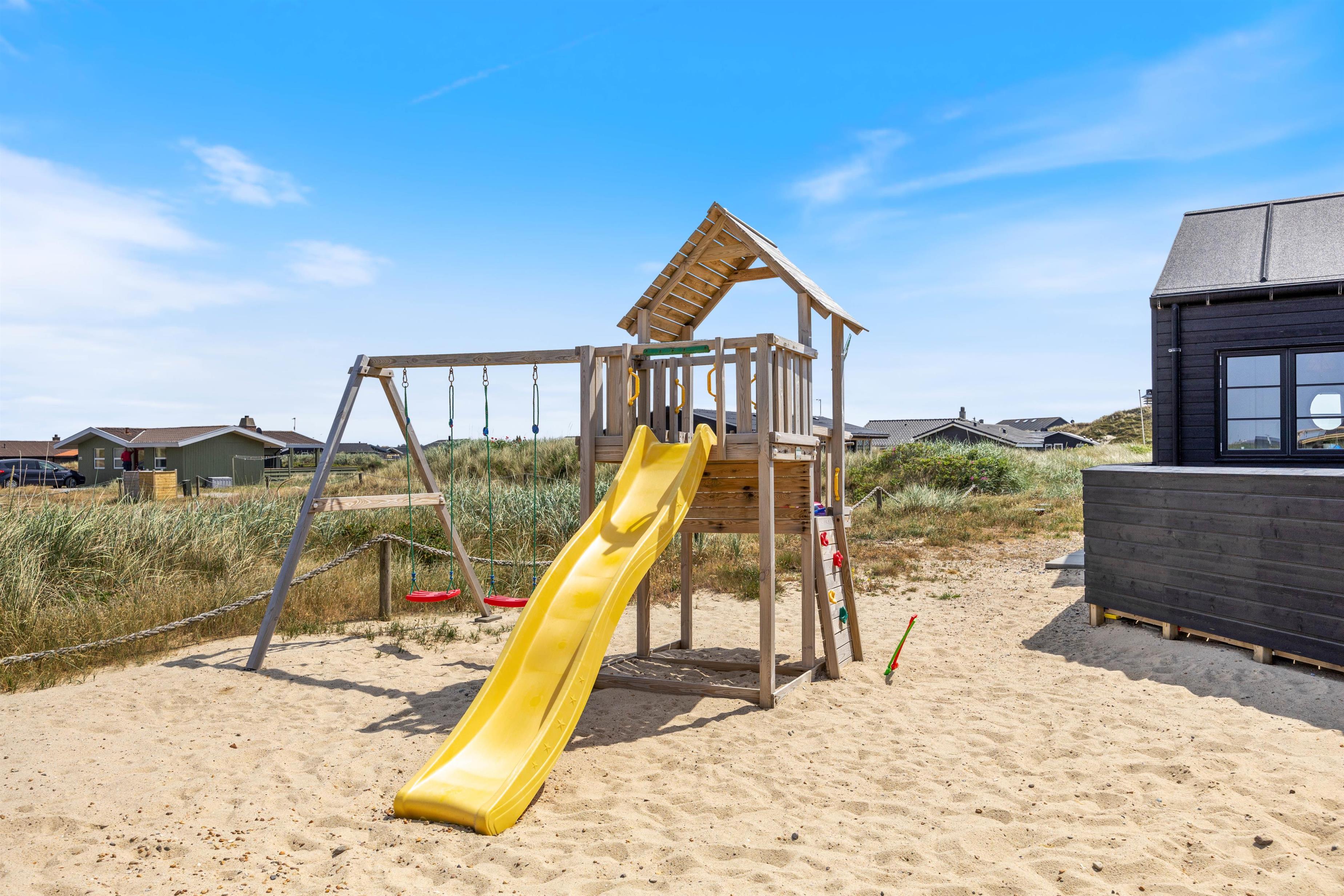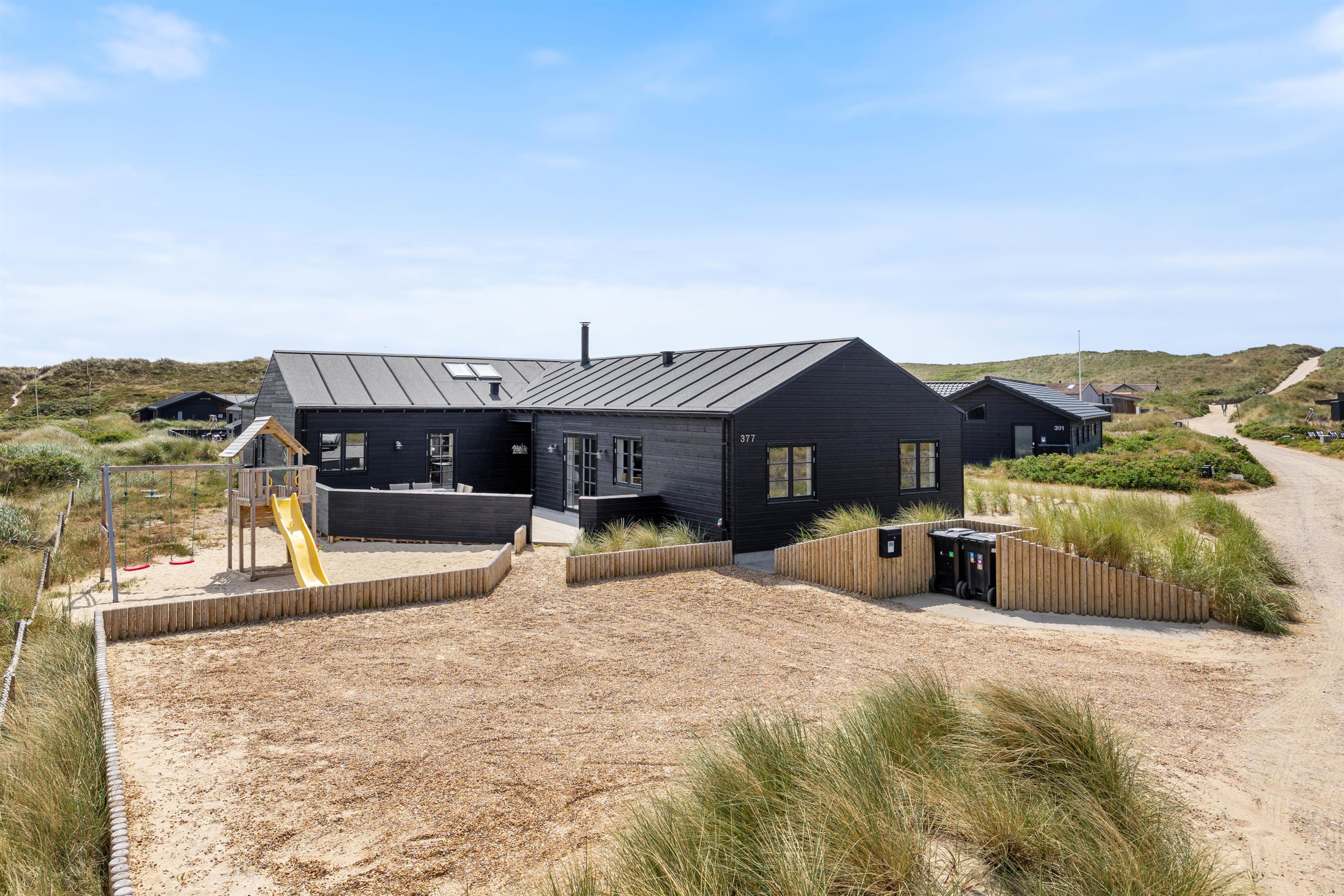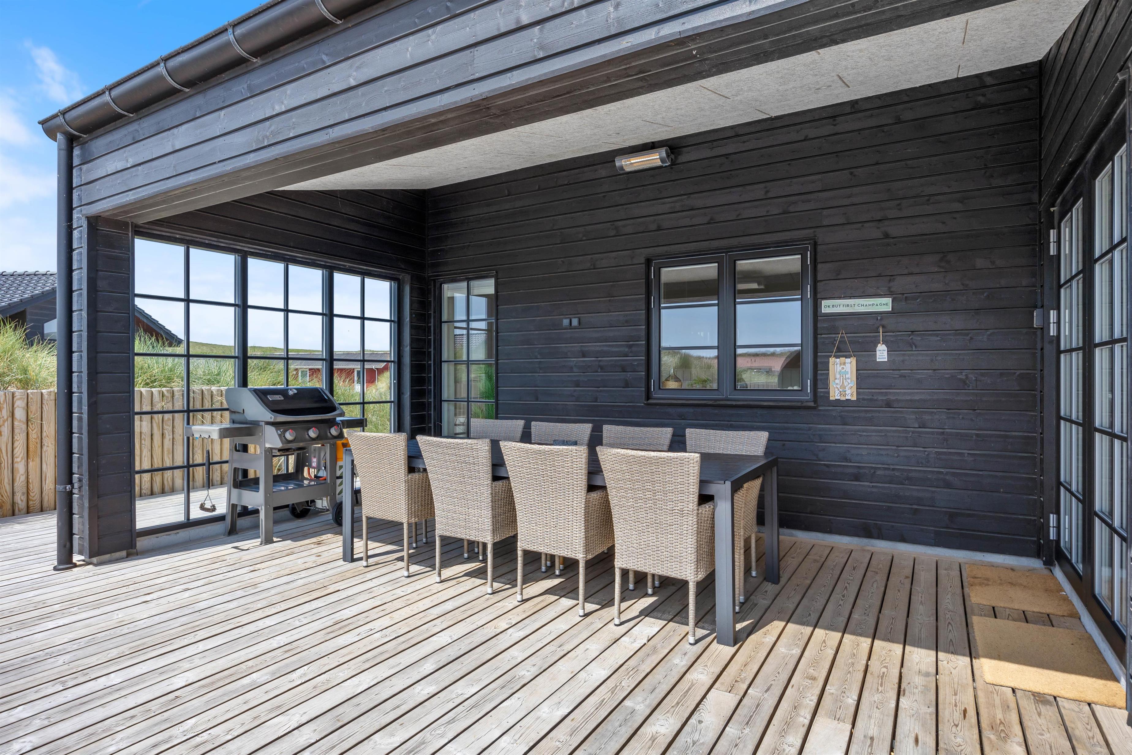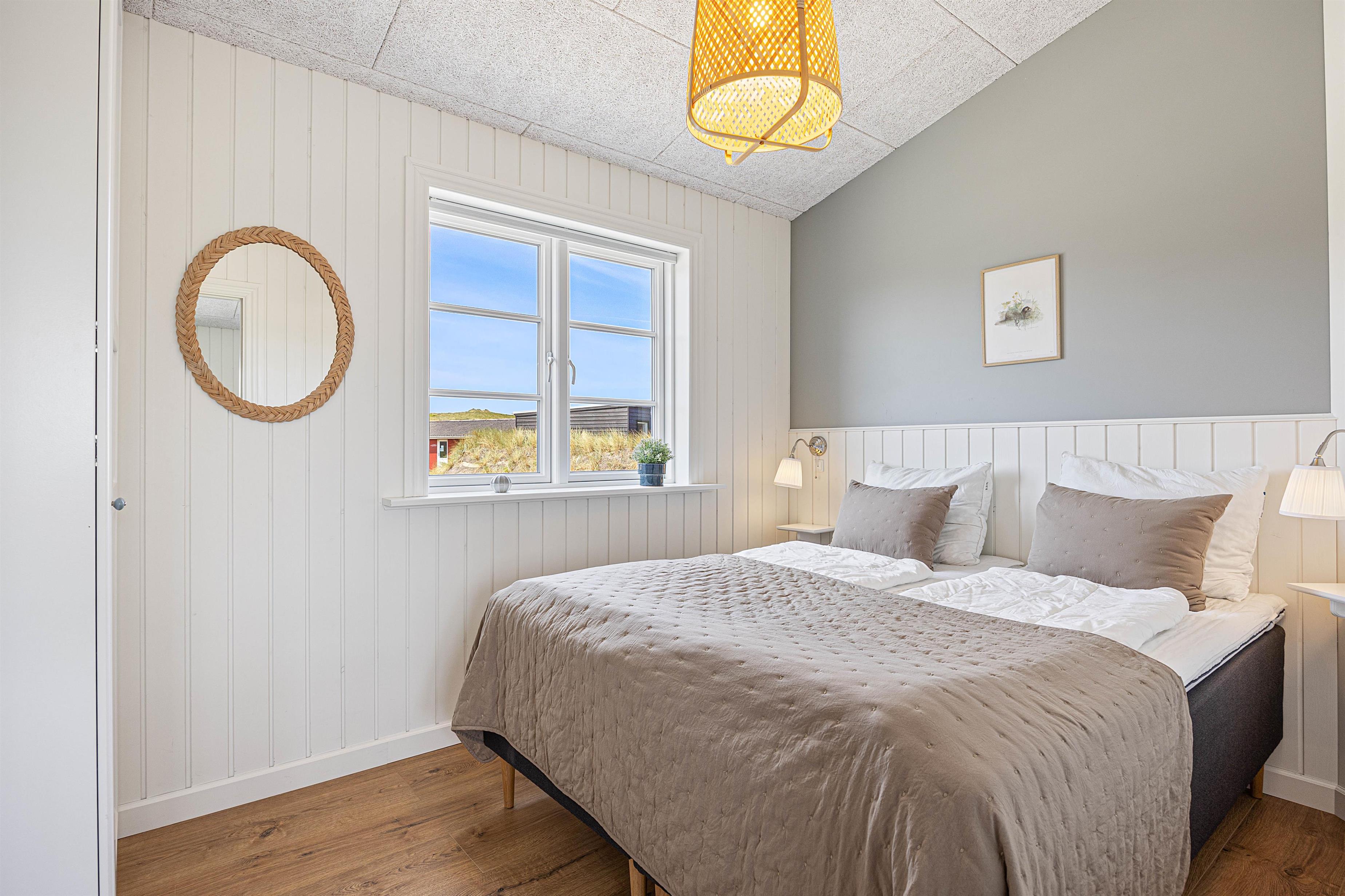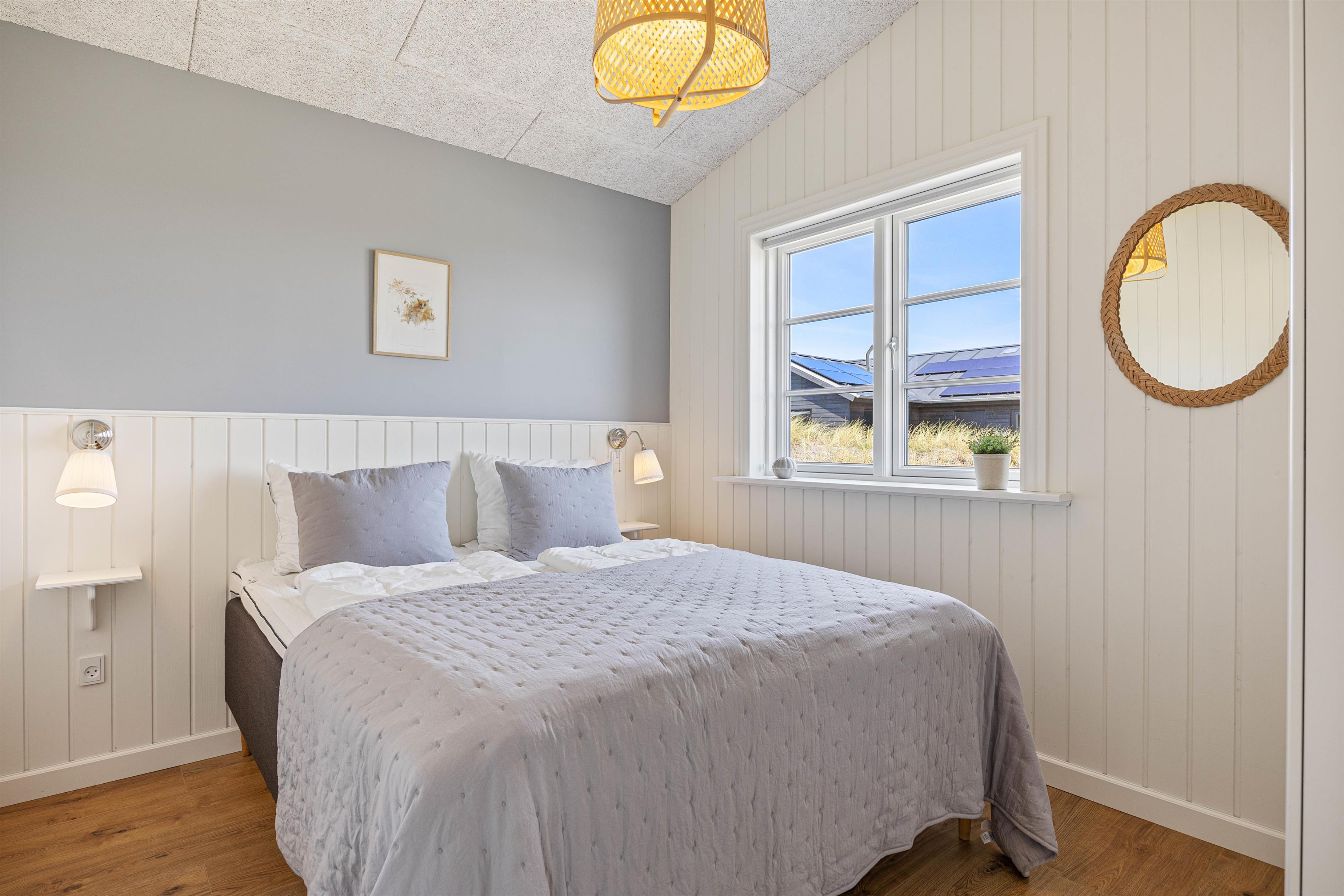 Kan I bruge en dukkert i swimmingpoolen, er den lige ved siden af. Alle aldersgrupper kan i det hele taget være aktive næsten døgnet rundt i dette feriehus, f.eks i det fine aktivitetsrum midt i feriehuset, hvor I kan få gang i energiomsætningen. Afslapning indendørs eller udendørs er også tilgængeligt, enten i de behagelige sofaer og stole eller udendørs i de komfortable møbler. I de fire soveværelser med dobbeltsenge kan I få godt udsovet i den friske vesterhavsluft. De 2 badeværelser gør, at I ikke behøver at stå i kø til morgenbadet.