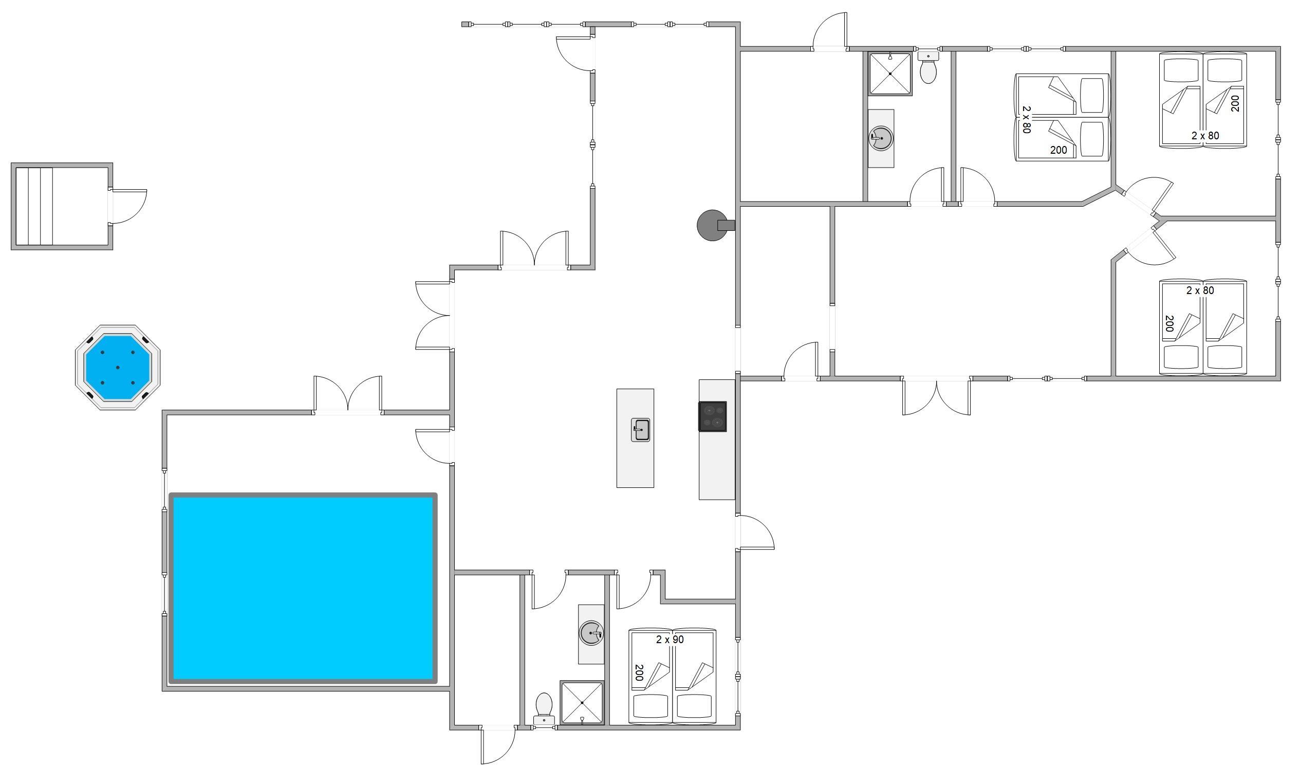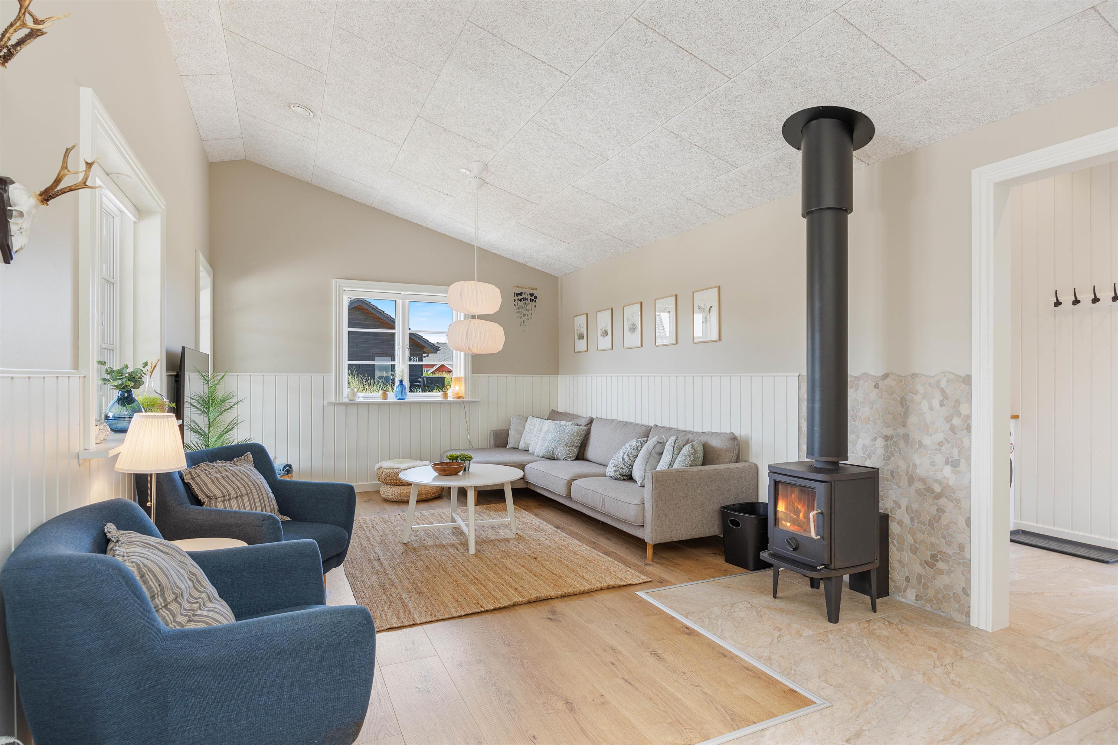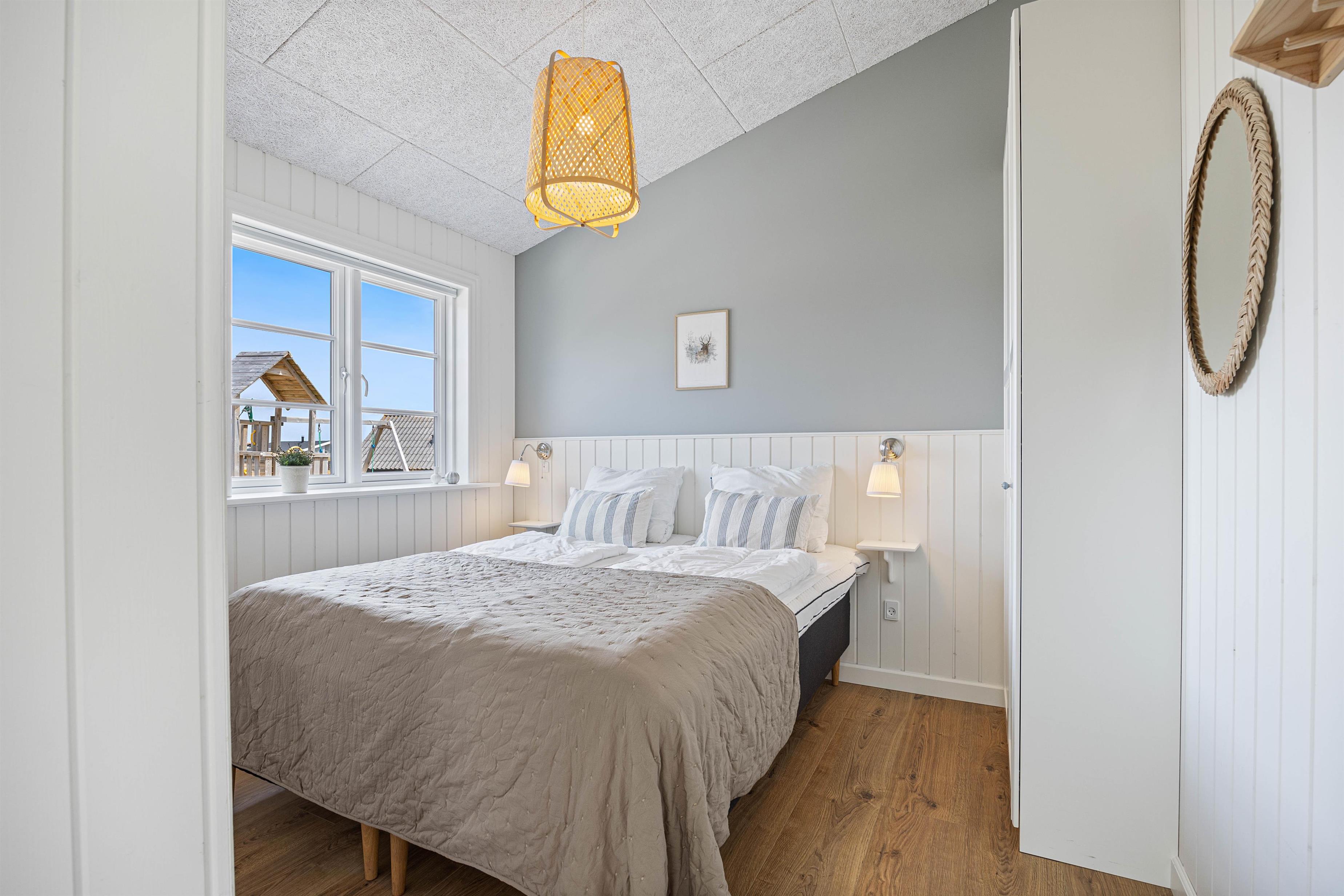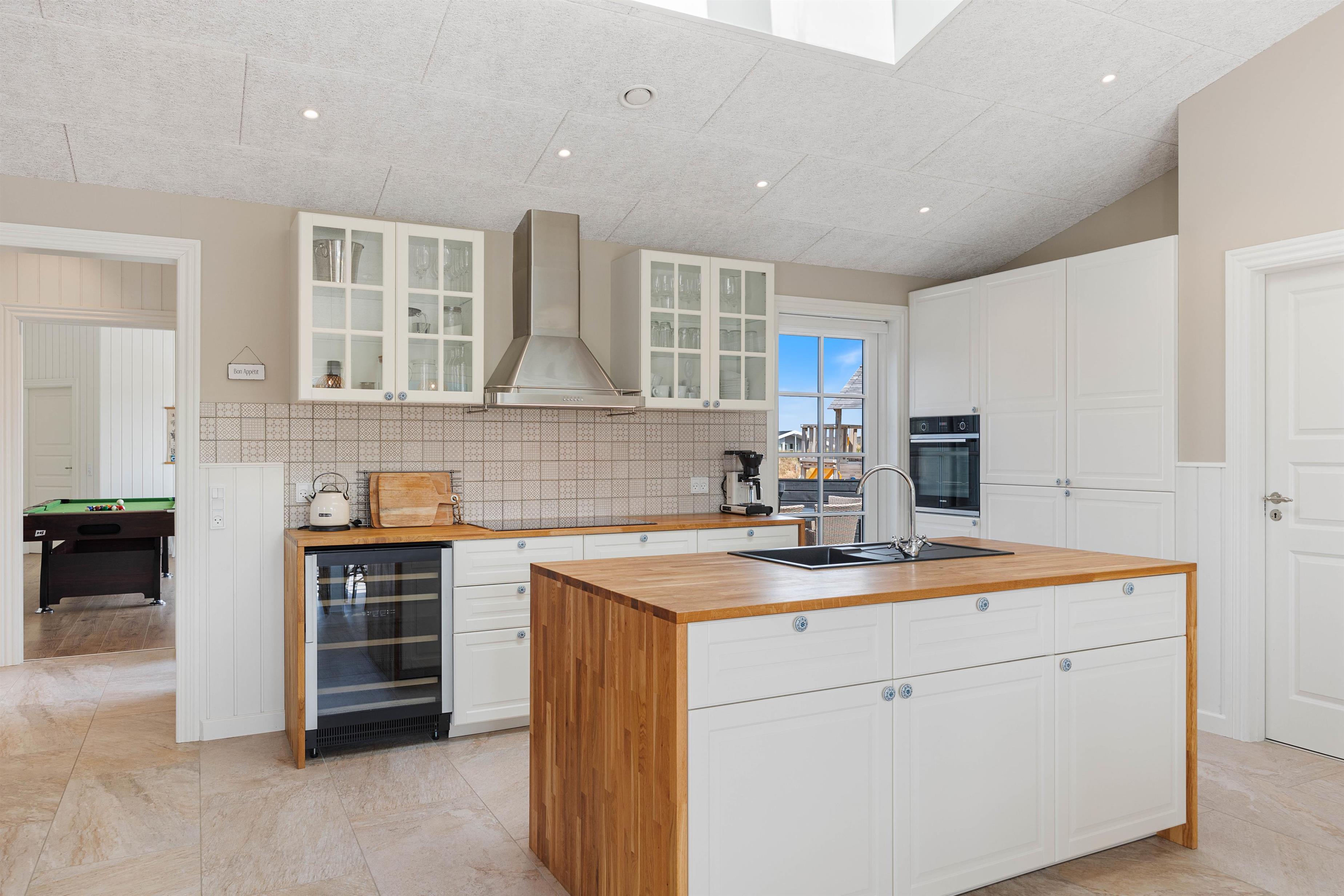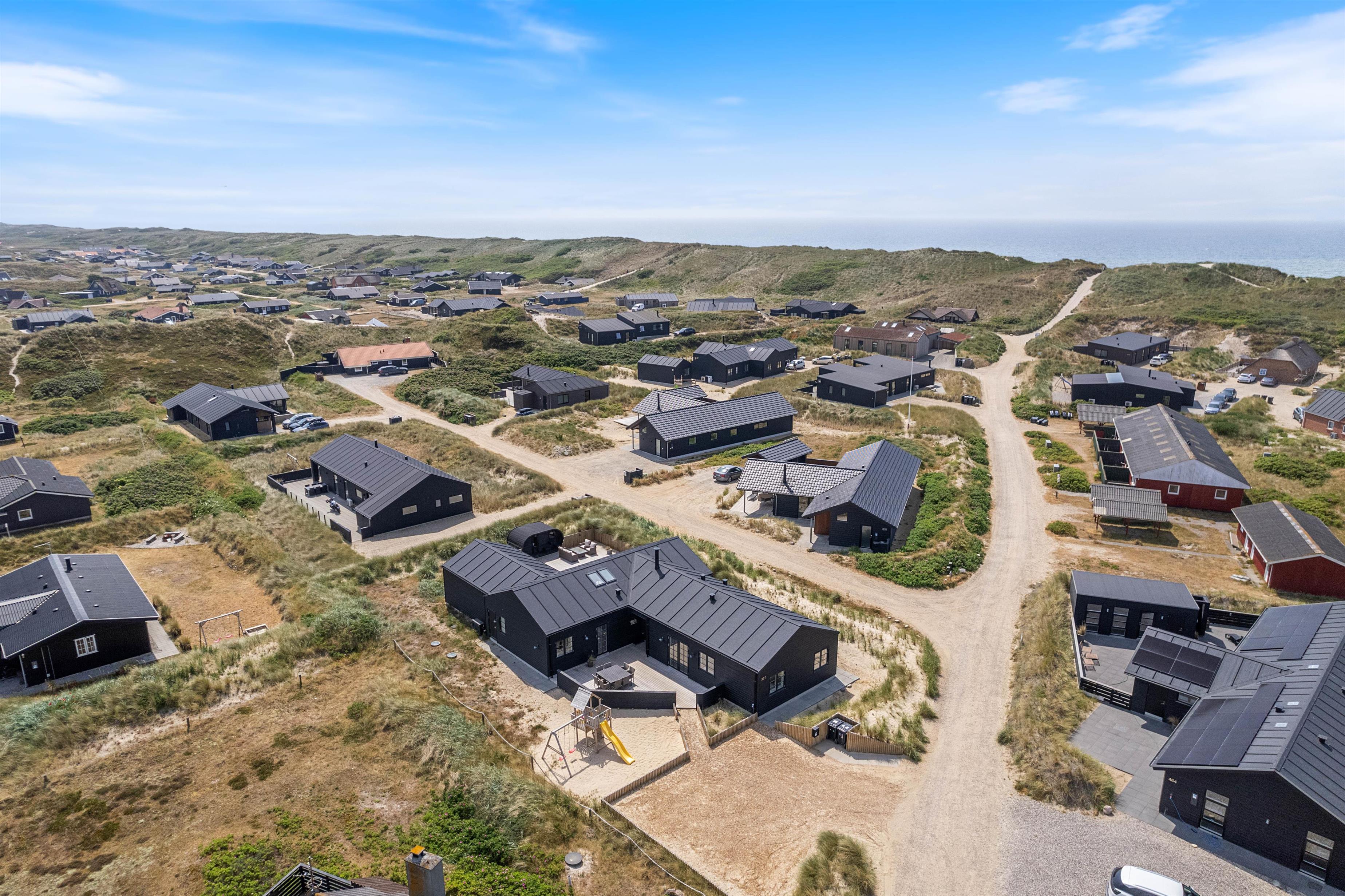 Kan I bruge en dukkert i swimmingpoolen, er den lige ved siden af. Alle aldersgrupper kan i det hele taget være aktive næsten døgnet rundt i dette feriehus, f.eks i det fine aktivitetsrum midt i feriehuset, hvor I kan få gang i energiomsætningen. Afslapning indendørs eller udendørs er også tilgængeligt, enten i de behagelige sofaer og stole eller udendørs i de komfortable møbler. I de fire soveværelser med dobbeltsenge kan I få godt udsovet i den friske vesterhavsluft. De 2 badeværelser gør, at I ikke behøver at stå i kø til morgenbadet.