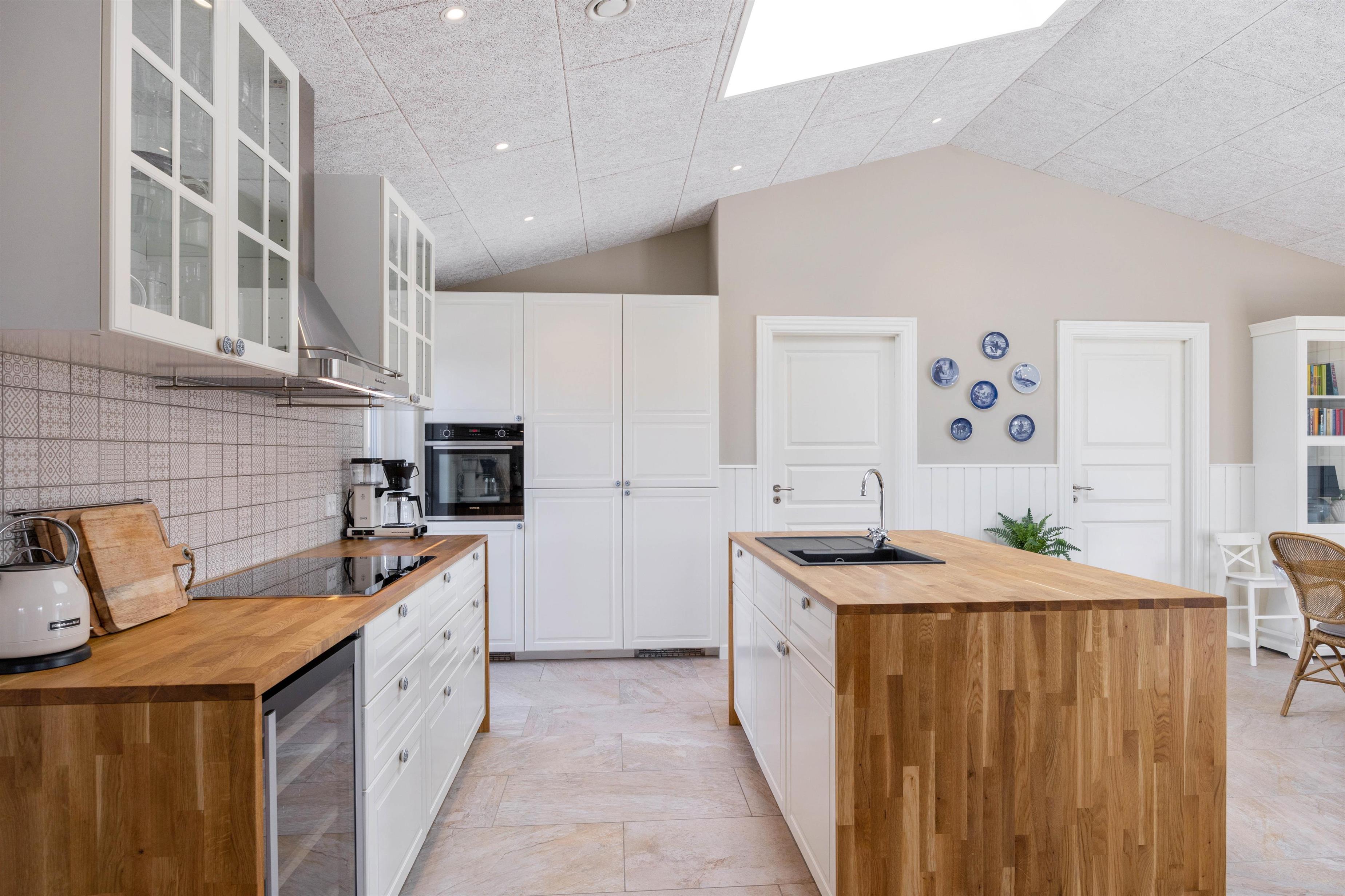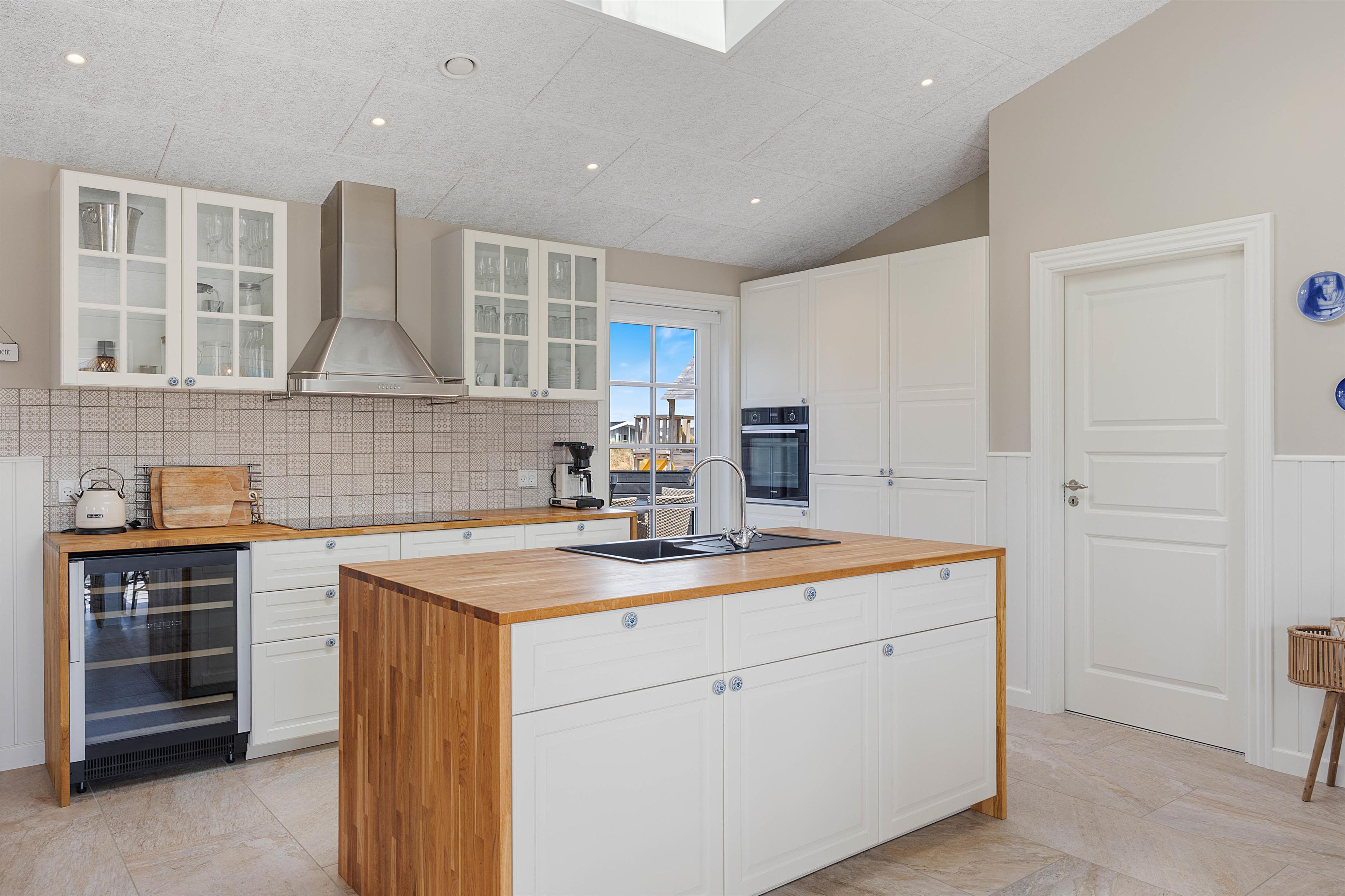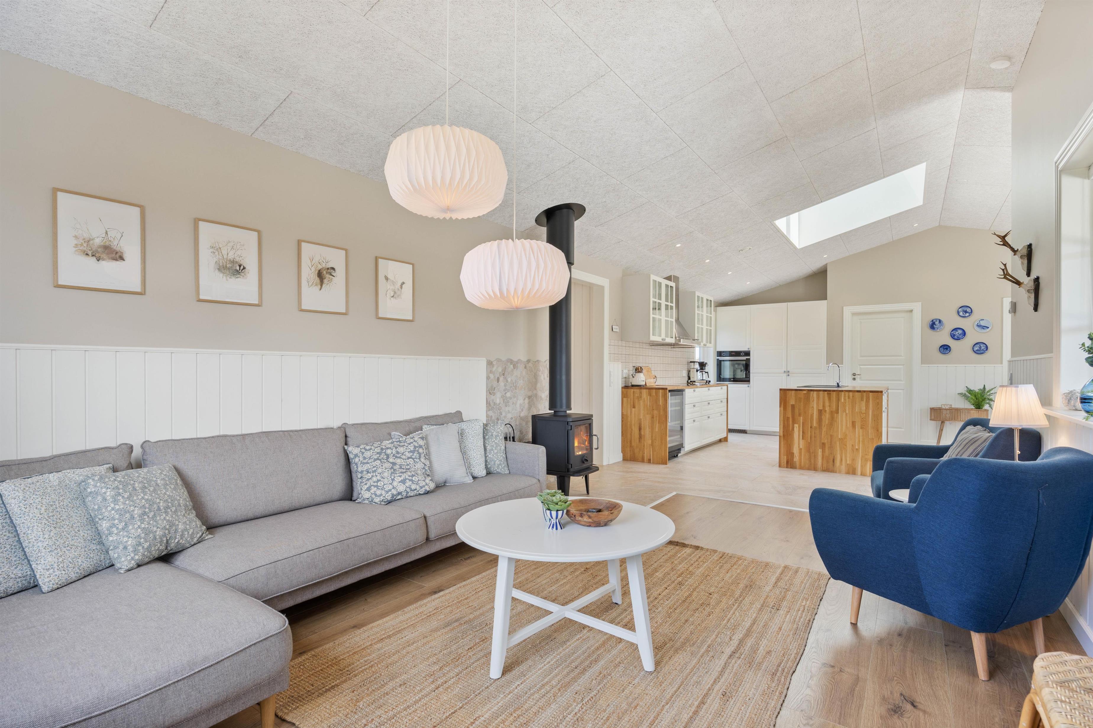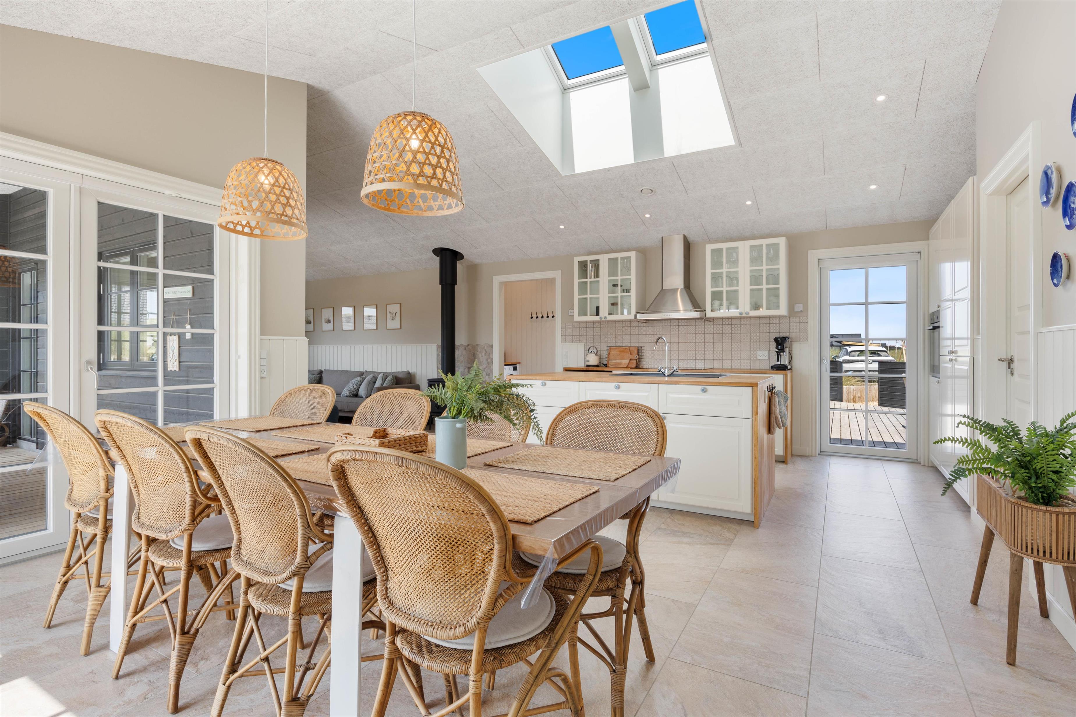 Det naturlige midtpunkt i sommerhuset på 180 m2 er det lyse og venlige køkkenalrum i forbindelse med stuen med brændeovn. I det åbne køkken finder I alle faciliteter til at frembringe lækre måltider – eventuelt egnsretter. Her kan I have mange hyggelige stunder i køkkenet, omkring spisebordet eller i stuen foran brændeovnen.