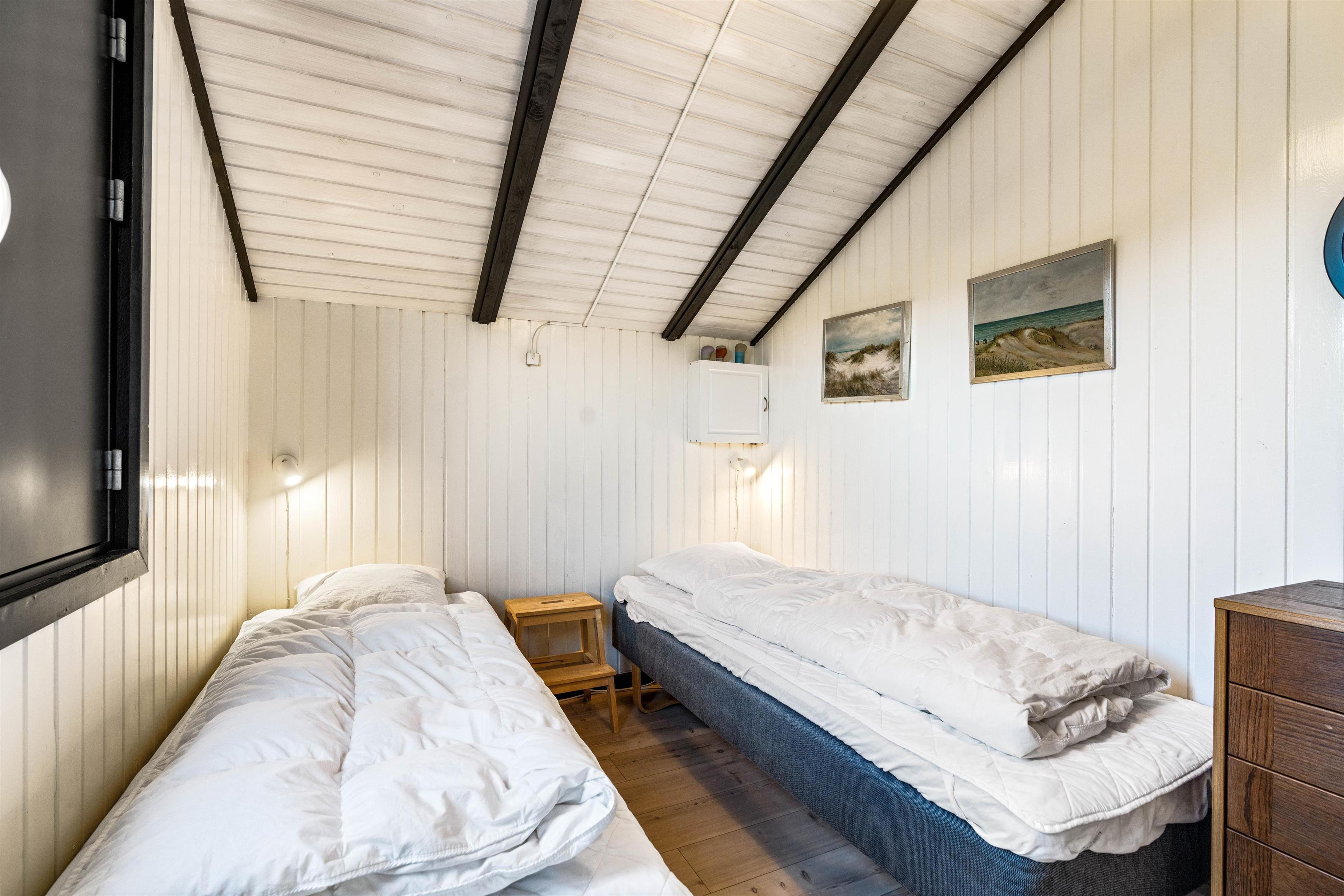 Sommerhuset er indrettet med 2 gode soveværelser, begge med dobbeltseng. I det ene værelse kan sengene også skilles ad, så man får 2 enkelte senge. Pænt badeværelse med bruseniche. Nyere køkken i åben forbindelse med den hyggelige stue. Stuen er indrettet med gode møbler, trægulve og fladskærm. I huset er der installeret en energibesparende varmepumpe, og gratis trådløst internet.