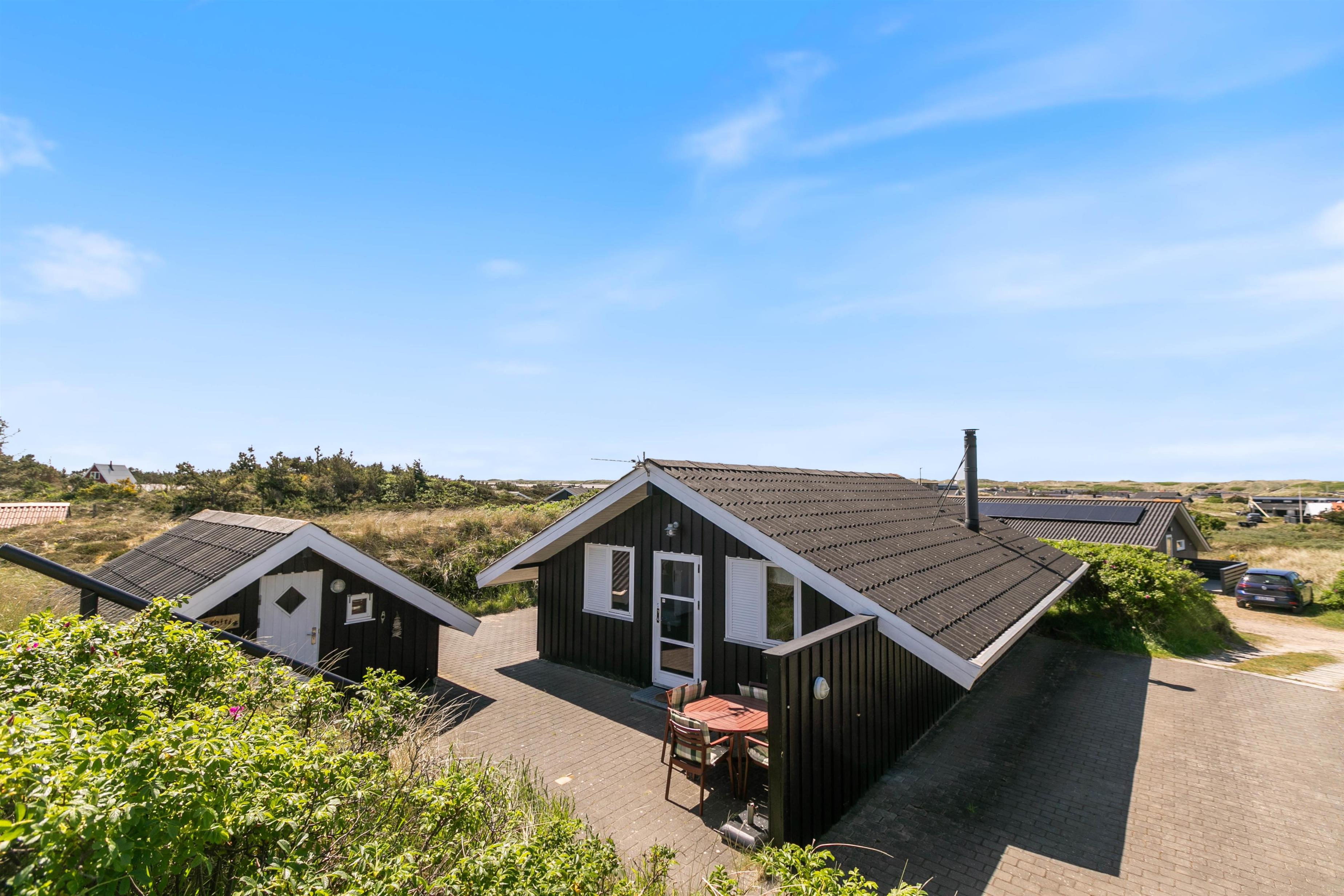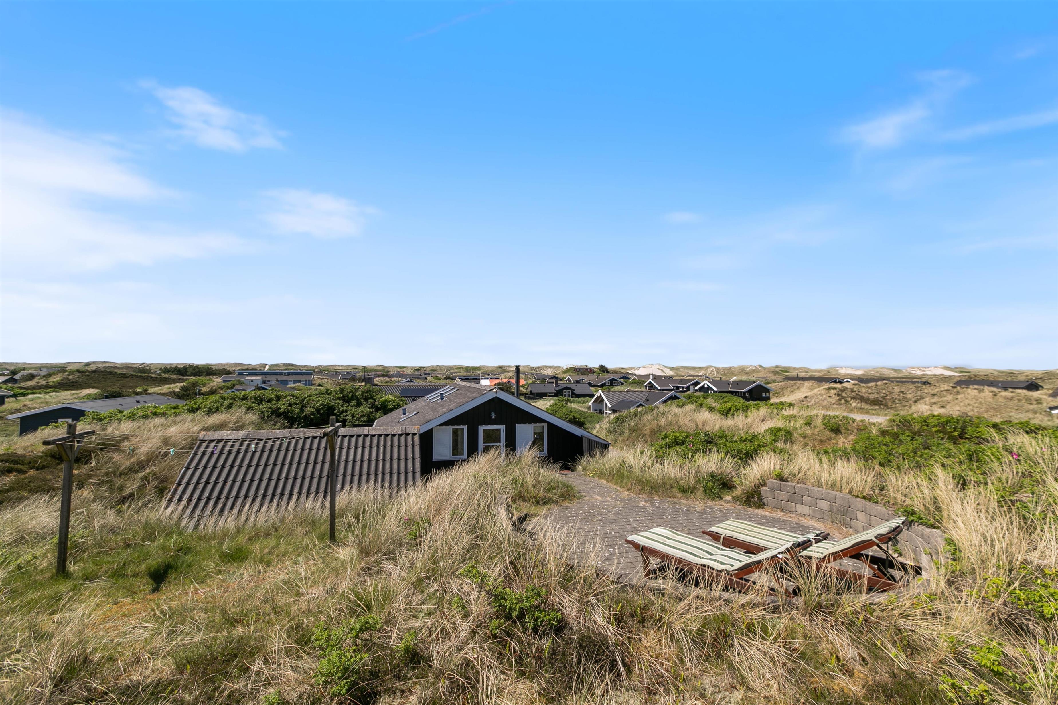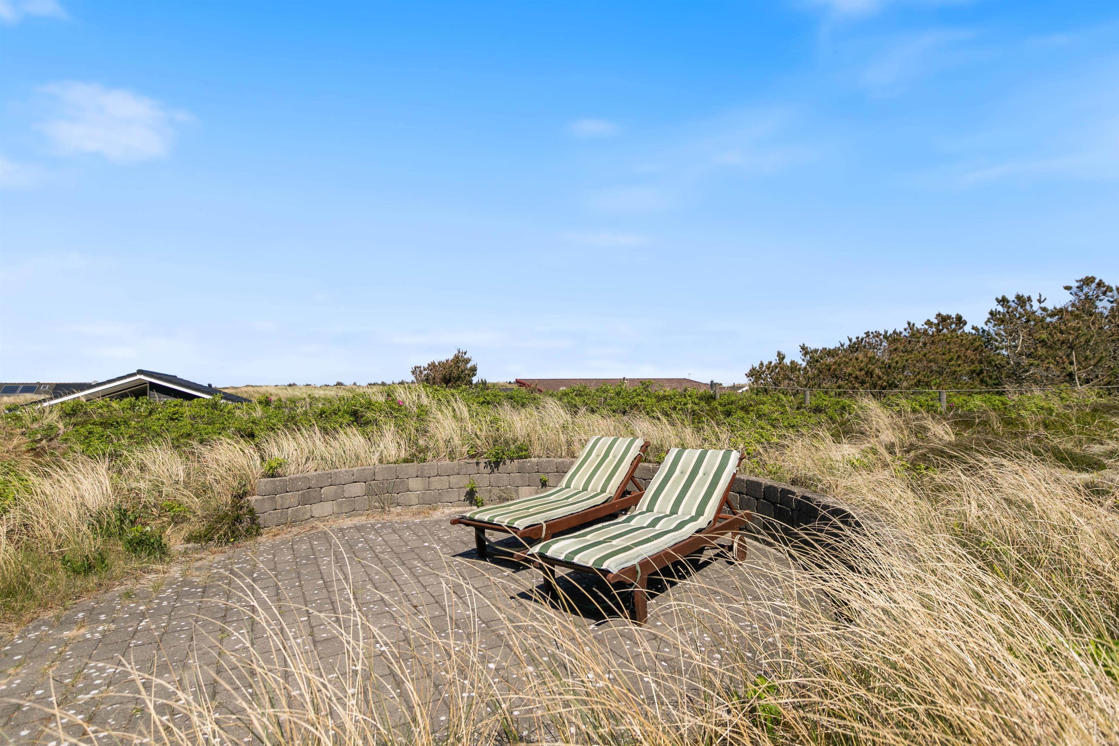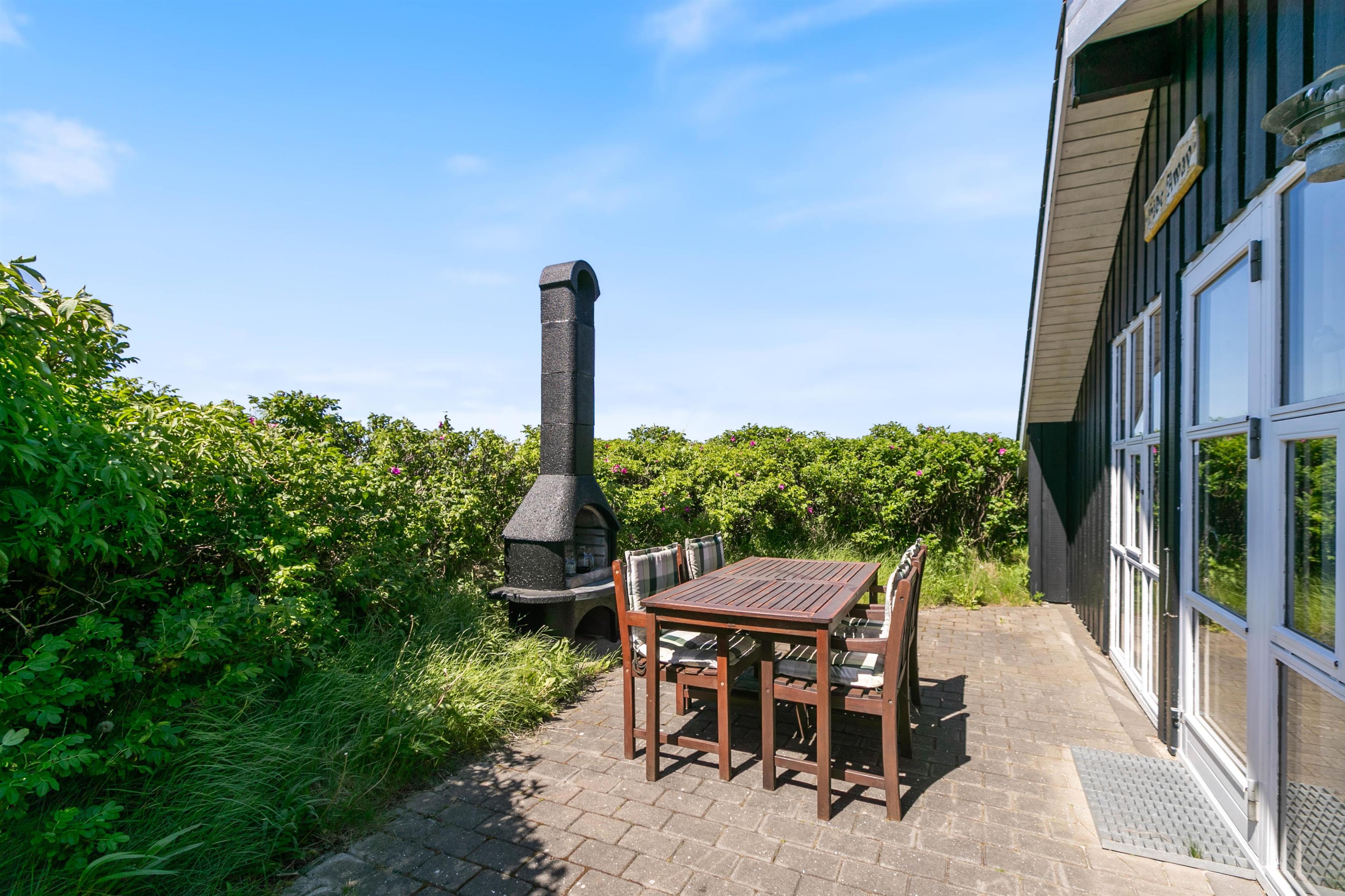 Rundt om sommerhuset er der flere dejlige terrasser med gode læforhold. Her står komfortable havemøbler, liggestole og en grill klar til hyggelige stunder under åben himmel. Mod syd findes en overdækket del, hvor du kan sidde ude selv på dage med lidt vind eller småregn. På toppen af klitten bag sommerhuset ligger en lille udsigtsterrasse, hvorfra du kan nyde panoramaudsigten over området, klitterne, heden og fjorden i det fjerne.