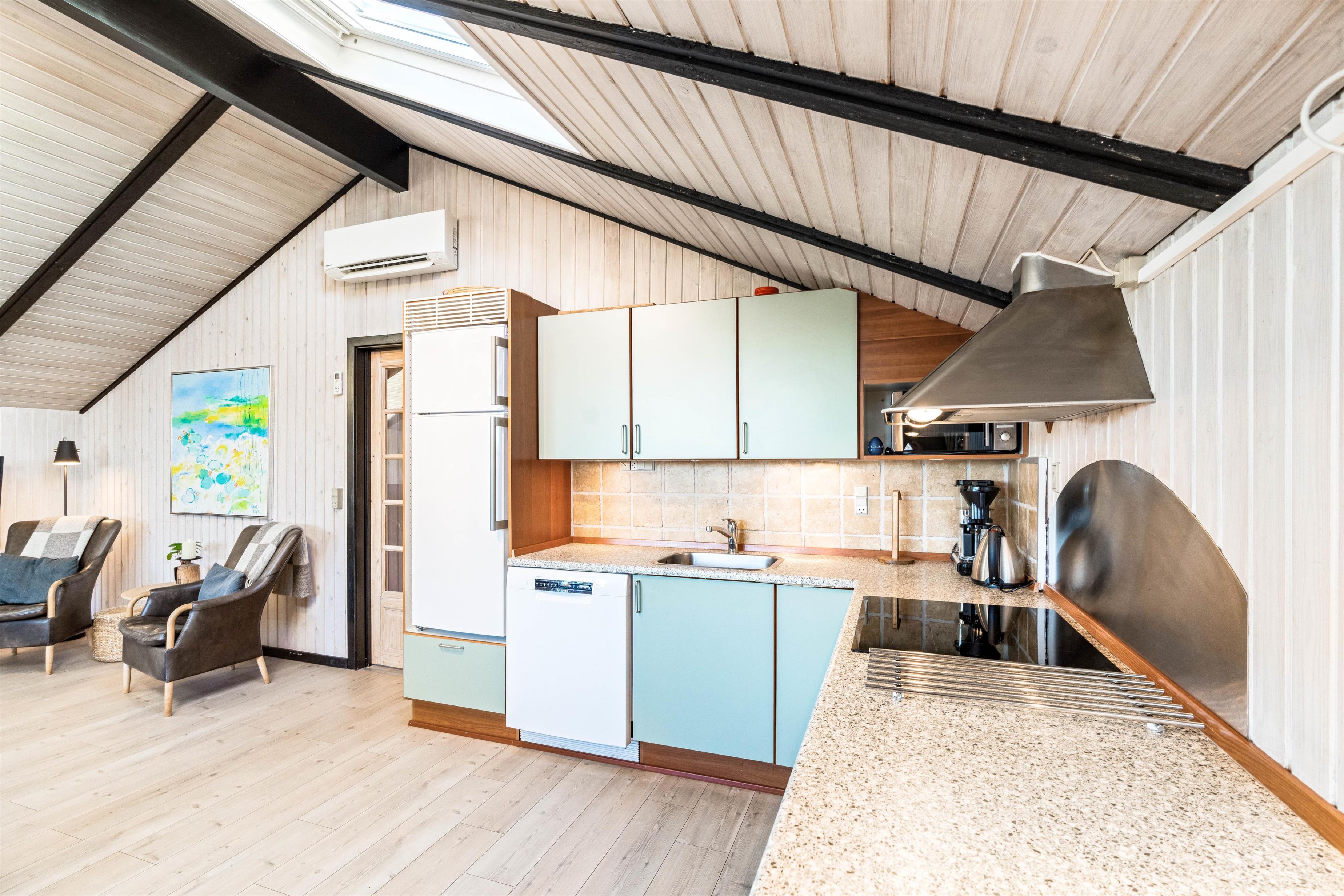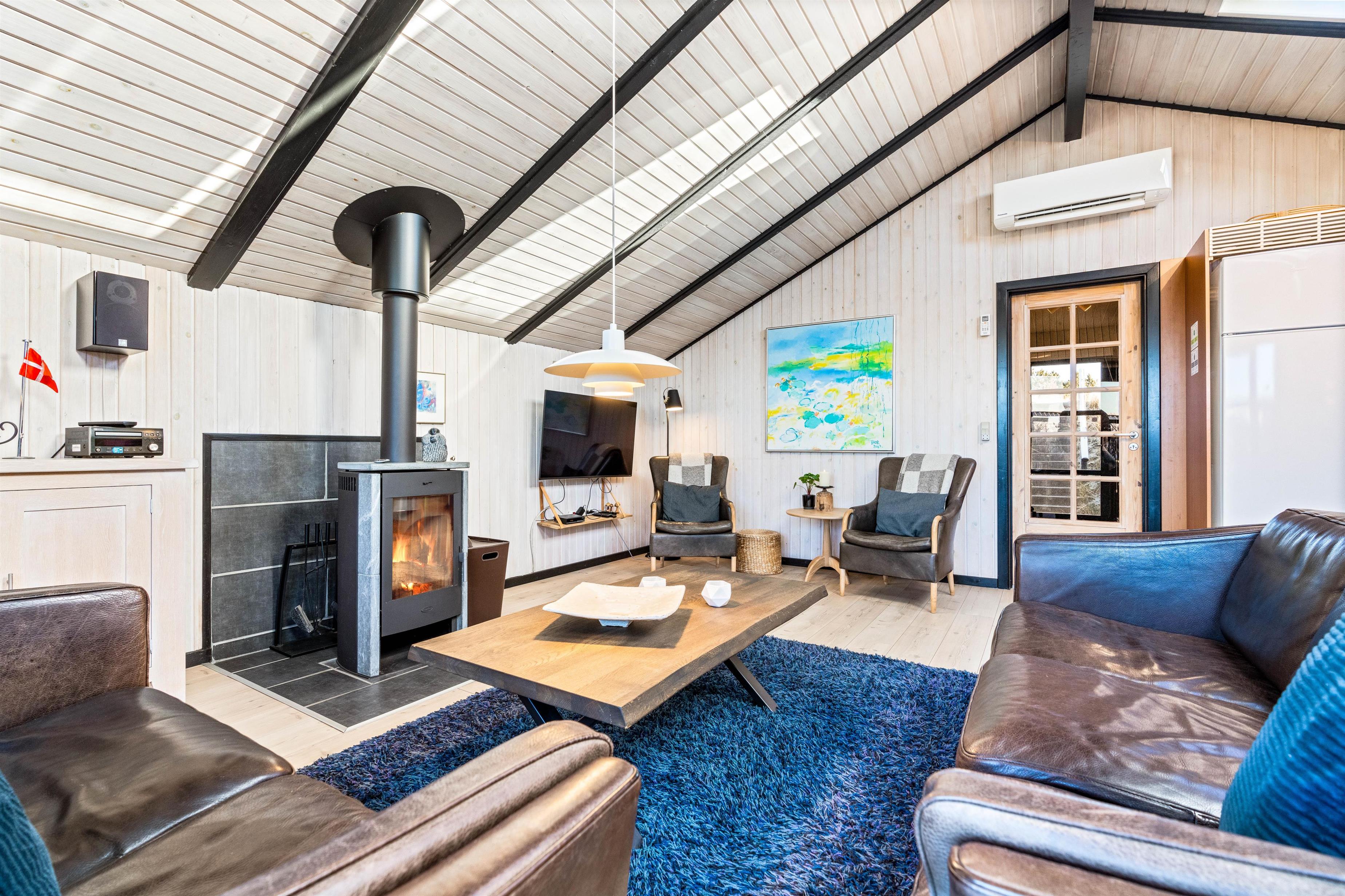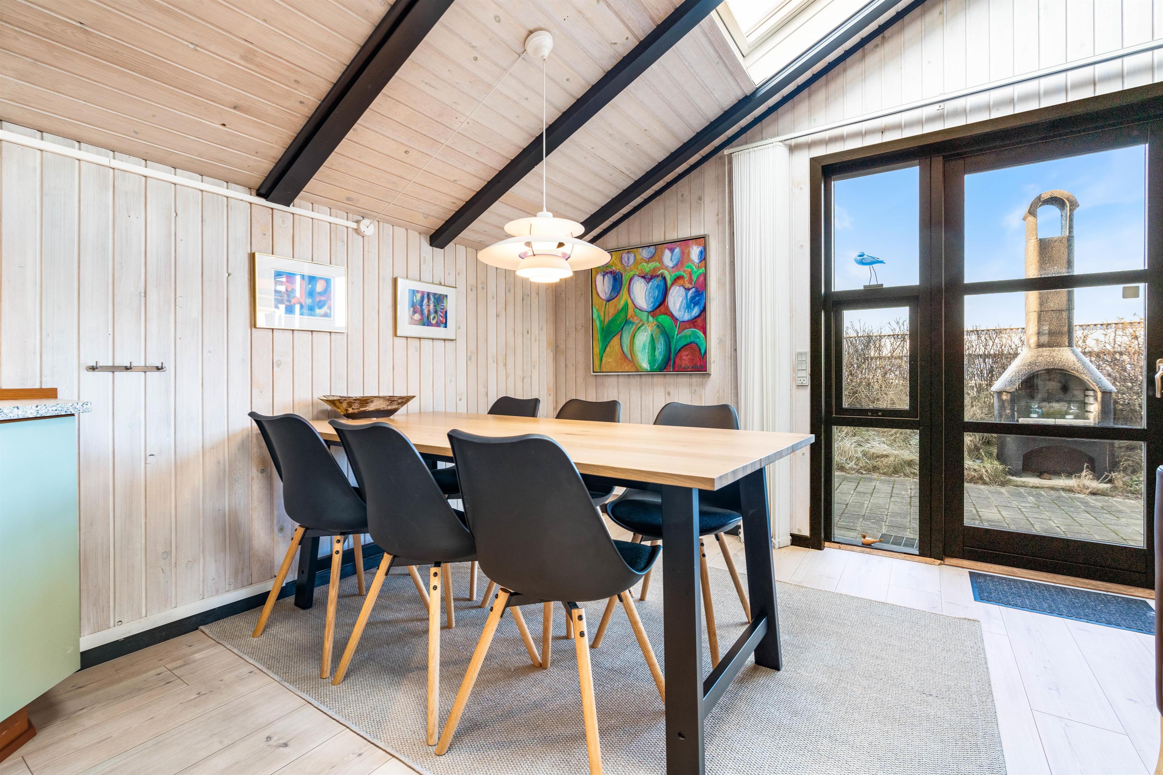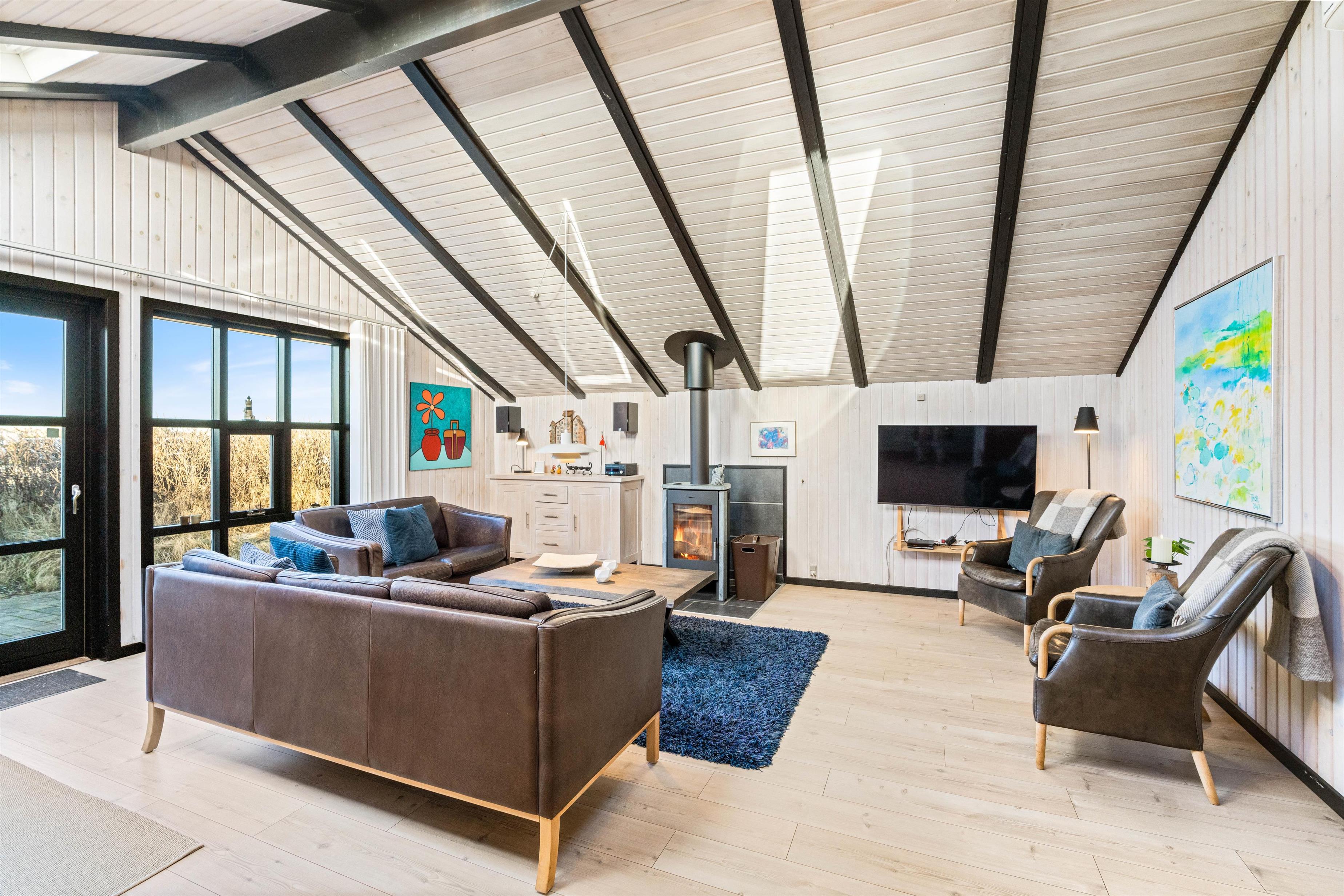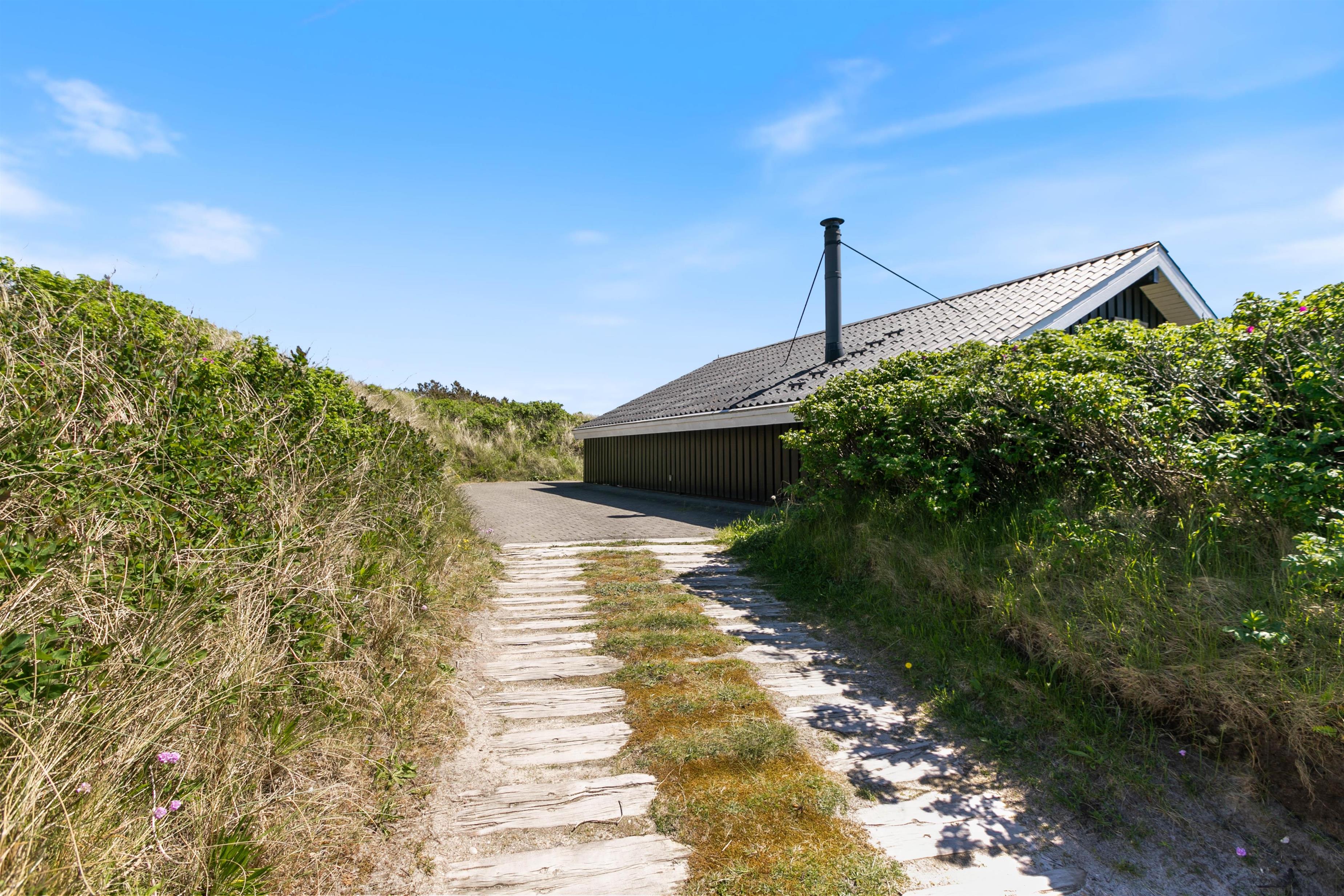 Rundt om sommerhuset er der flere dejlige terrasser med gode læforhold. Her står komfortable havemøbler, liggestole og en grill klar til hyggelige stunder under åben himmel. Mod syd findes en overdækket del, hvor du kan sidde ude selv på dage med lidt vind eller småregn. På toppen af klitten bag sommerhuset ligger en lille udsigtsterrasse, hvorfra du kan nyde panoramaudsigten over området, klitterne, heden og fjorden i det fjerne.