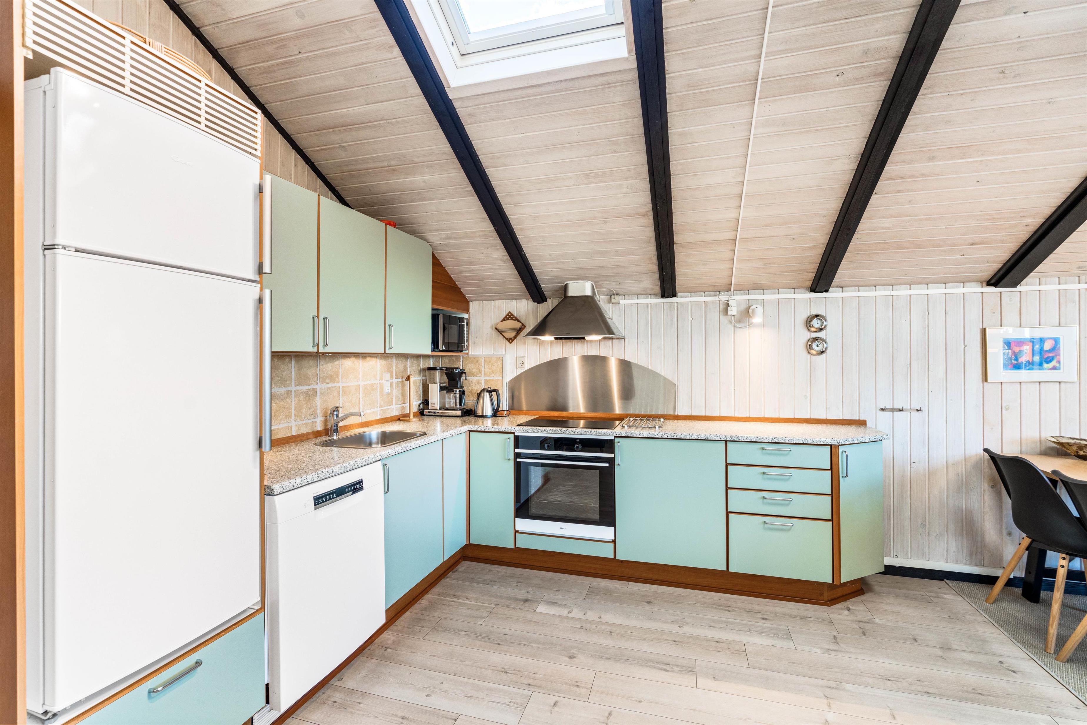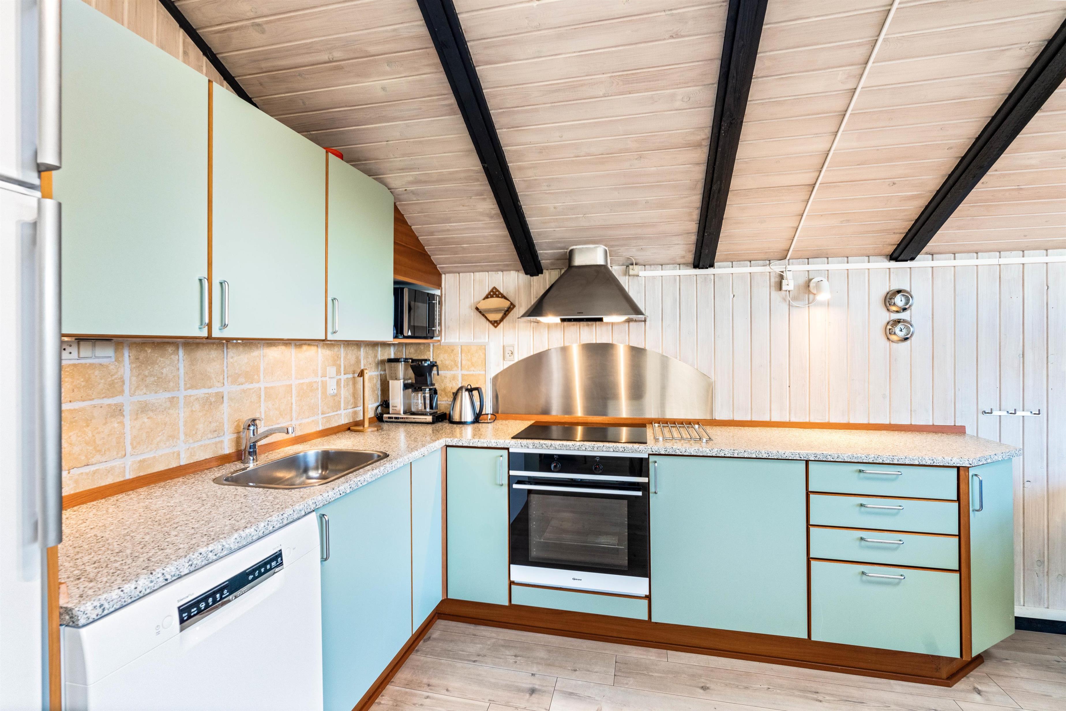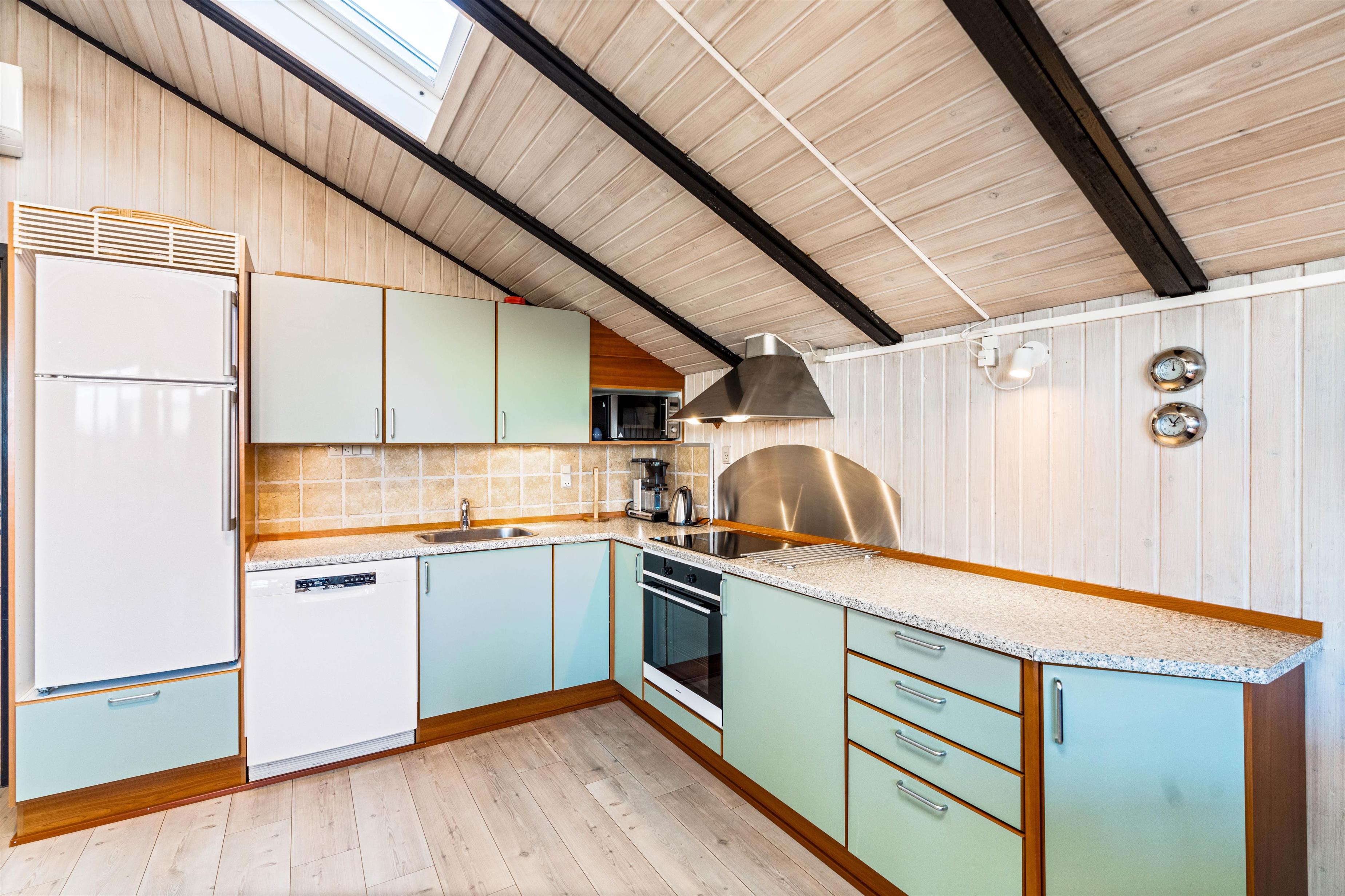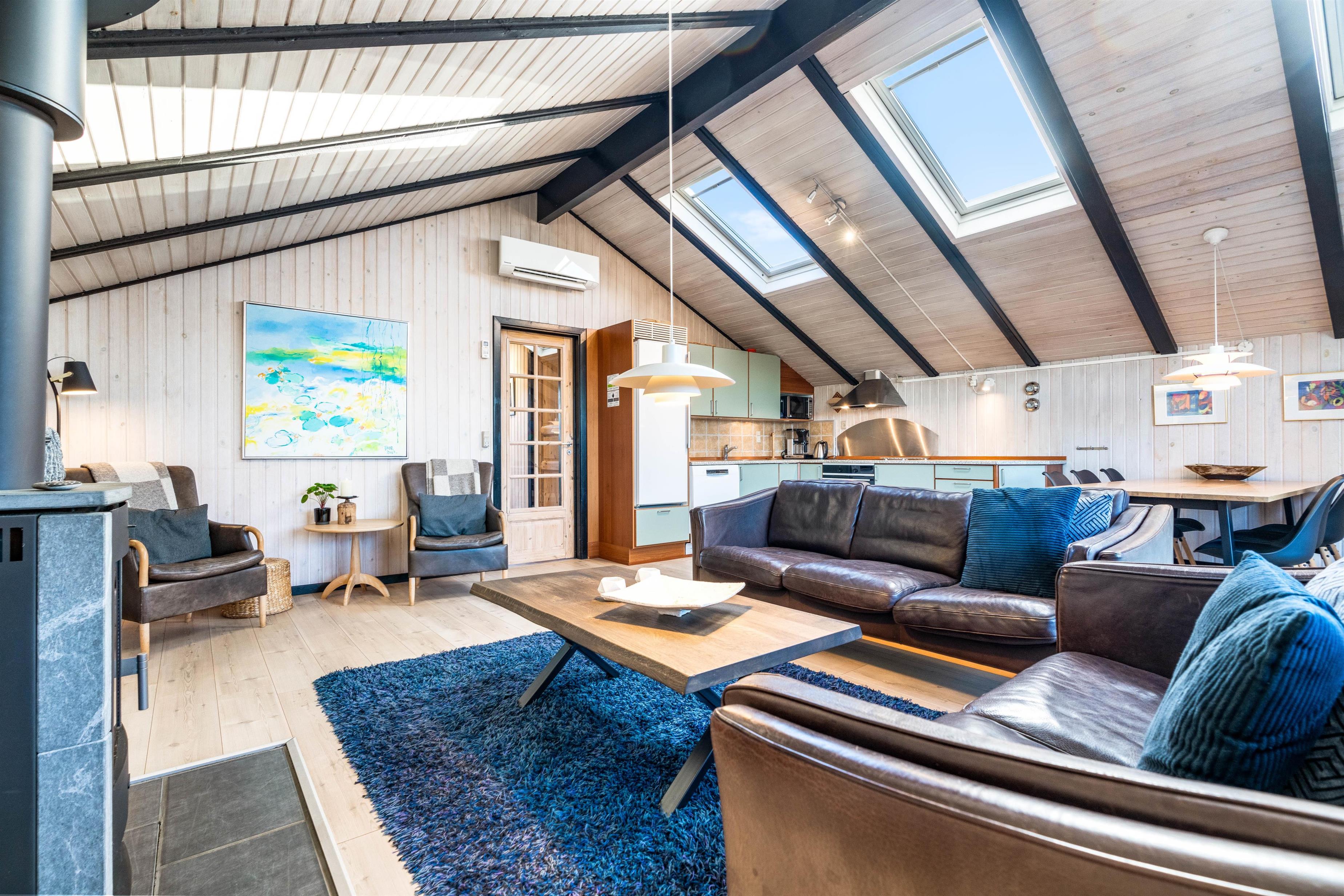 Rundt om sommerhuset er der flere dejlige terrasser med gode læforhold. Her står komfortable havemøbler, liggestole og en grill klar til hyggelige stunder under åben himmel. Mod syd findes en overdækket del, hvor du kan sidde ude selv på dage med lidt vind eller småregn. På toppen af klitten bag sommerhuset ligger en lille udsigtsterrasse, hvorfra du kan nyde panoramaudsigten over området, klitterne, heden og fjorden i det fjerne.