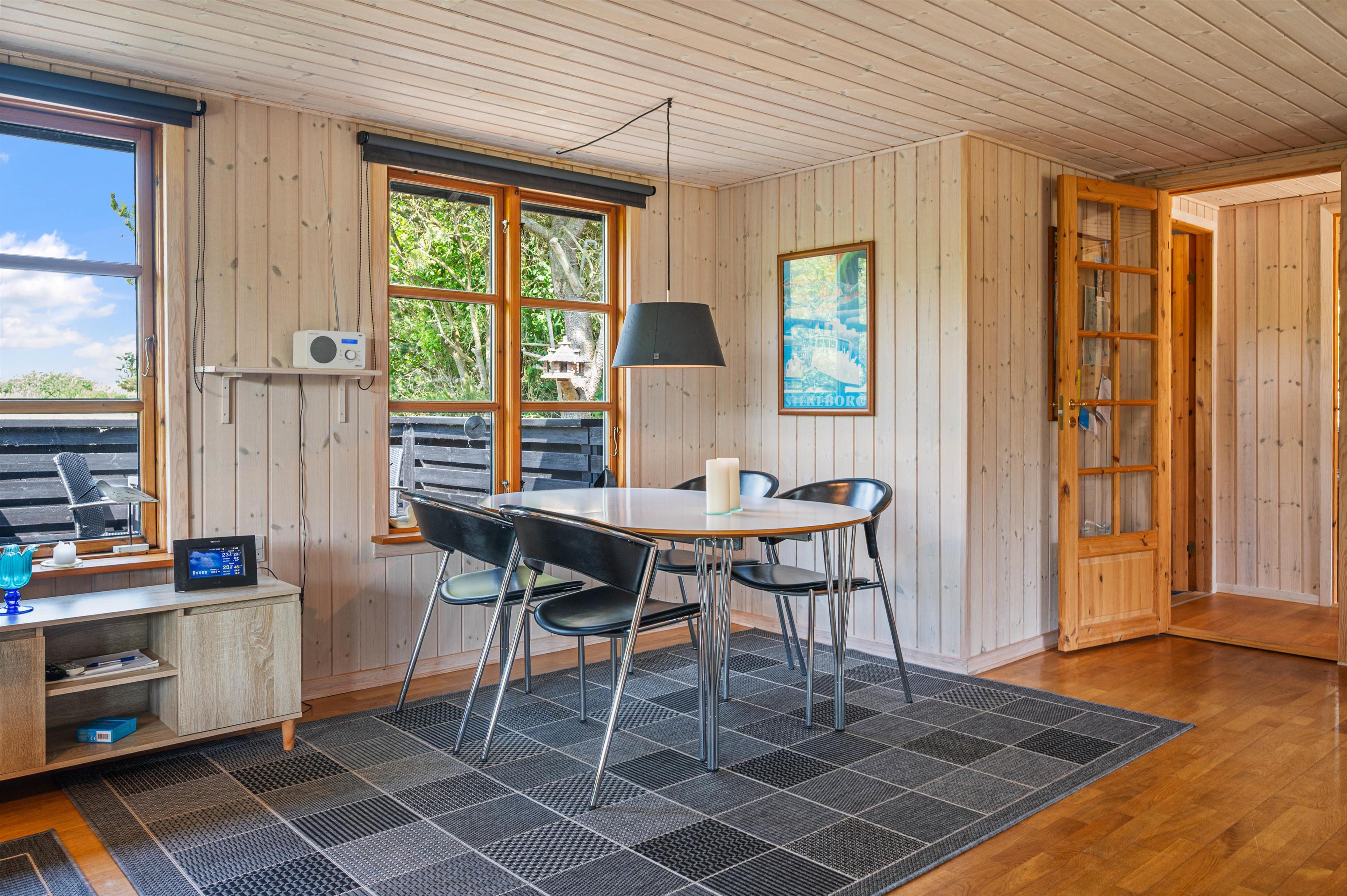 Centrum i det charmerende feriehus bliver helt naturligt opholdsstuen, som er indrettet med et vedligeholdelsesvenligt trægulv og behagelige siddepladser. Hygge foran brændeovnen på kølige aftener, læs en bog eller nyd et glas vin, mens brændeknuderne knitrer i baggrunden. Du kan også bruge den energibesparende varmepumpe til hurtigt at få feriehuset op på en hyggelig temperatur.