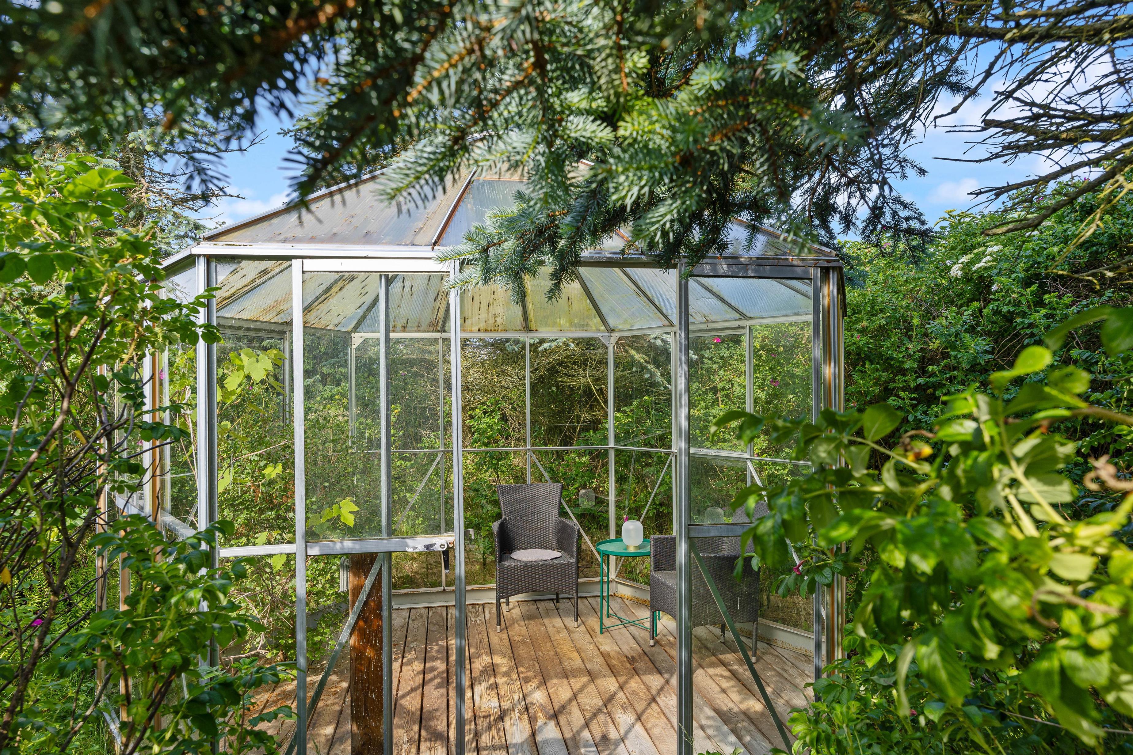 Vest for feriehuset finder I en lille havepavillon. Her har I mulighed for at nyde naturen, selvom vinden er lidt skarp, og derfor er den helt perfekt i for- og efteråret.