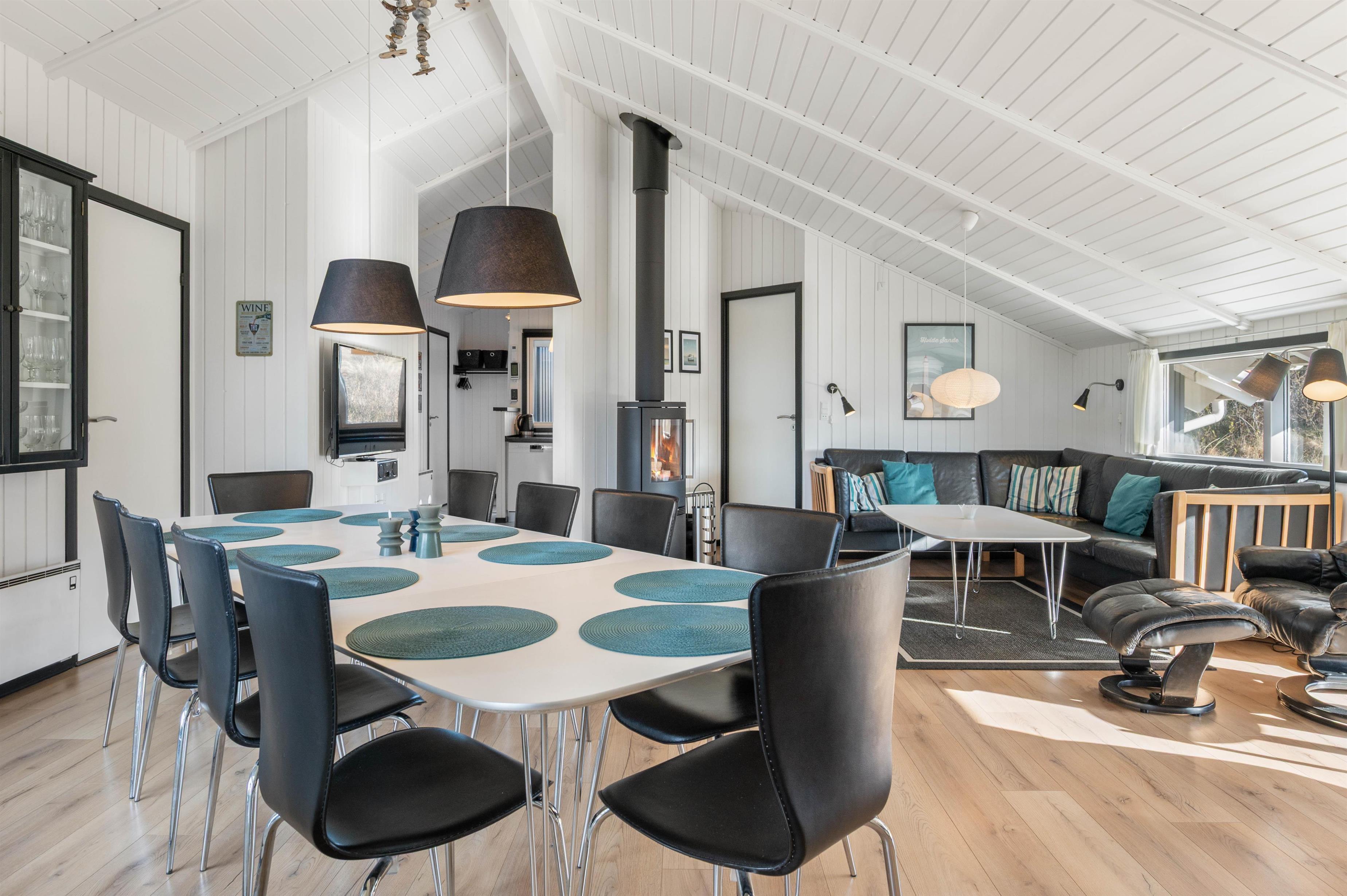 Stuen er stor nok til, at I alle kan sidde foran brændeovnen og se en god film. Og med det gode, åbne køkken er der også sørget for, at I kan hjælpes ad og hygge jer med madlavningen, mens børnene surfer på internettet eller leger ude på grunden med de opstillede gynger og sandkasse.