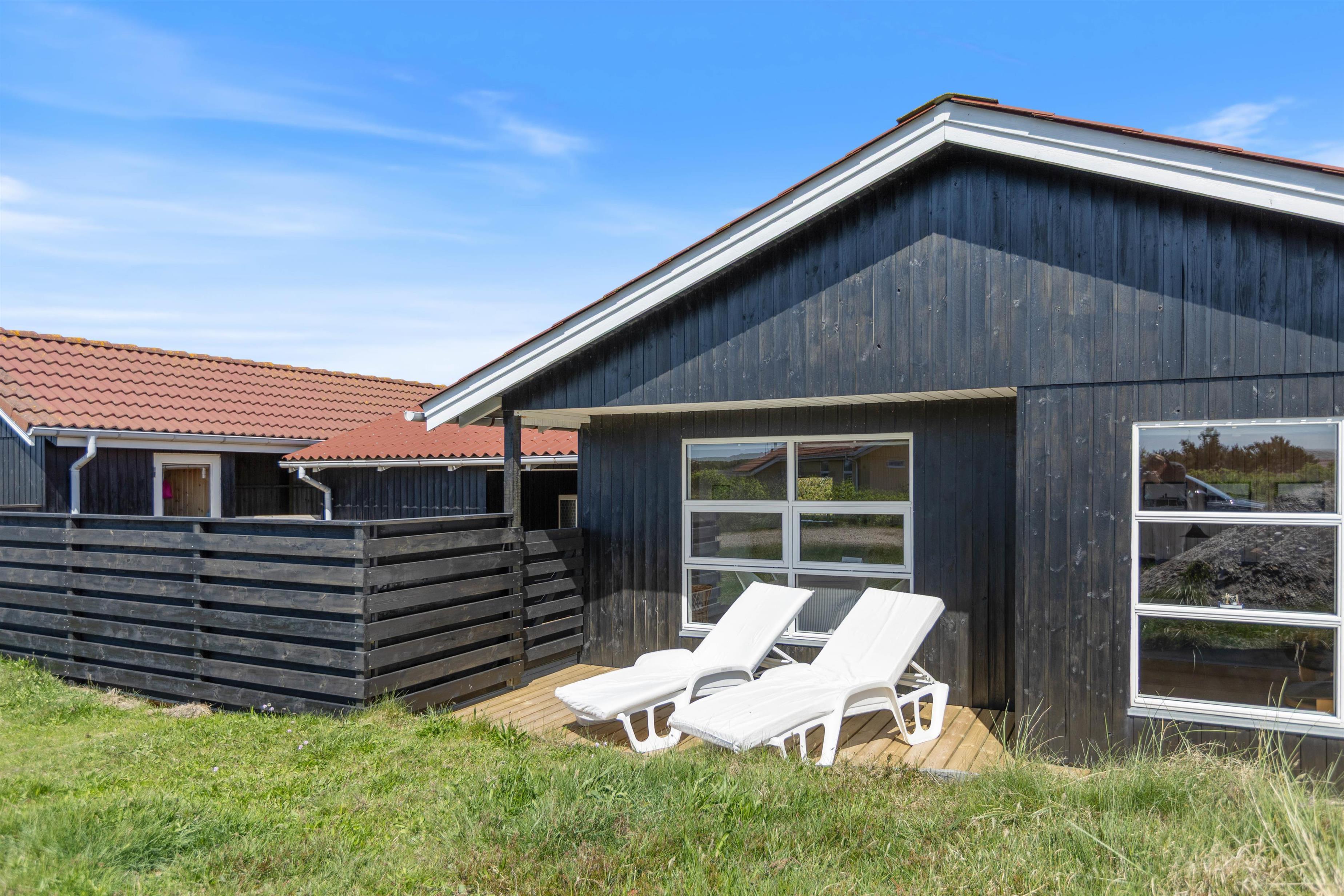 Feriehuset har flere terrasser omkring sommerhuset. Her kan I spise morgenmad på den østlige terrasse om morgenen og starte grillen på den vestlige terrasse om aftenen, hvorfra I kan se solnedgangen bag klitterne. På terrassen er der rig mulighed for at finde læ, da terrassen både er afskærmet og delvist overdækket.