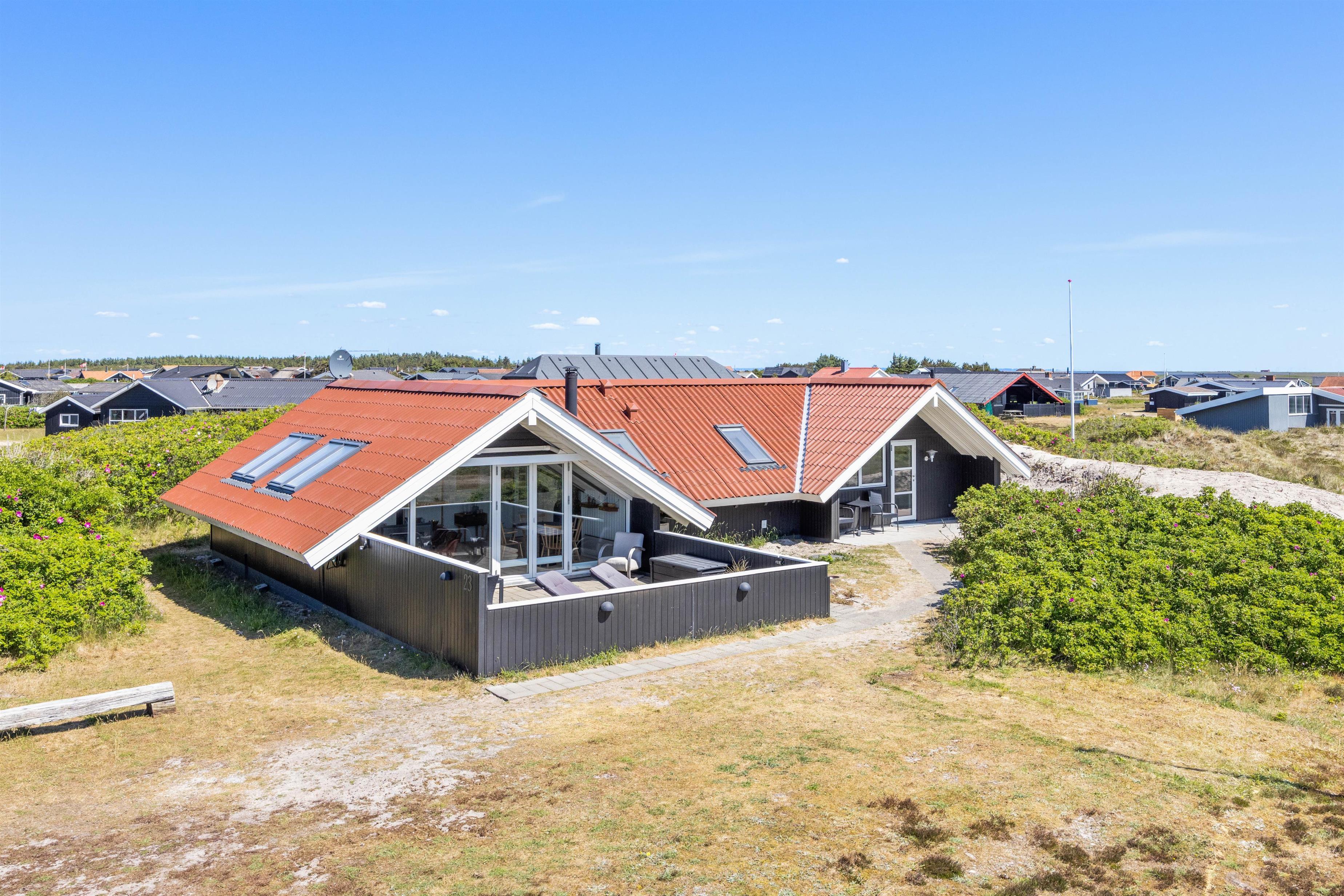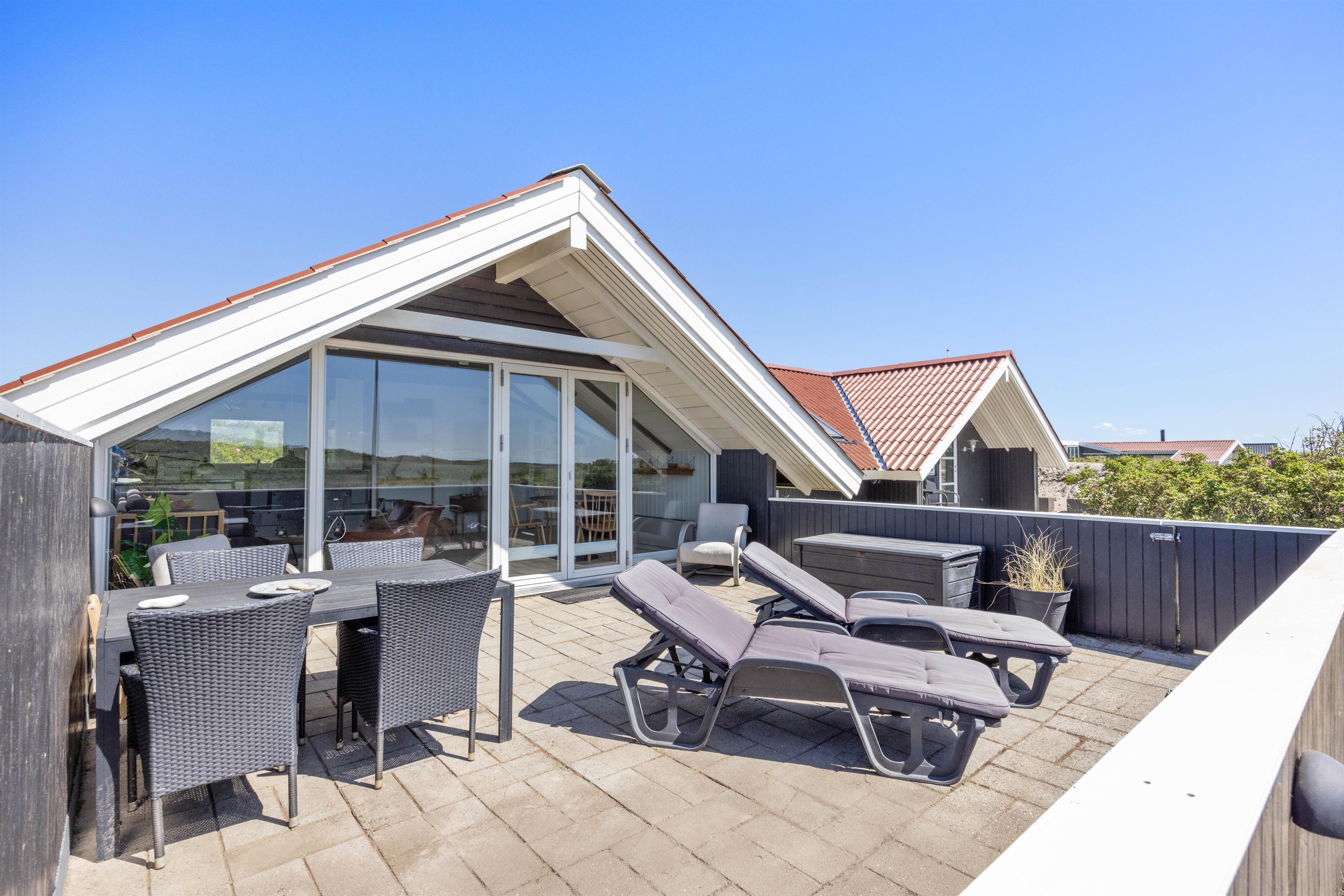 En hyggelig og lukket terrasse mod syd indbyder til masser af udendørs aktivitet. Her kan man nyde morgenkaffen til solopgangen over Ringkøbing Fjord mod øst – og senere kan man nyde solnedgangen over klitterne og Vesterhavet mod vest, måske sammen med en veltilberedt grillmiddag – og med havets beroligende brusen i baggrunden.