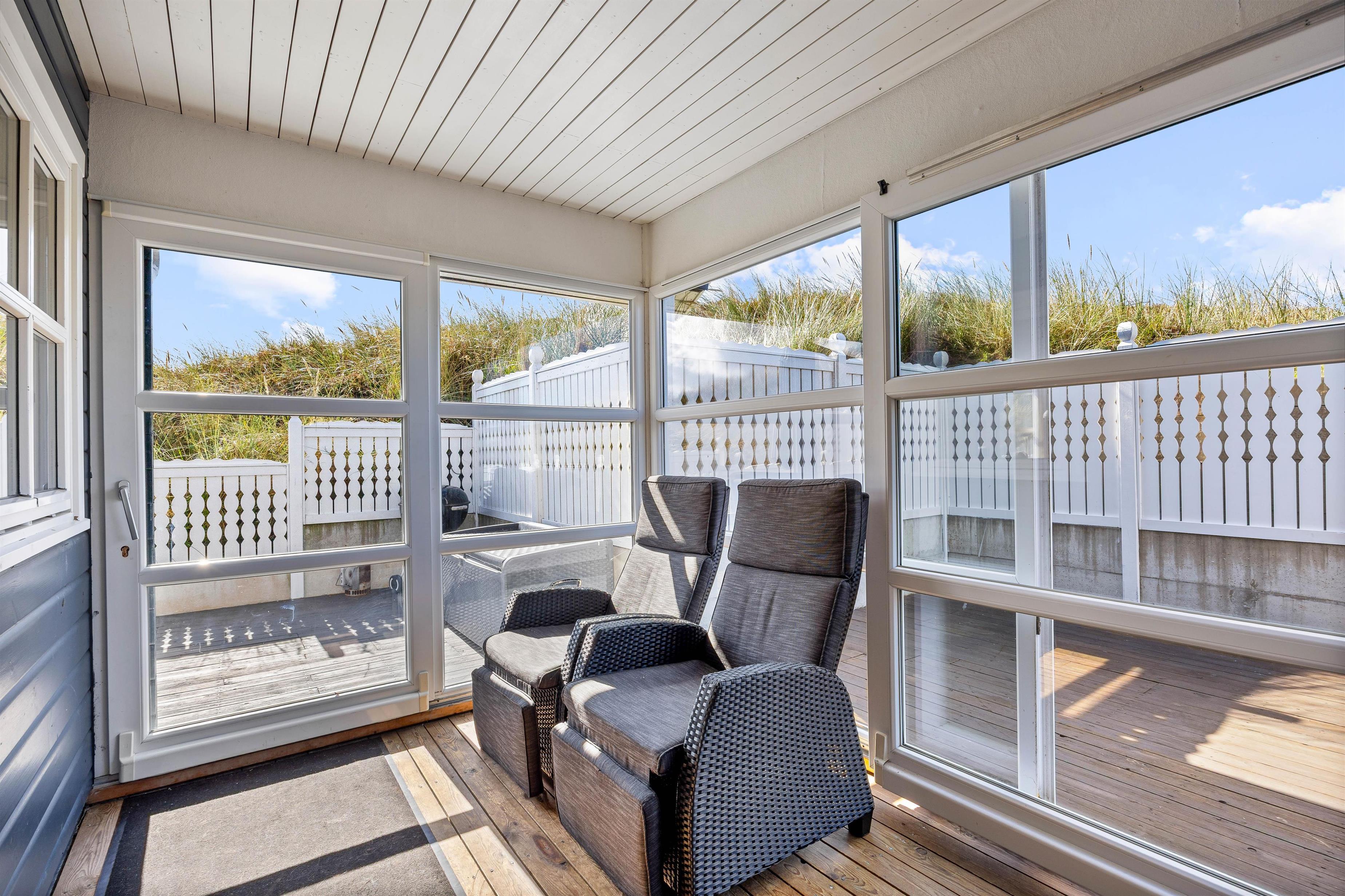 På den skønne, lukkede terrasse kan I uforstyrret kan nyde morgenkaffen og hyggelige grillaftener. En del af terrassen er overdækket, så selv i det til tider drilske danske sommervejr kan I sidde ude og nyde den friske vesterhavsluft. Fra terrassen har I en flot udsigt til de marehalmsklædte klitter, der kendetegner naturen ved Vesterhavet.