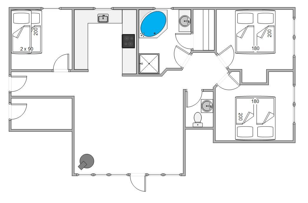 Badeværelset med gulvvarme er indrettet med en sauna og et boblebad, hvor I kan nyde en afslappende stund efter en oplevelsesrig feriedag. Toilettet er praktisk placeret i et rum for sig selv. I sommerhuset er der desuden vaskemaskine og tørretumbler.