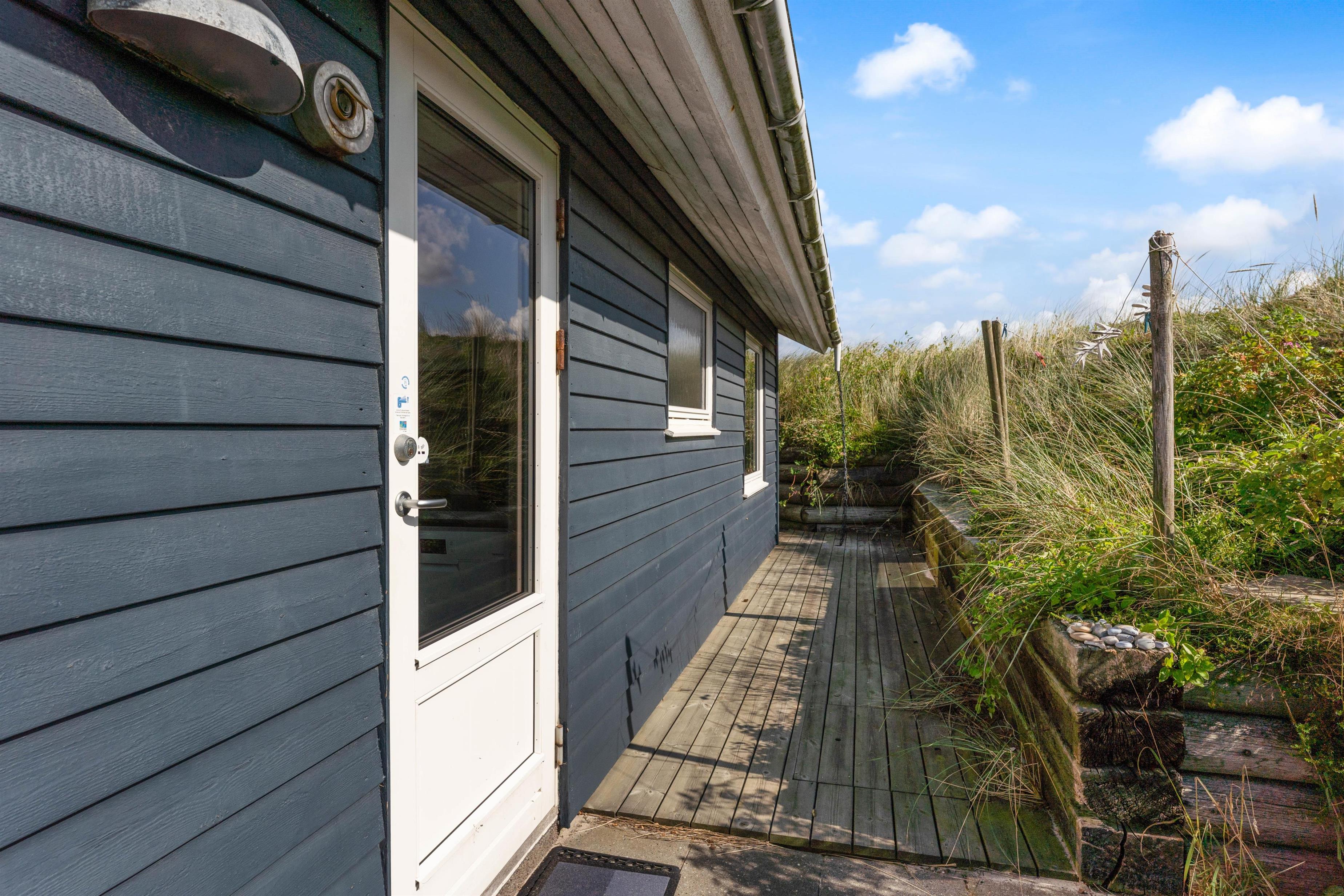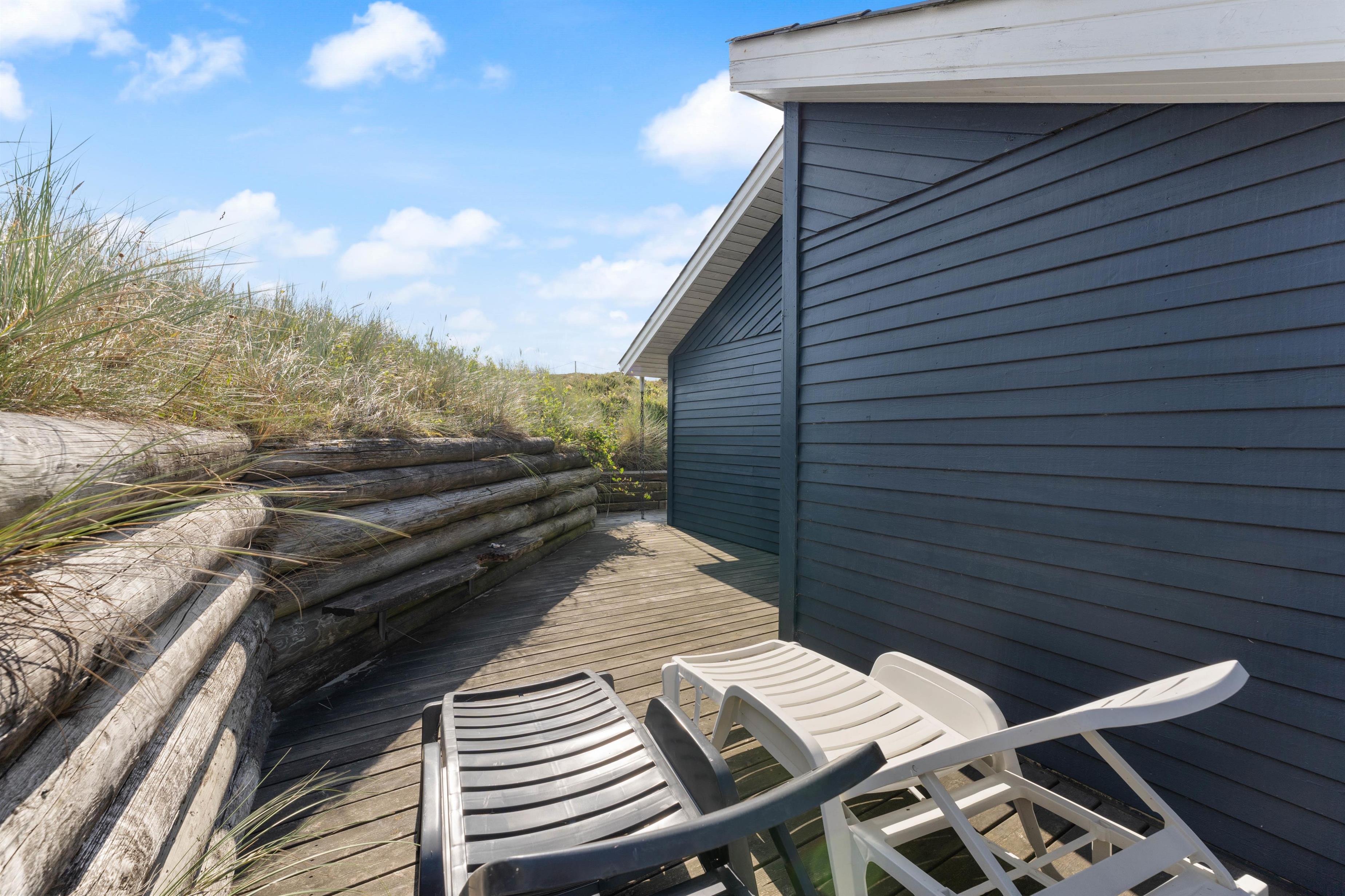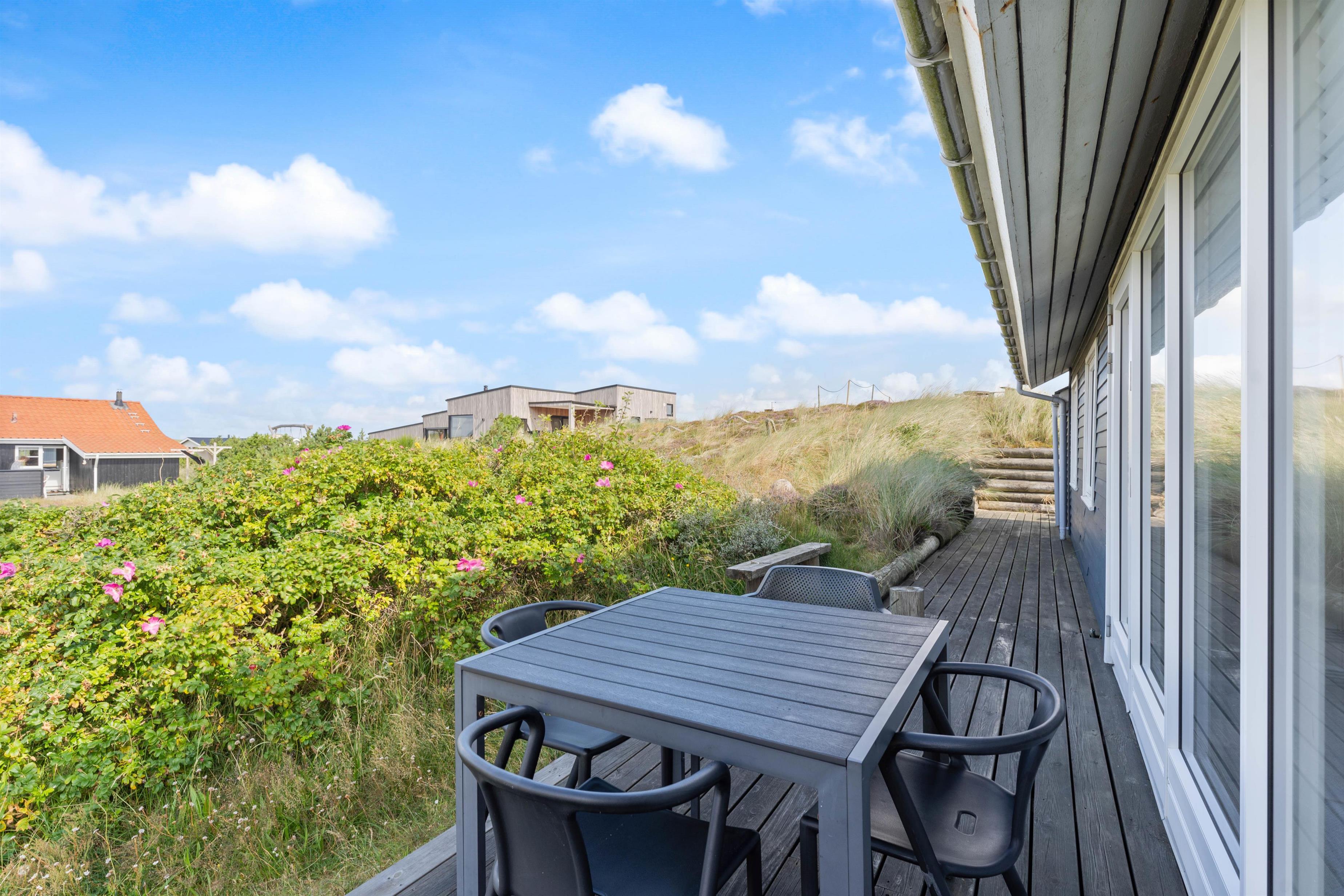 Beliggenheden af dette sommerhus på den kuperede naturgrund kun ca. 500 meter fra stranden gør udendørs ophold til en ægte og uforstyrret naturoplevelse på den møblerede og uforstyrrede terrasse, hvor solen og den friske havluft i Vestjylland rigtig kan nydes.