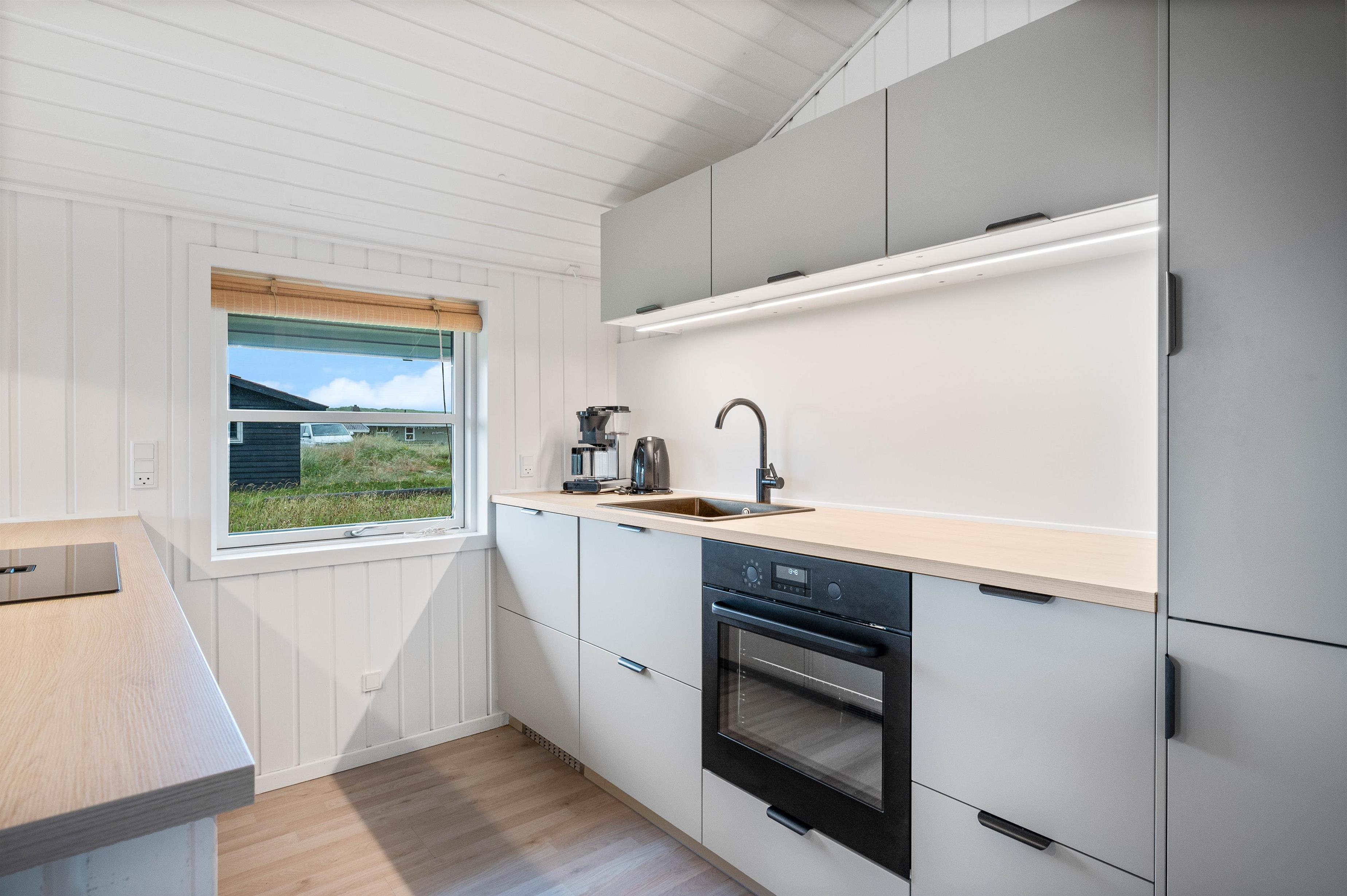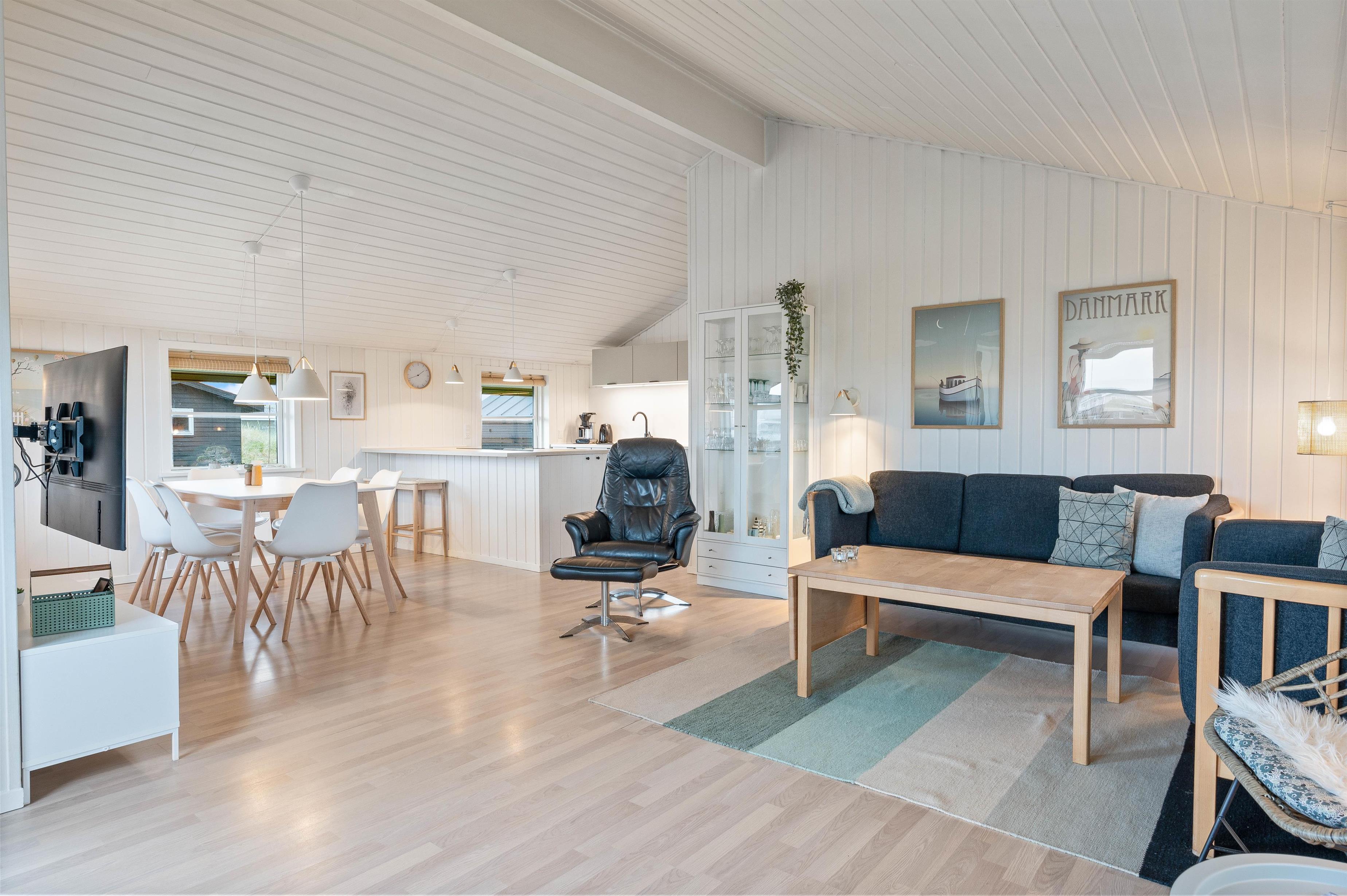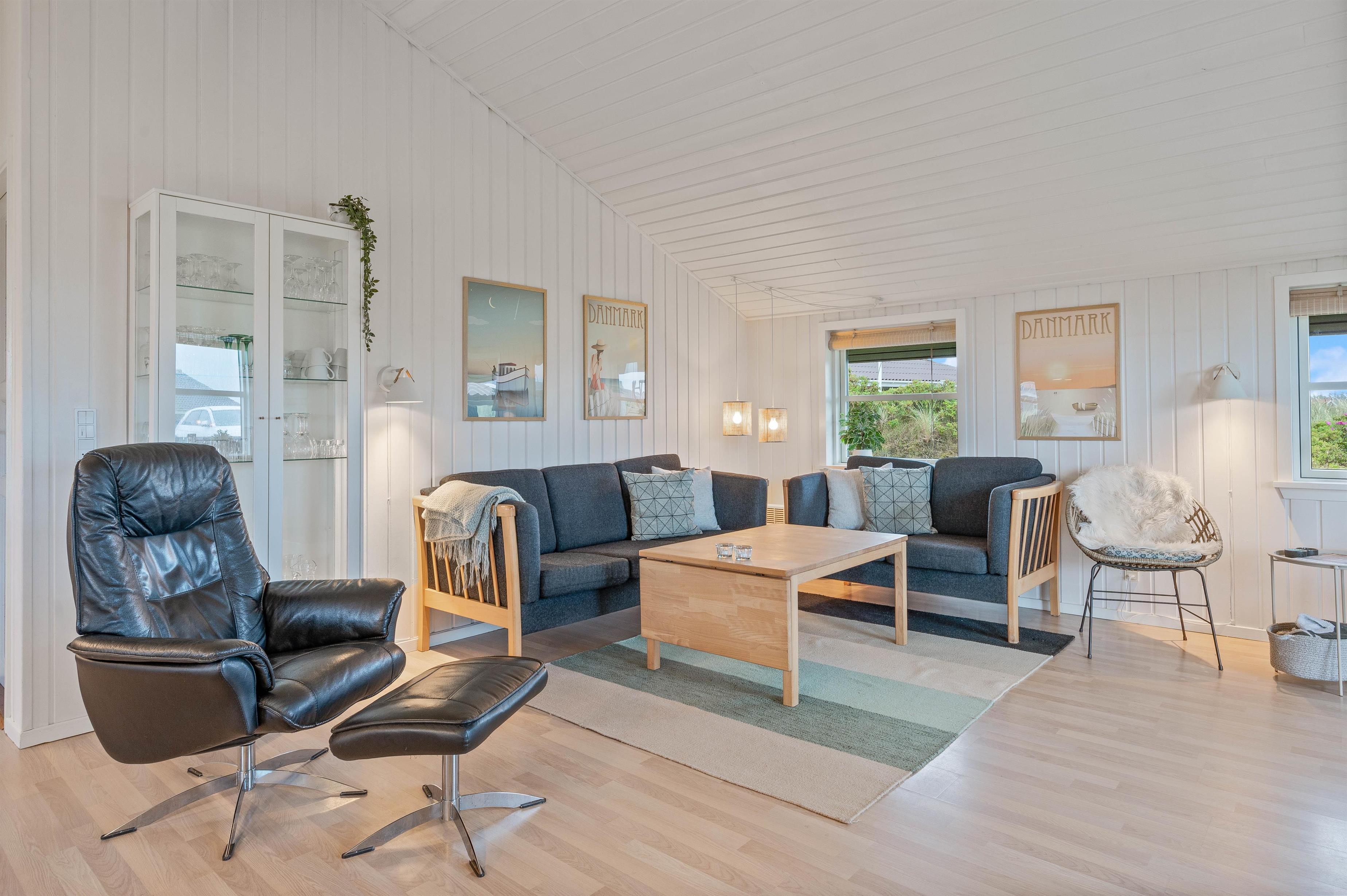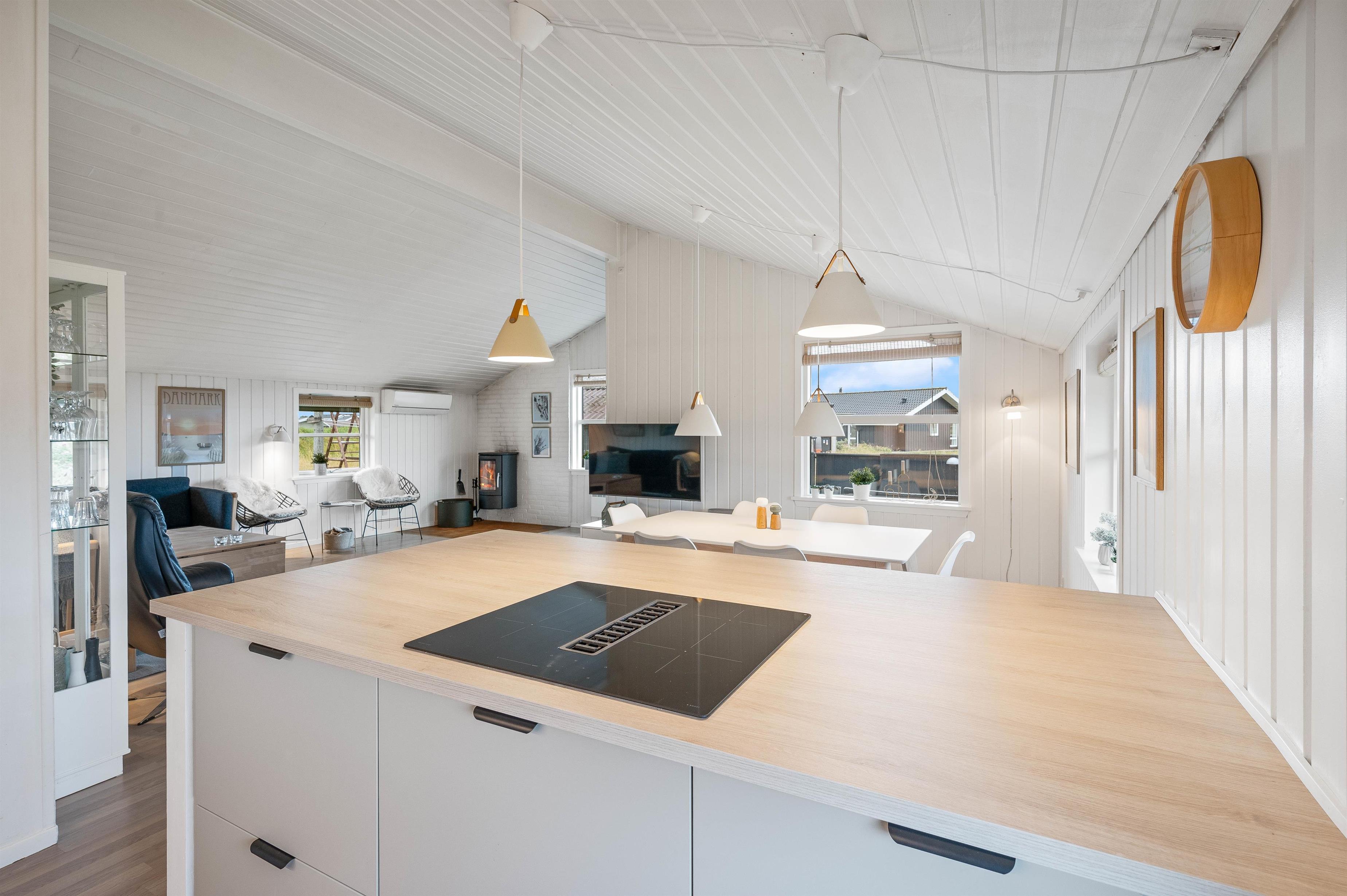 Sommerhuset har et praktisk indrettet køkken, som ligger i åben forbindelse med spiseplads og stue. Her kan hele familien altså være sammen, selvom nogle laver mad og andre slapper af på sofaen. Stuen er smagfuldt indrettet med gode møbler, og de sydvendte vinduer skaber et godt lysindfald i rummet. Her er deusden en brændeovn, som sørger for den helt rigtige feriestemning. I kan med fordel også benytte jer af den energibesparende varmepumpe til at holde temperaturen behagelig.
