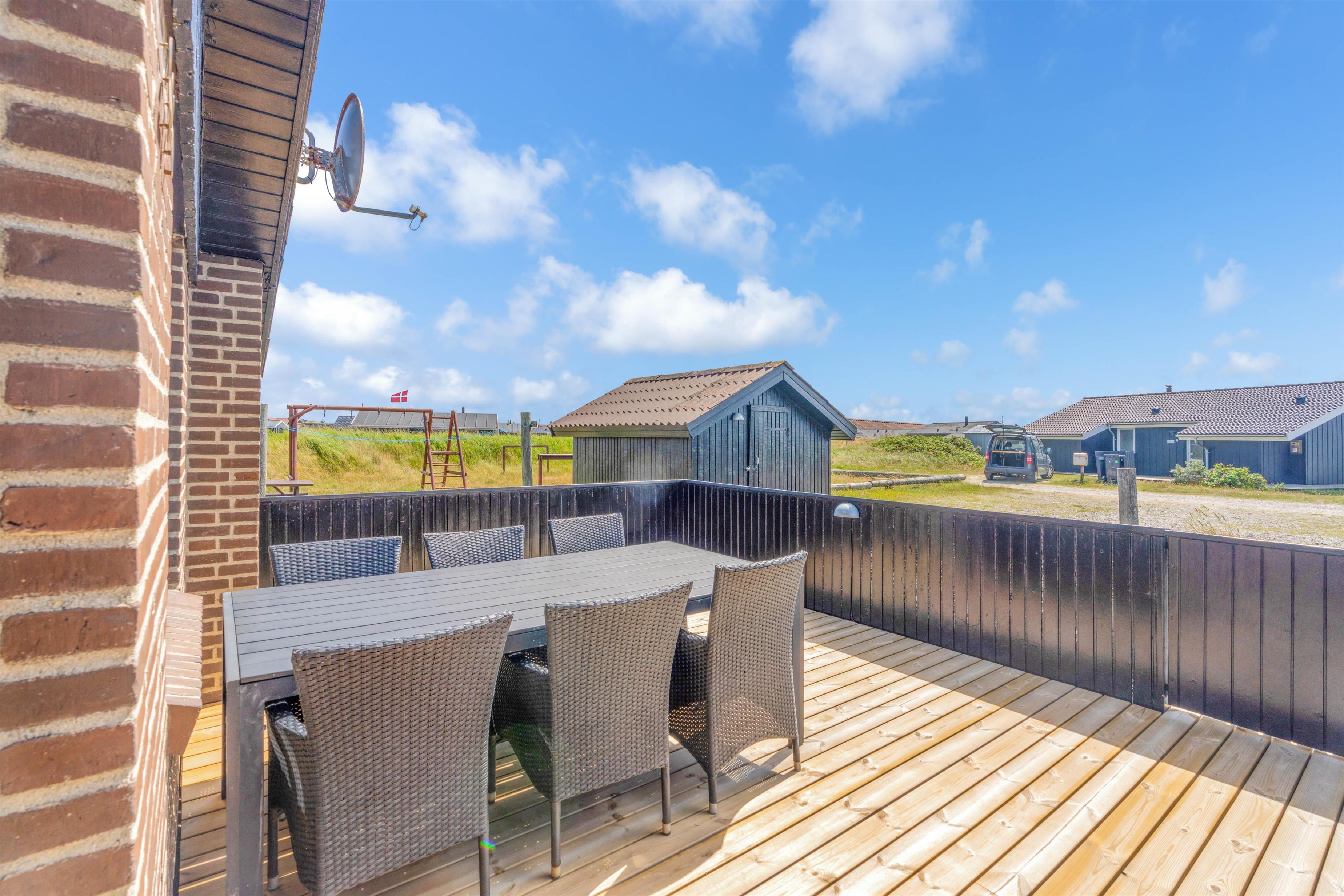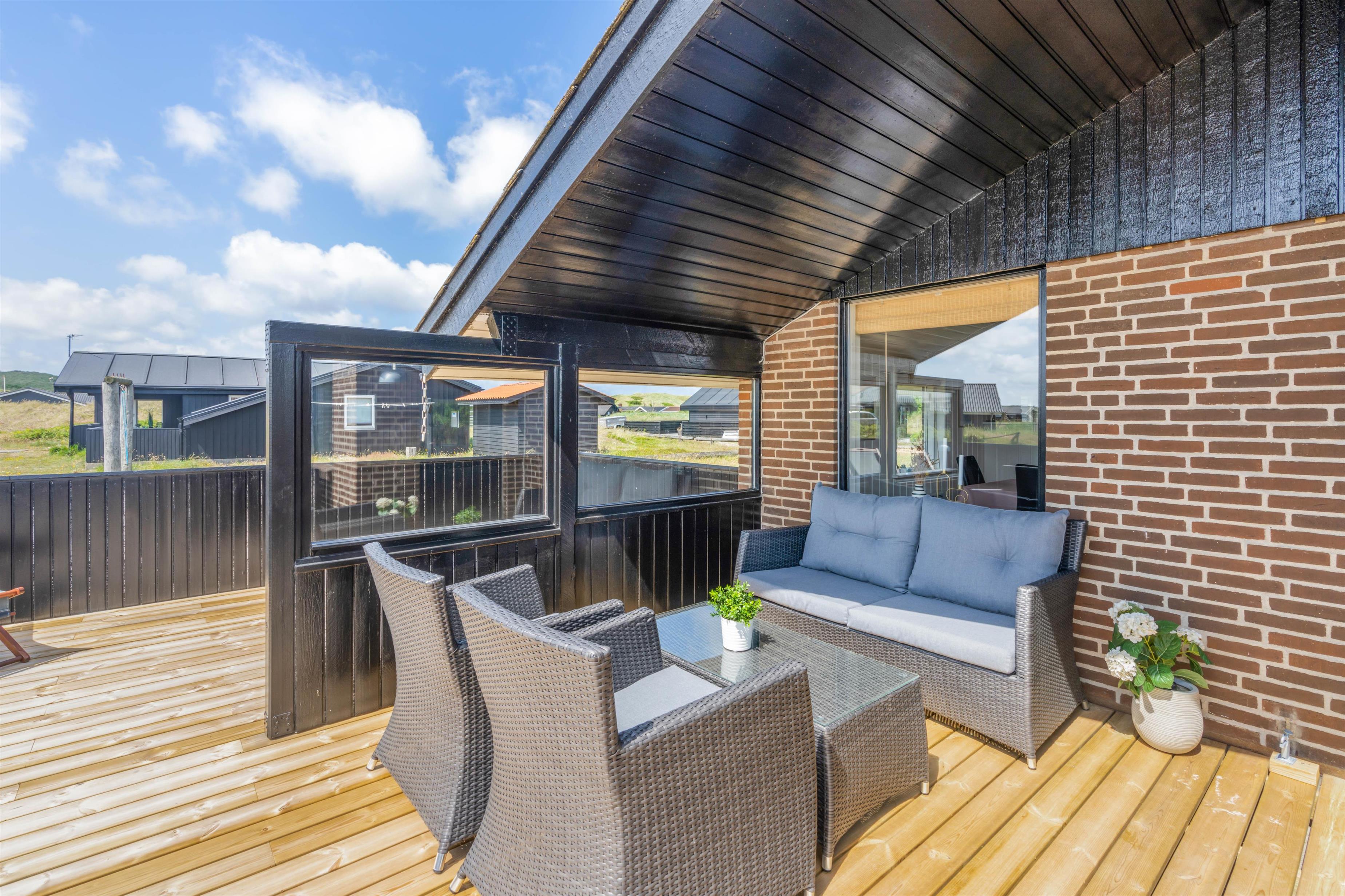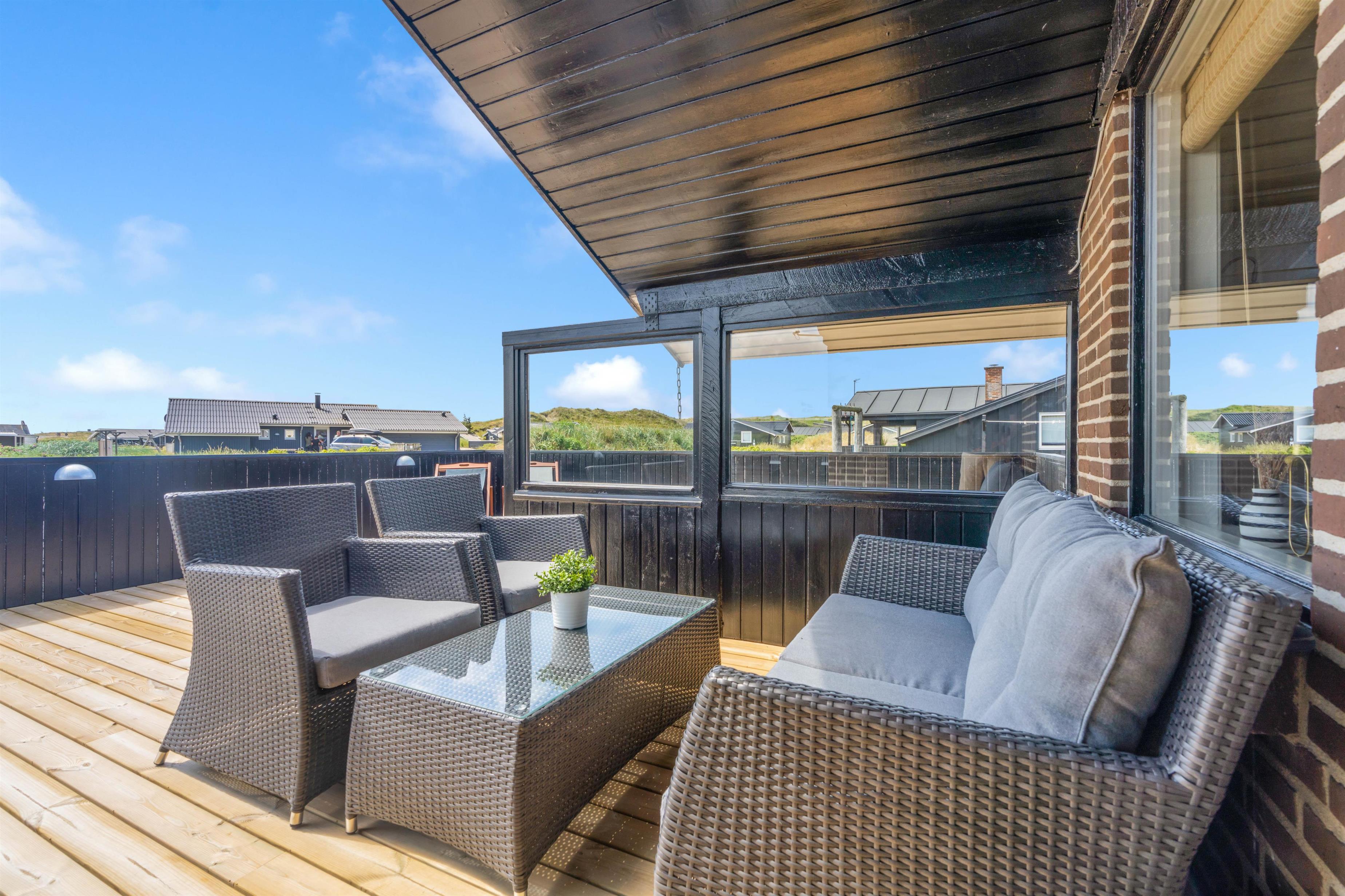 Fra stuen er der udgang til den store syd- og vestvendte terrasse. Terrassen er delvist overdækket og helt lukket, så har du hund eller småbørn med, kan du roligt lade terrassedøren stå åben, mens aftensmaden tilberedes. Terrassen er udstyret med havemøbler og grill. På grunden er der opstillet gynge og sandkasse til familiens yngste.