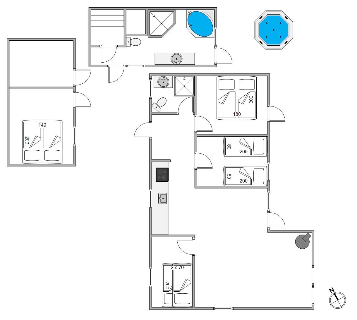 Med 2 badeværelser til jeres rådighed behøver I ikke at bekymre jer om lange ventetider morgen og aften. I saunaen kan I kan slappe af efter en lang strandtur. Eller I kan afslutte dagen i det udendørs vildmarksbad under åben himmel, og kigge på stjerner.