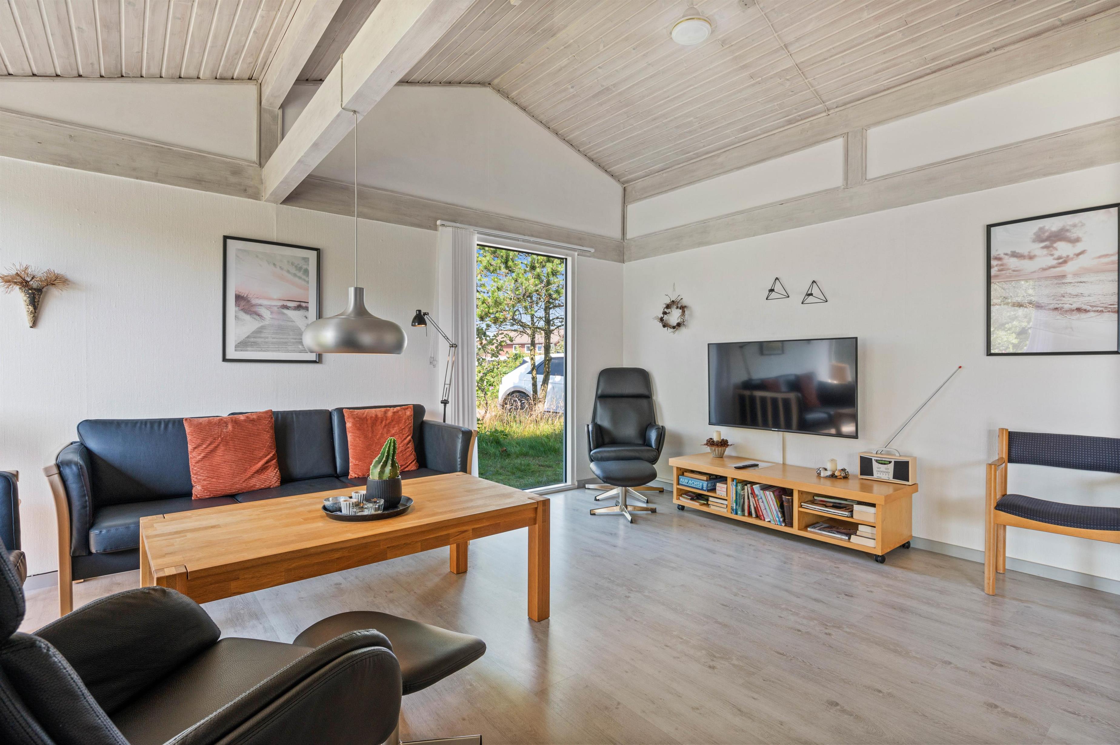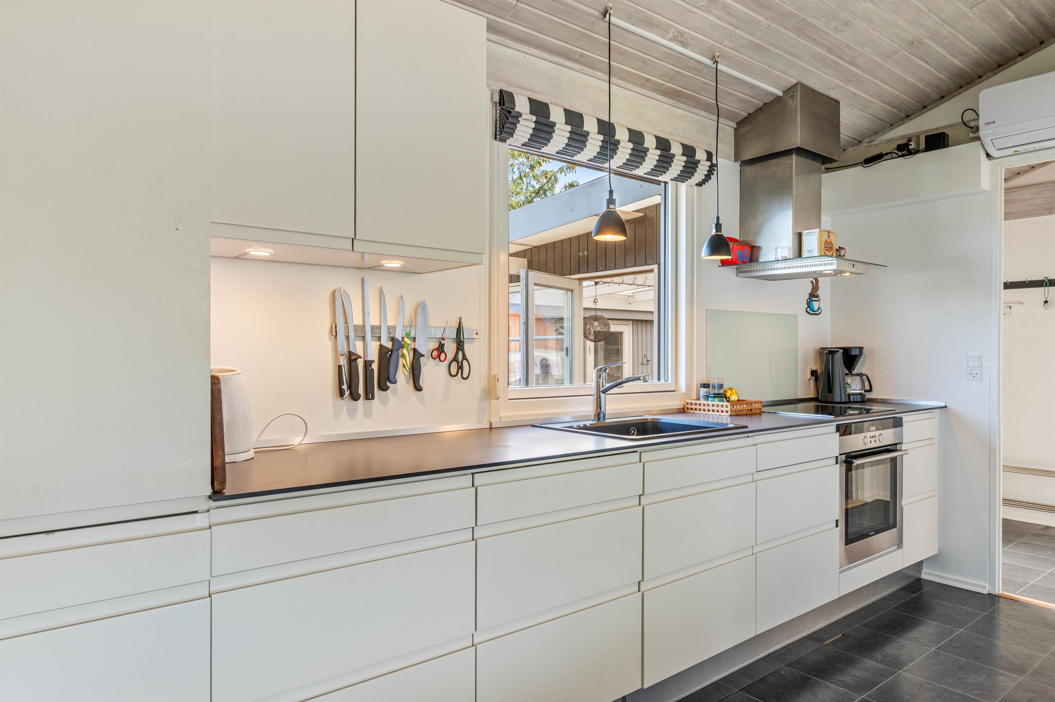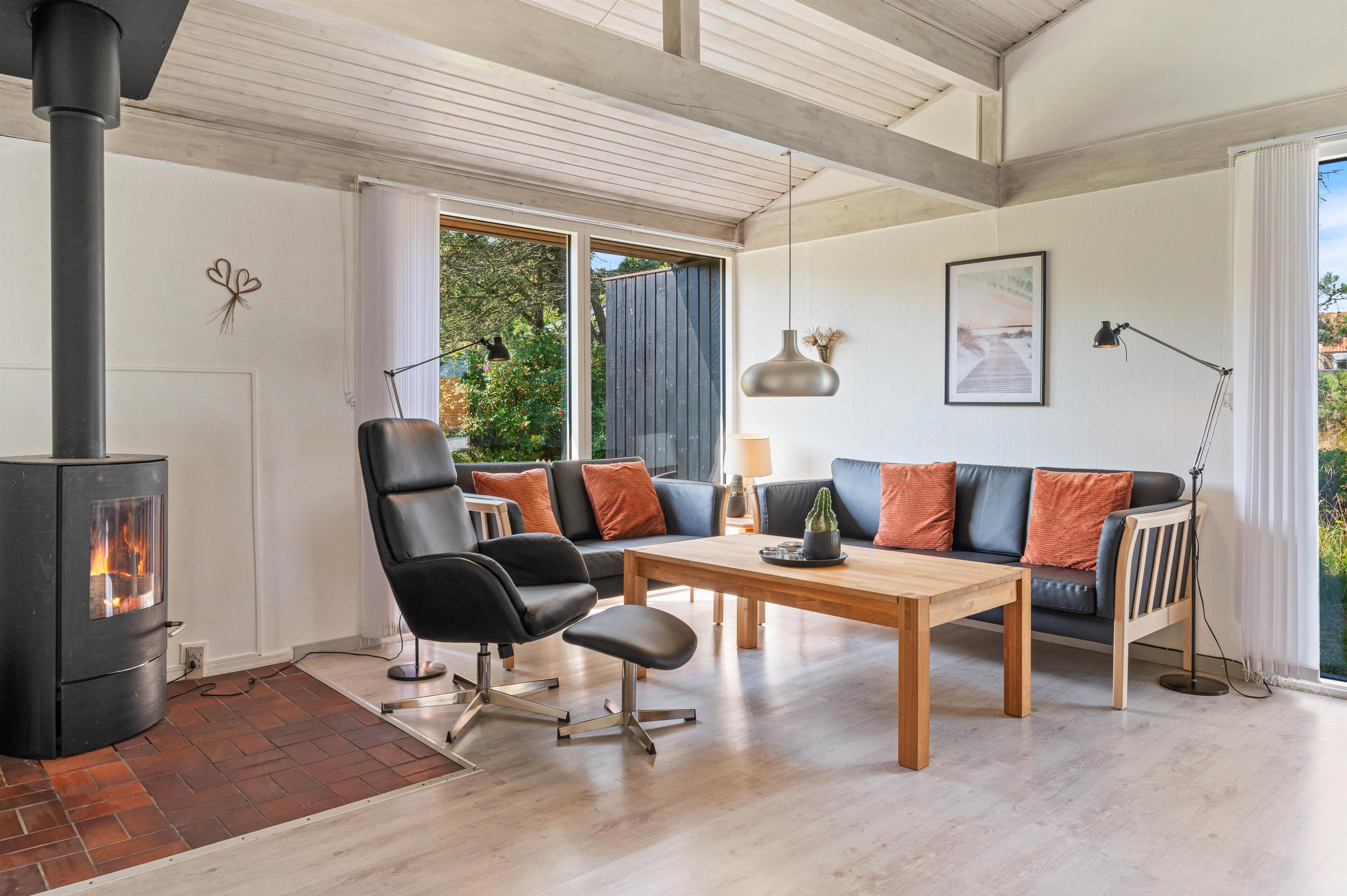 Hjertet i feriehuset er den hyggelige stue med brændeovnen, som topper feriestemningen med en behagelig atmosfære på kølige aftener. Den omkostnings- og energibesparende varmepumpe sørger for behagelige temperaturer i feriehuset. Træbeklædte, lyse vægge i kombination med de store vinduer giver en lys og let atmosfære, hvor man føler sig rigtig godt tilpas.