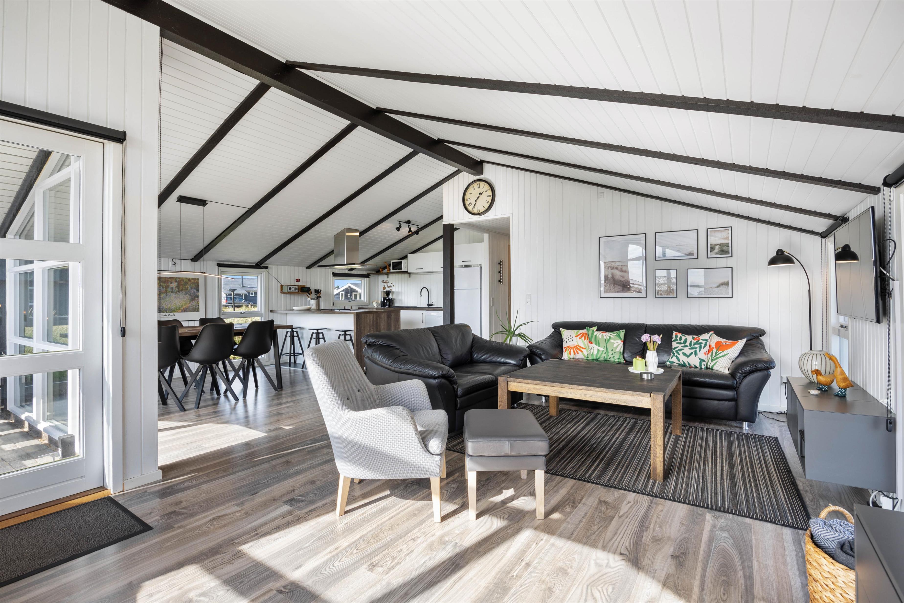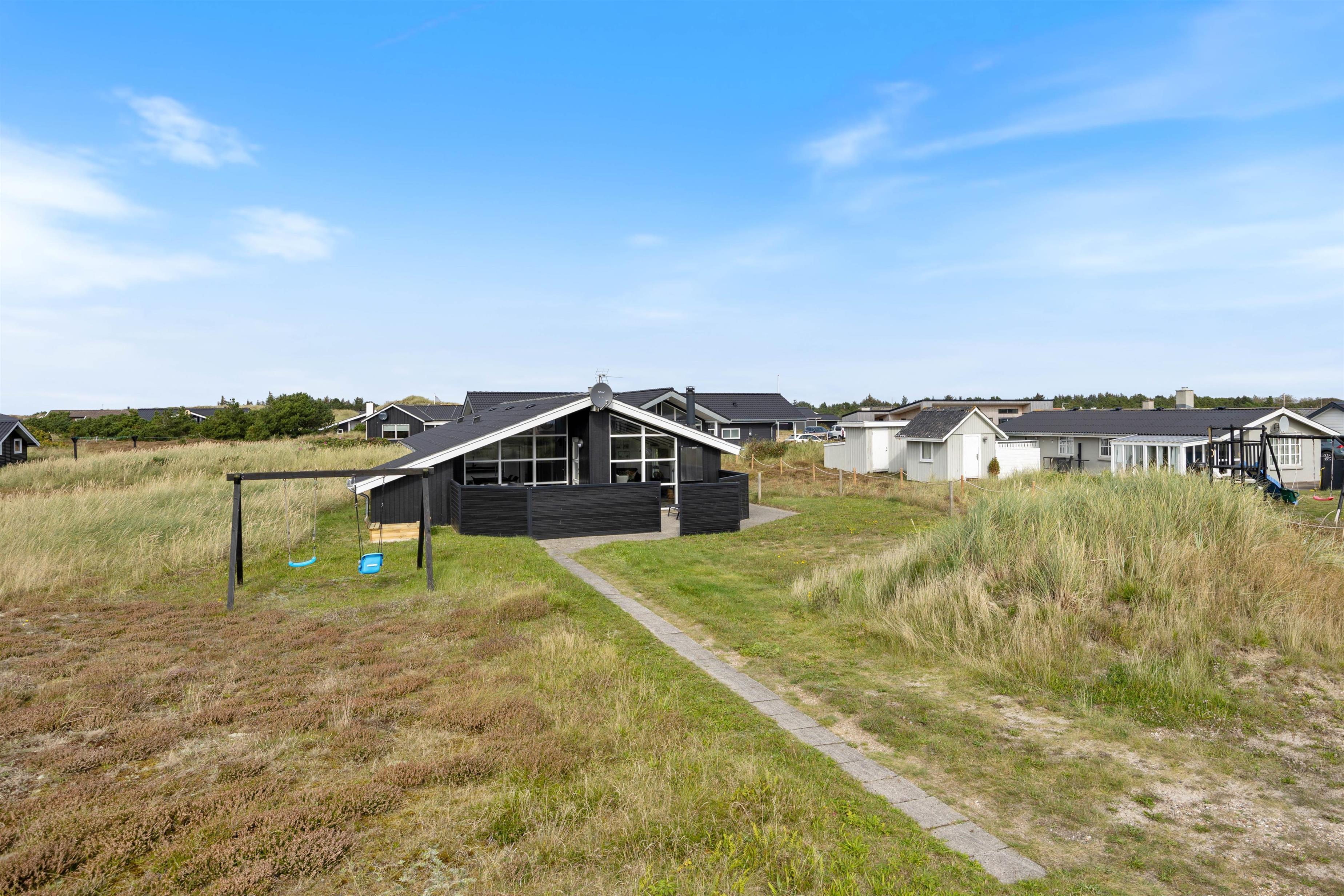 Den overdækkede terrasse gør det muligt at nyde udendørslivet i al slags vejr. Havemøbler og en grill står til rådighed, hvilket skaber fantastiske muligheder for hyggelige grillmiddage i det fri. Børnene vil elske gyngen og sandkassen, mens der også er plads til at boltre sig på den 1250 m2 store naturgrund. Med kun 500 meter til stranden er det oplagt med en aftentur for at opleve solnedgangen i Vesterhavet.