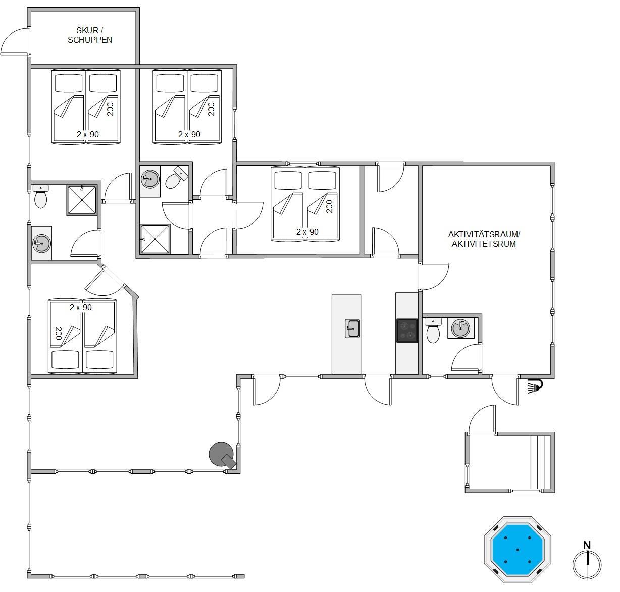 På terrassen finder I også husets sauna - og ikke mindst et lækkert udendørs spabad, som vil være til glæde for både børn og voksne. Lad børnene plaske rundt, mens I soler jer, eller nyd de varme bobler på en sen sommeraften under en klar stjernehimmel. Udebruseren kan benyttes fra april til november, hvor i kan skylle sandet af tæerne.