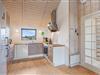 Feriehusets køkken er flot og lyst og indeholder både opvaskemaskine og mikroovn. Det ligger i åben forbindelse til stuen, så I stadig kan være sammen, når bedstemor lige klargør de nye kartofler, og far og bedstefar ligger og slapper af i de dejlige lænestole, inden grillen skal tændes op på husets læ-fyldte terrasse.