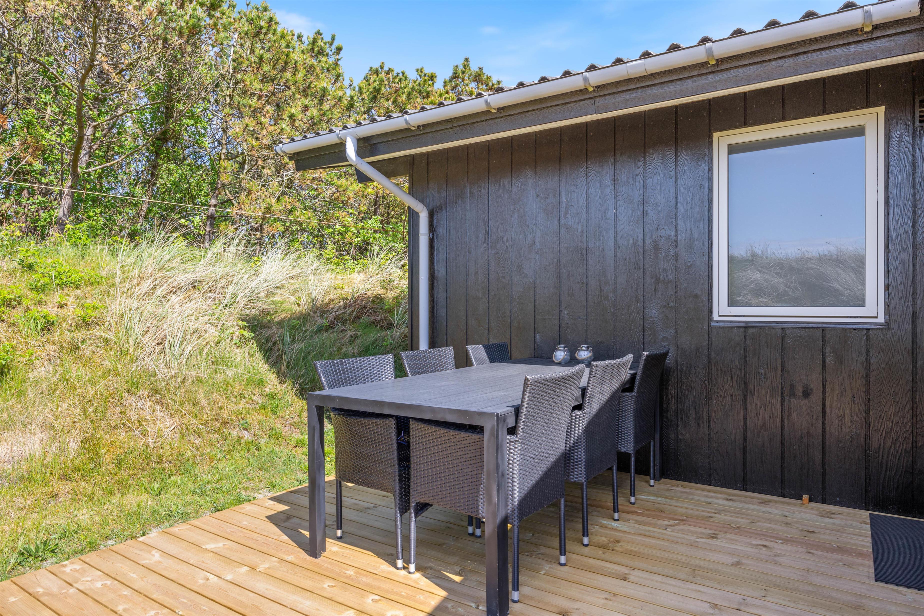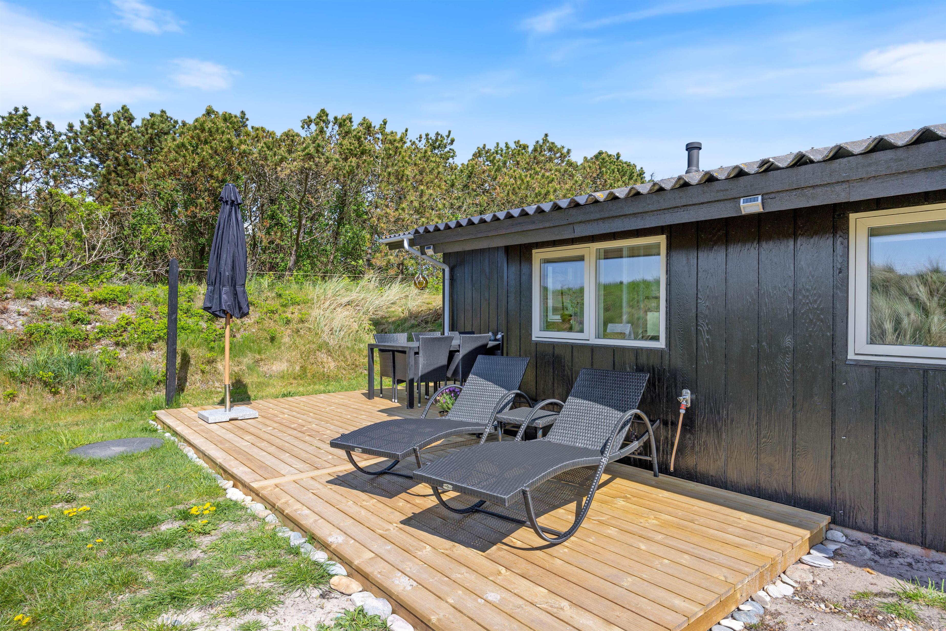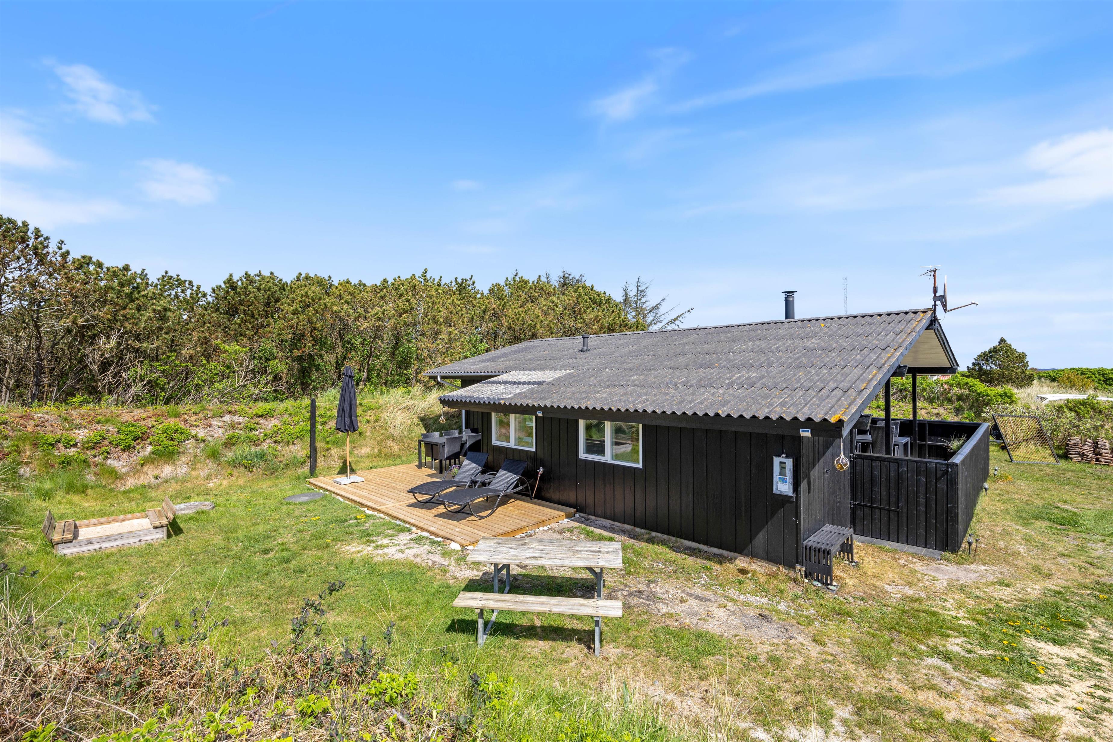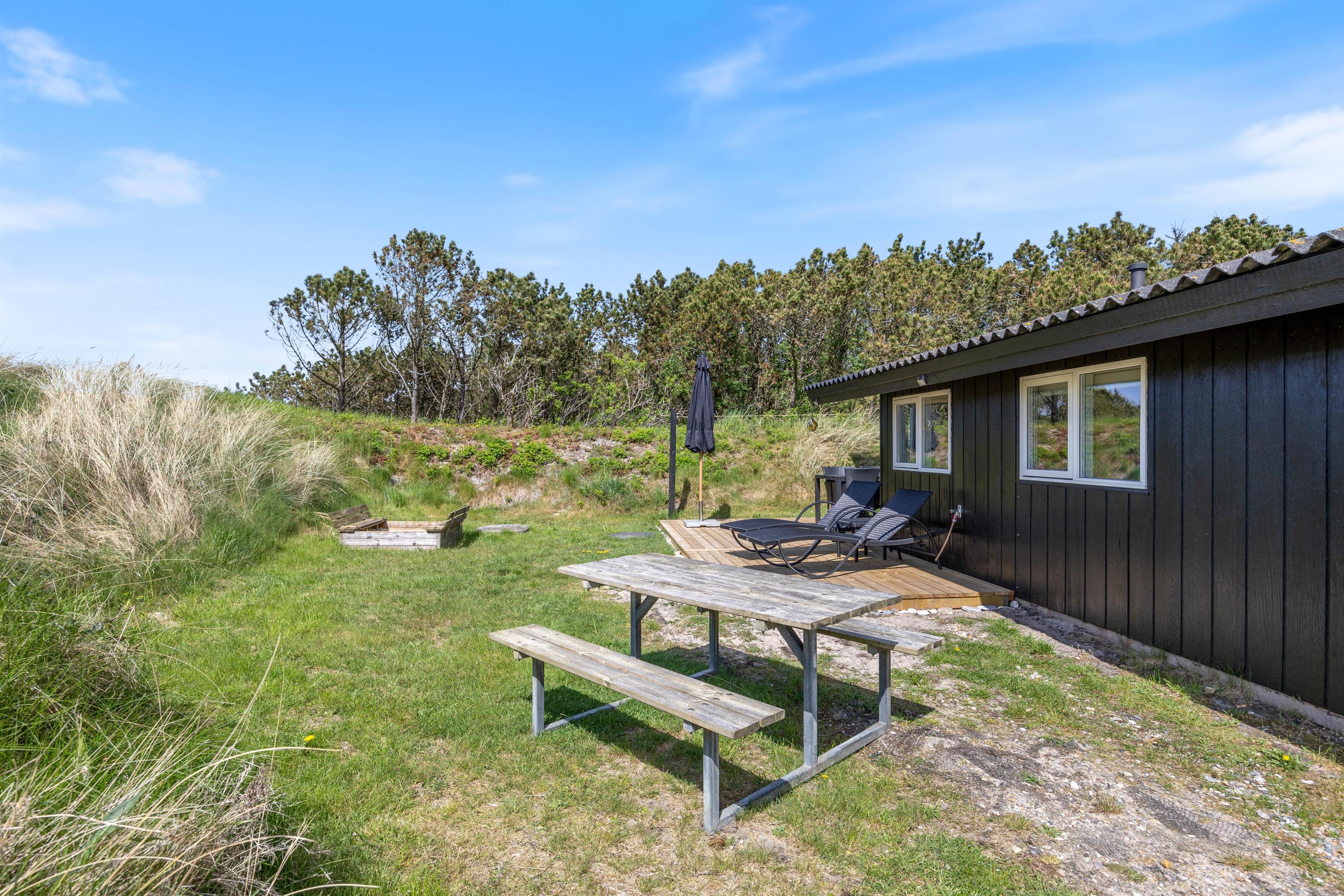 I baghaven findes den anden træterrasse, her er der god læ – Så lad feriestemningen brede sig, slap af med en bog på liggestolene og lad børnene lege på den grønne græsplæne eller i sandkassen.
