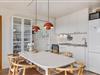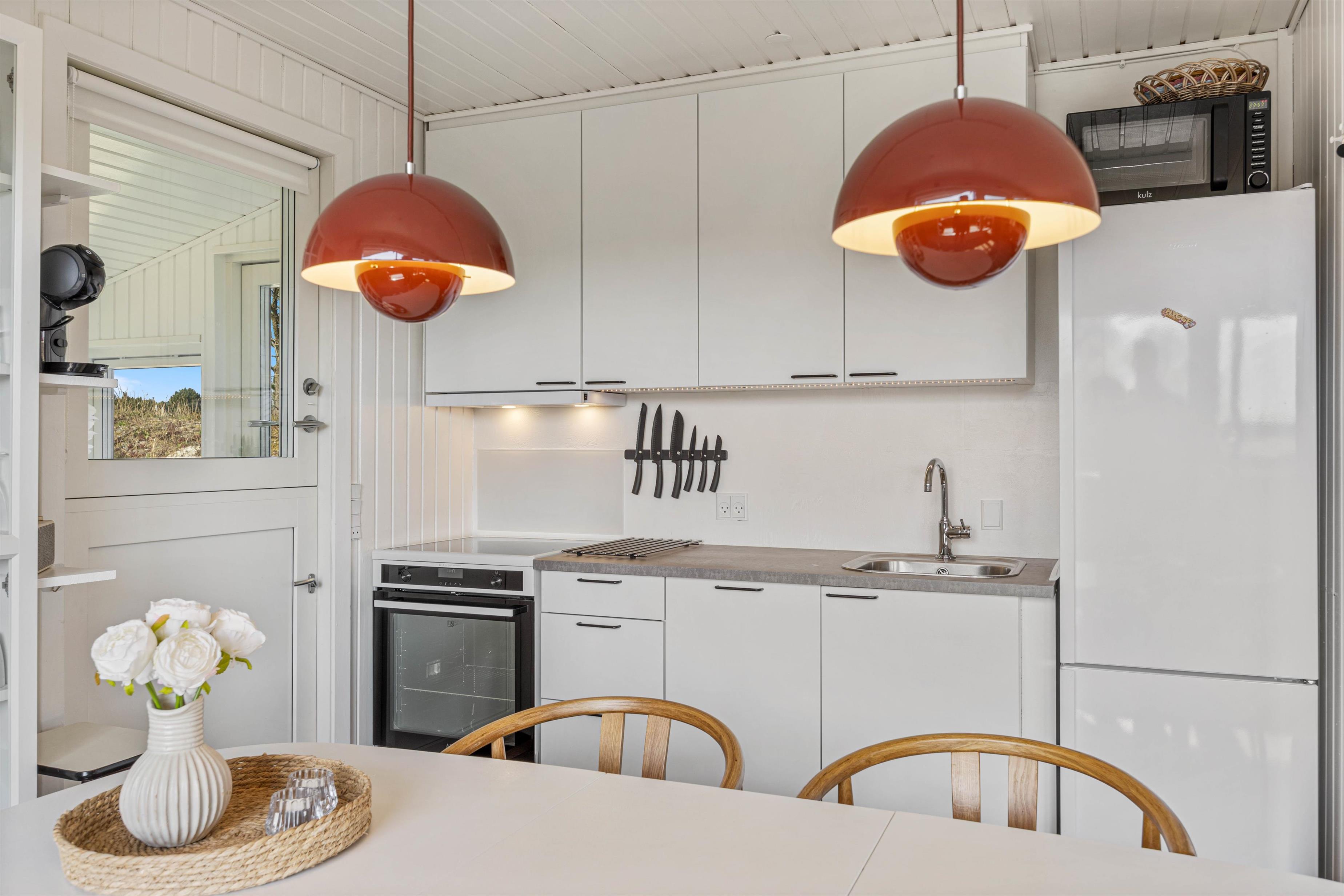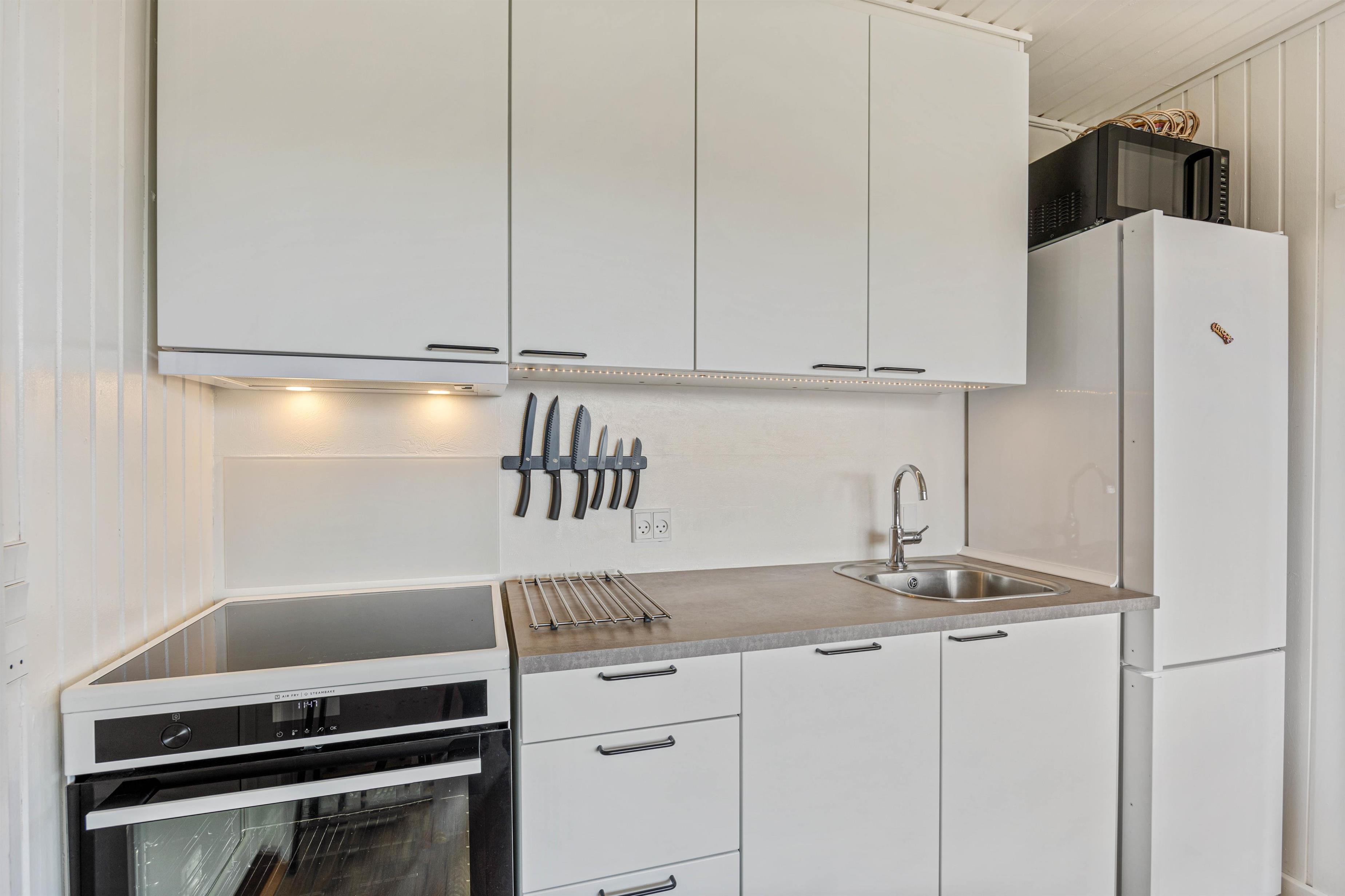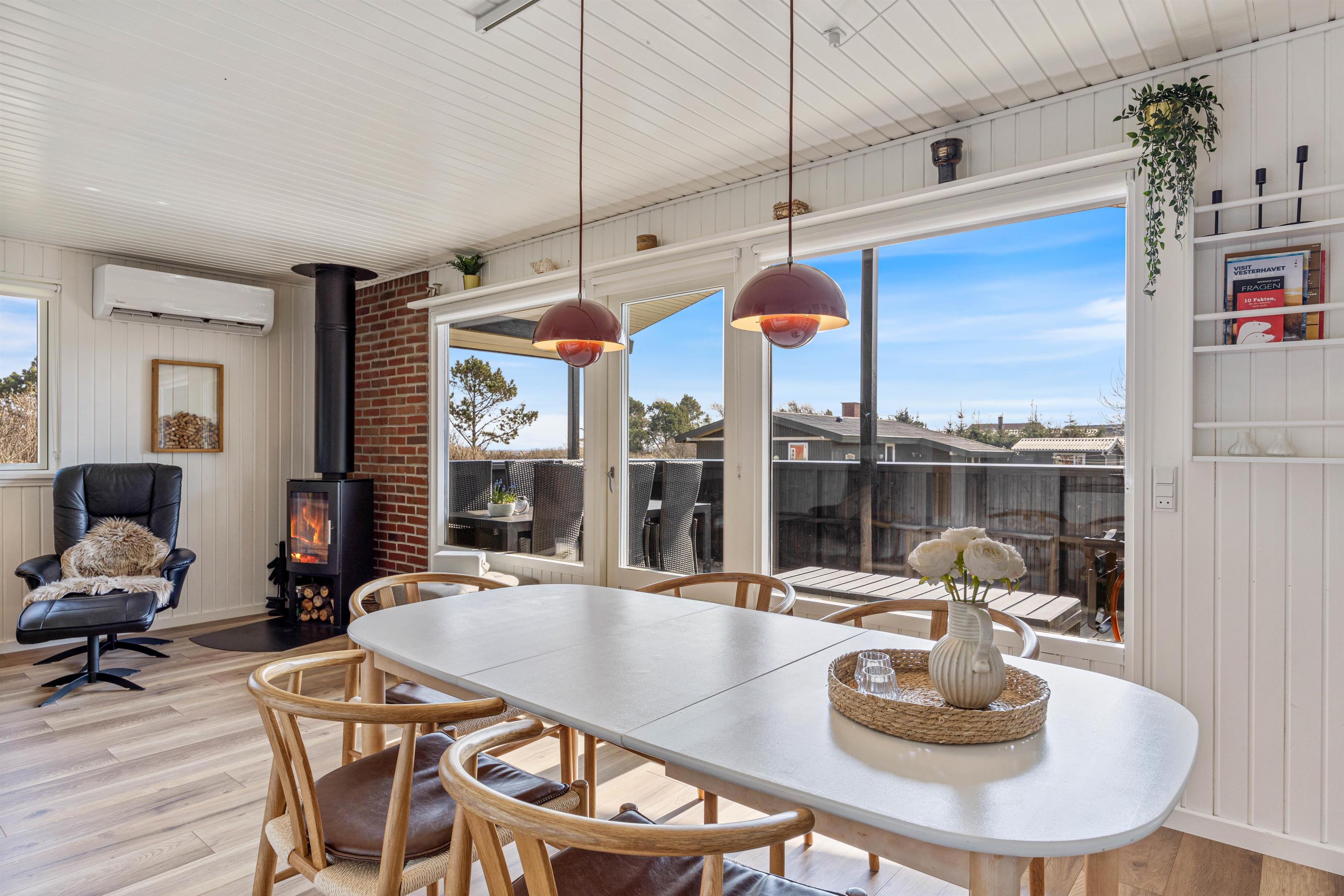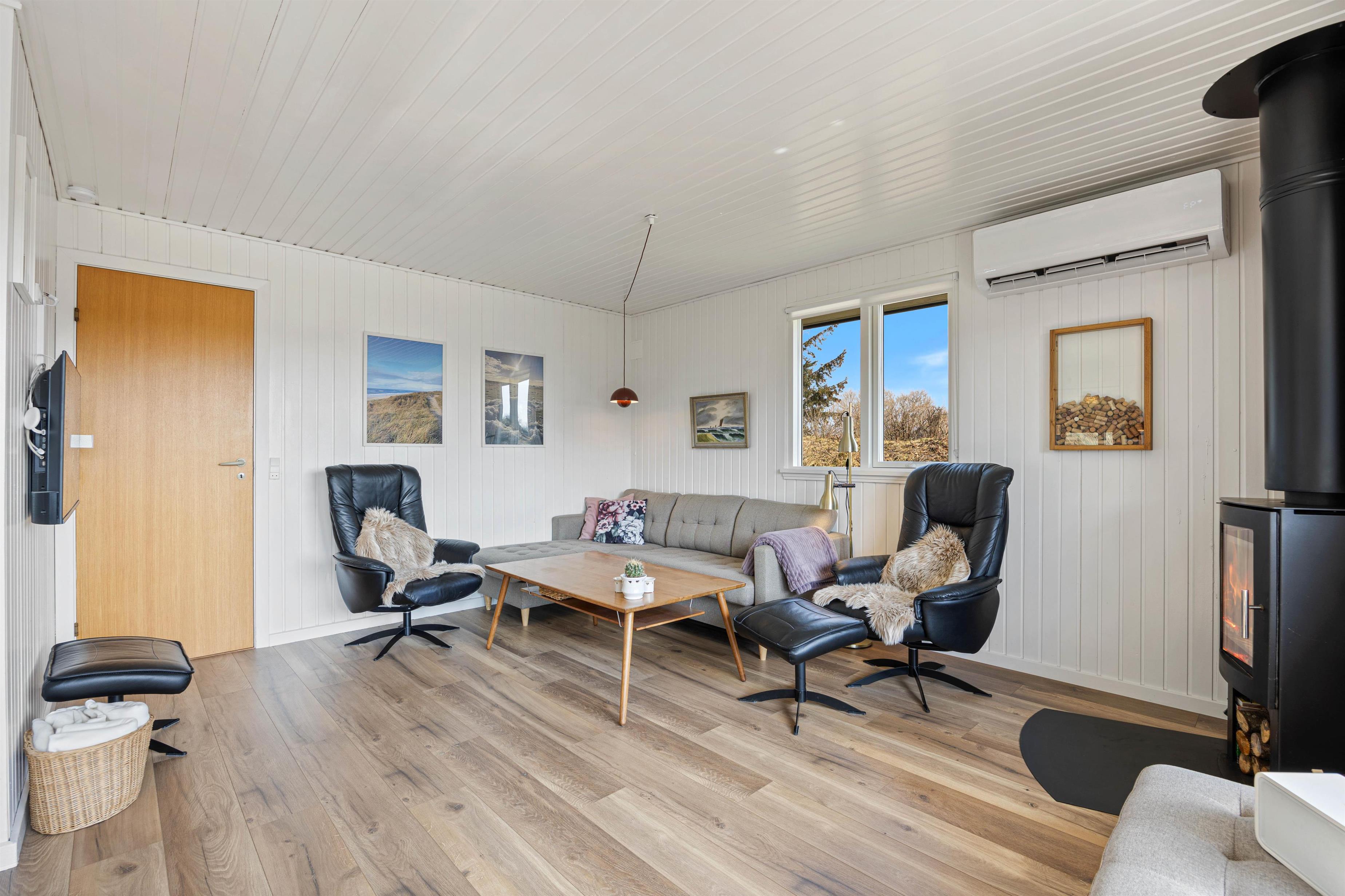 Træd ind i en stue, hvor komfort og hygge mødes! Den kombinerede stue og køkkenområdet er indrettet med smagfulde møbler, og her kan I alle samles til skønne stunder herunder fælles madlavning eller brætspil. Den varme brændeovn spreder hygge og er perfekt til de køligere aftner! Praktisk er sommerhuset også udstyret med en energibesparende varmepumpe, der sørger for et behageligt indeklima!