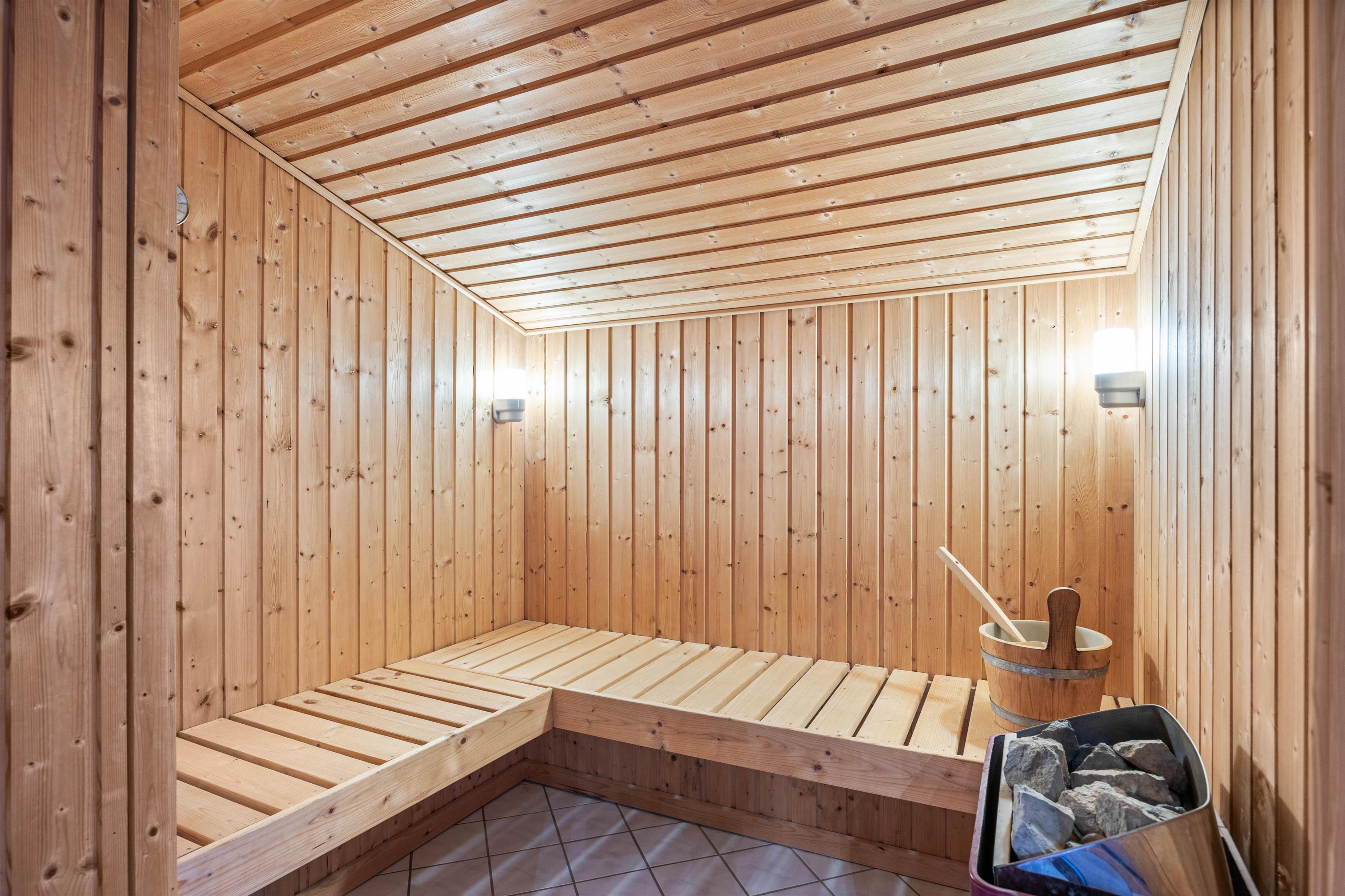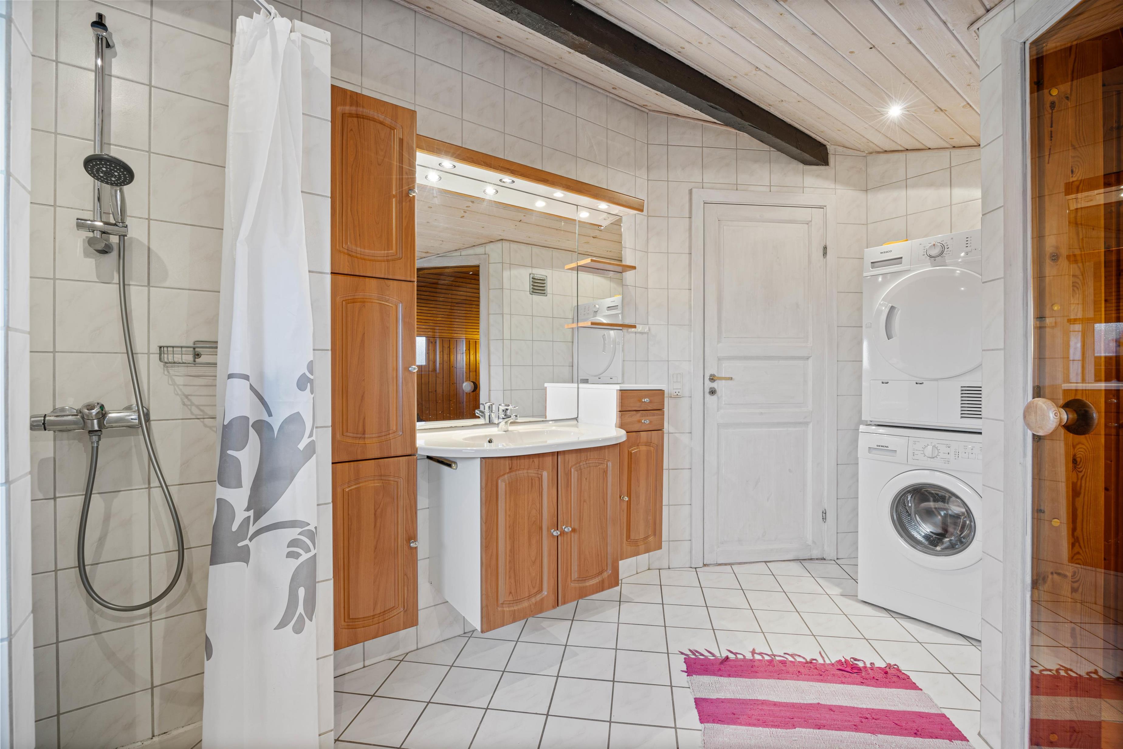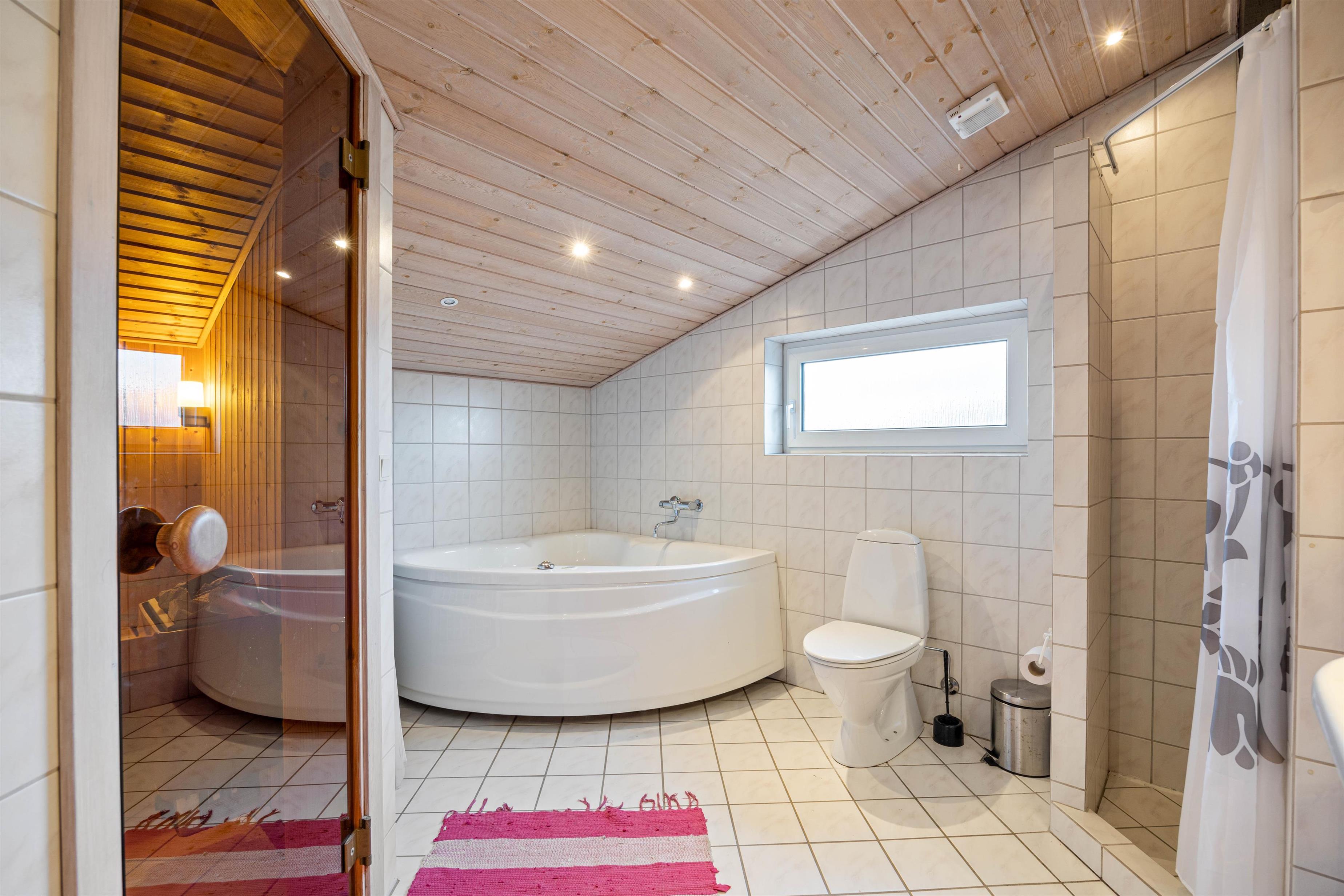 I det store badeværelse med gulvvarme indbyder spabadet og saunaen til ferieafslapning, og her er både barneseng og -stol til småbørns-familie.