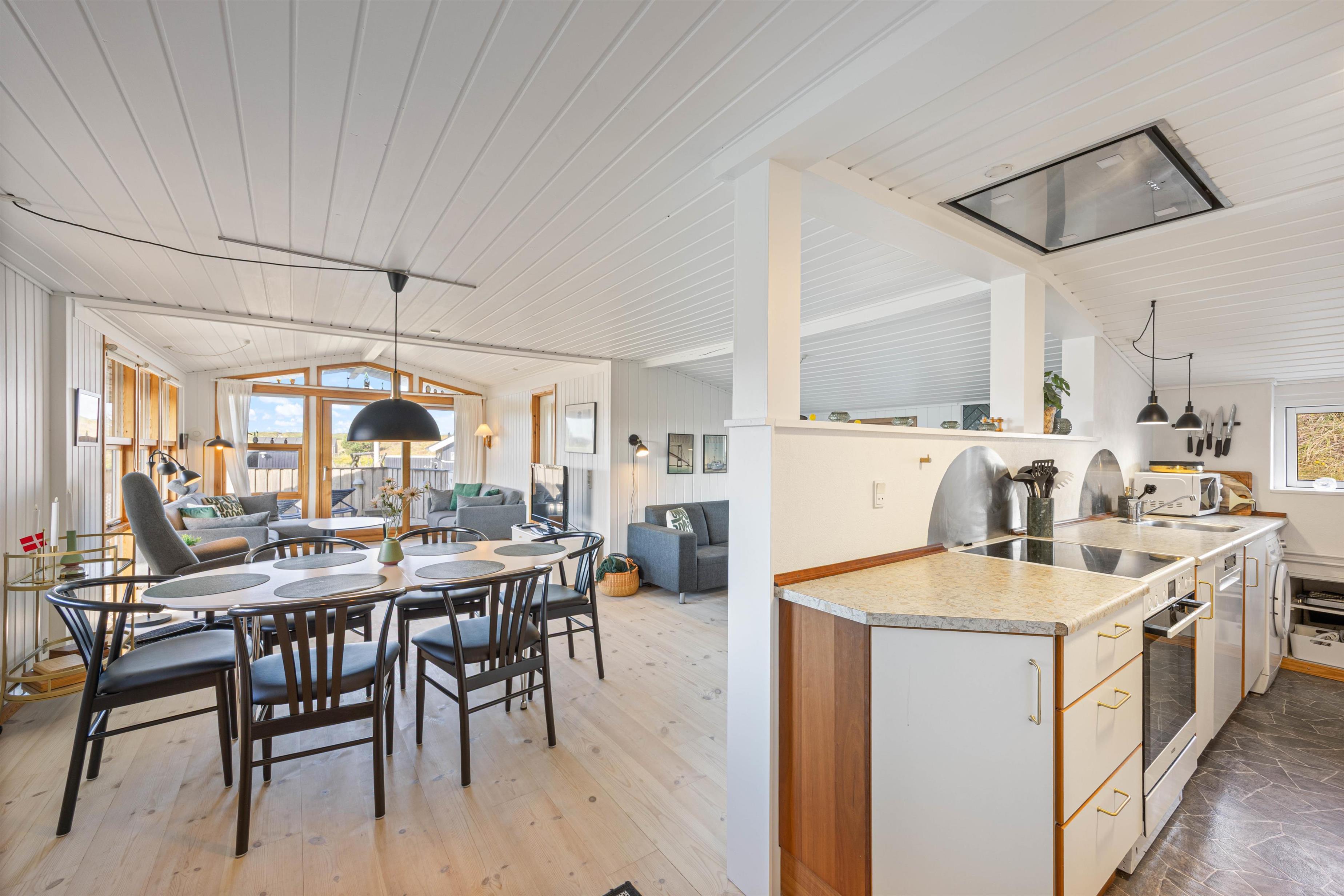 Feriehuset er indrettet med et personligt præg, der giver en hyggelig stemning, som er et vigtigt grundlag for enhver ferie. Her er tænkt over, at hele familien skal kunne samles i stuen, der ligger i forlængelse af det veludstyrede køkken.