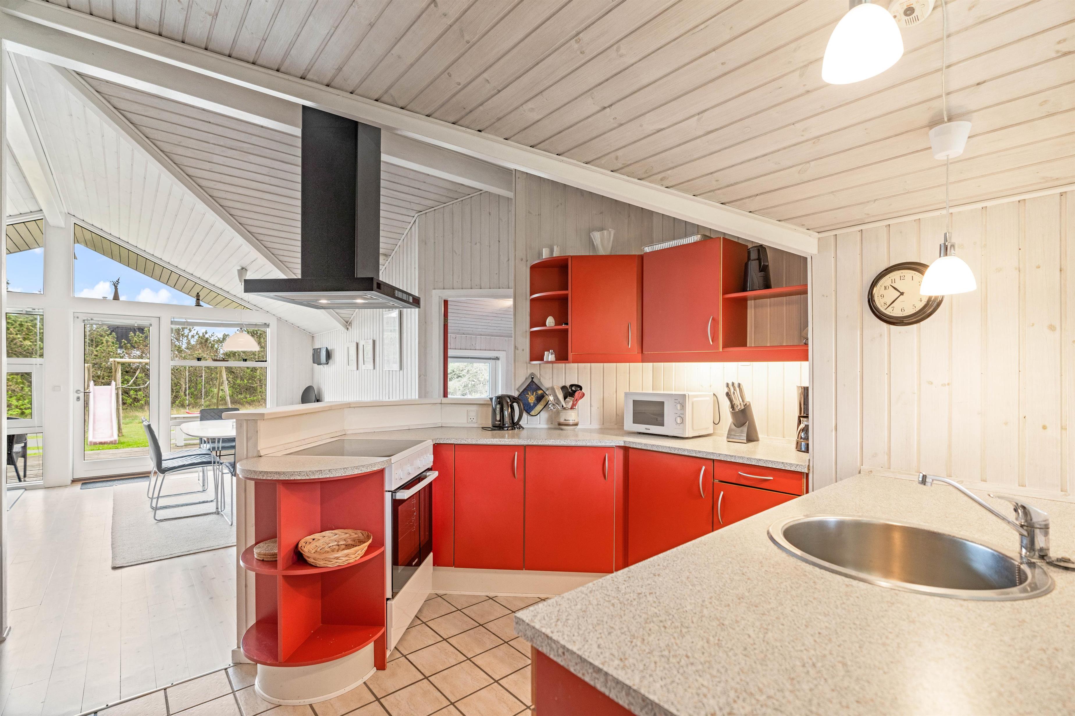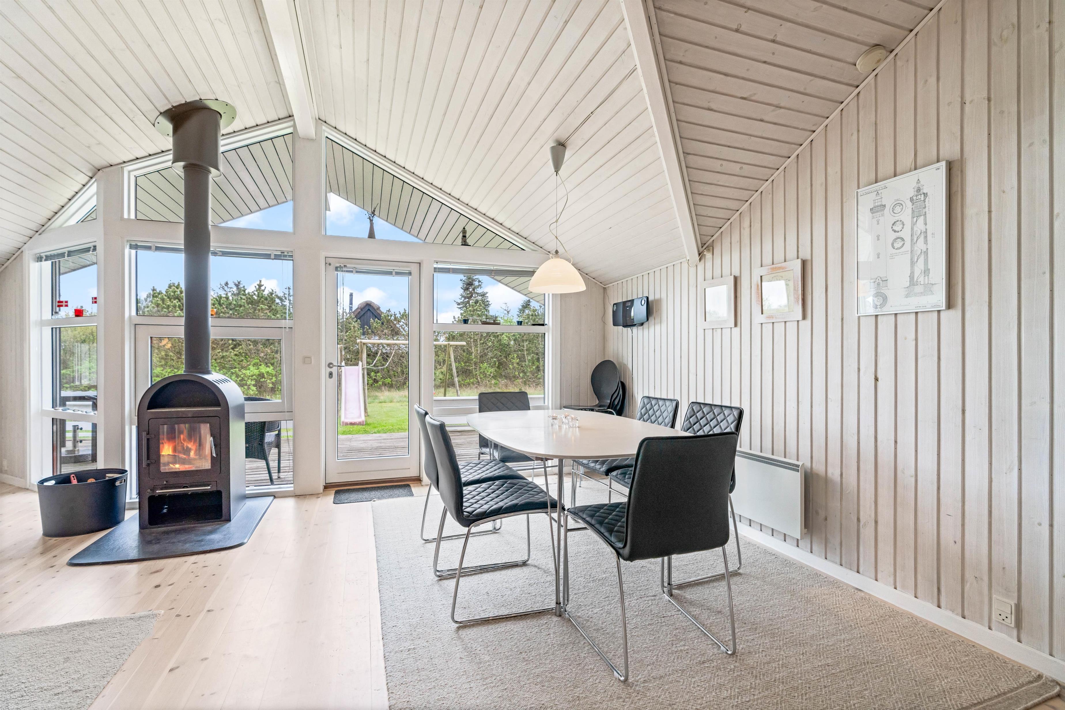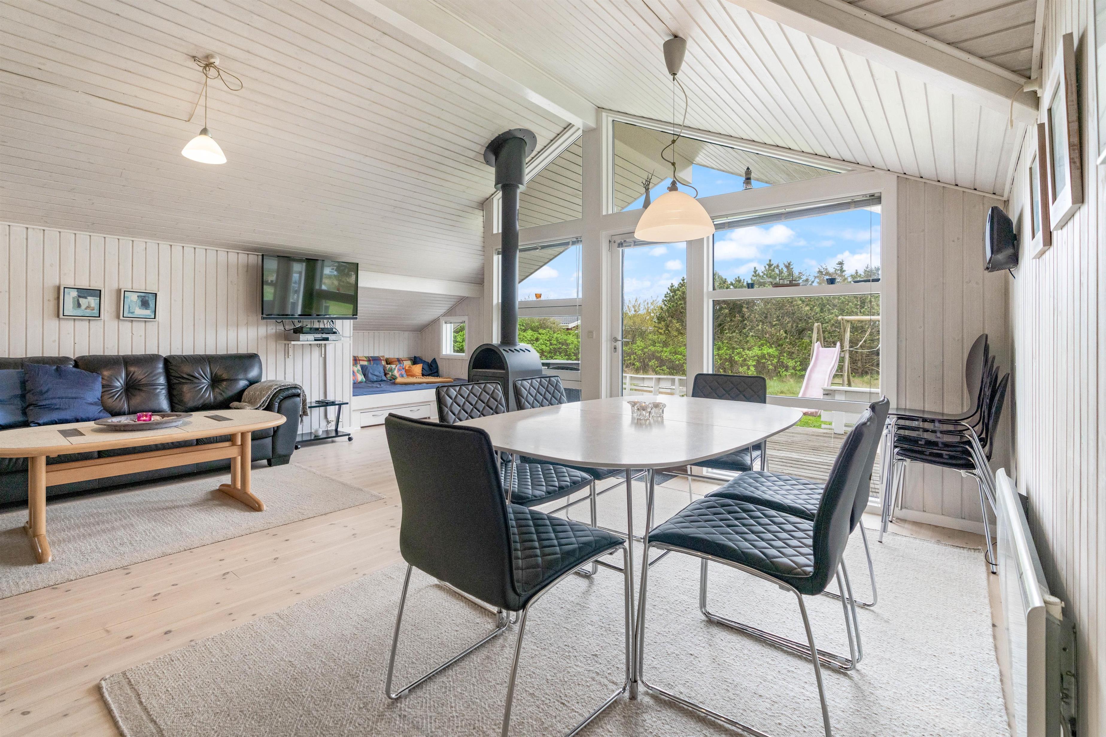 Feriehuset er placeret i et skønt sommerhusområde, og her er hverken langt til det brusende Vesterhav eller den lokale købmand, hvor I hver dag kan hente frisk morgenbrød på morgengåturen med hunden.