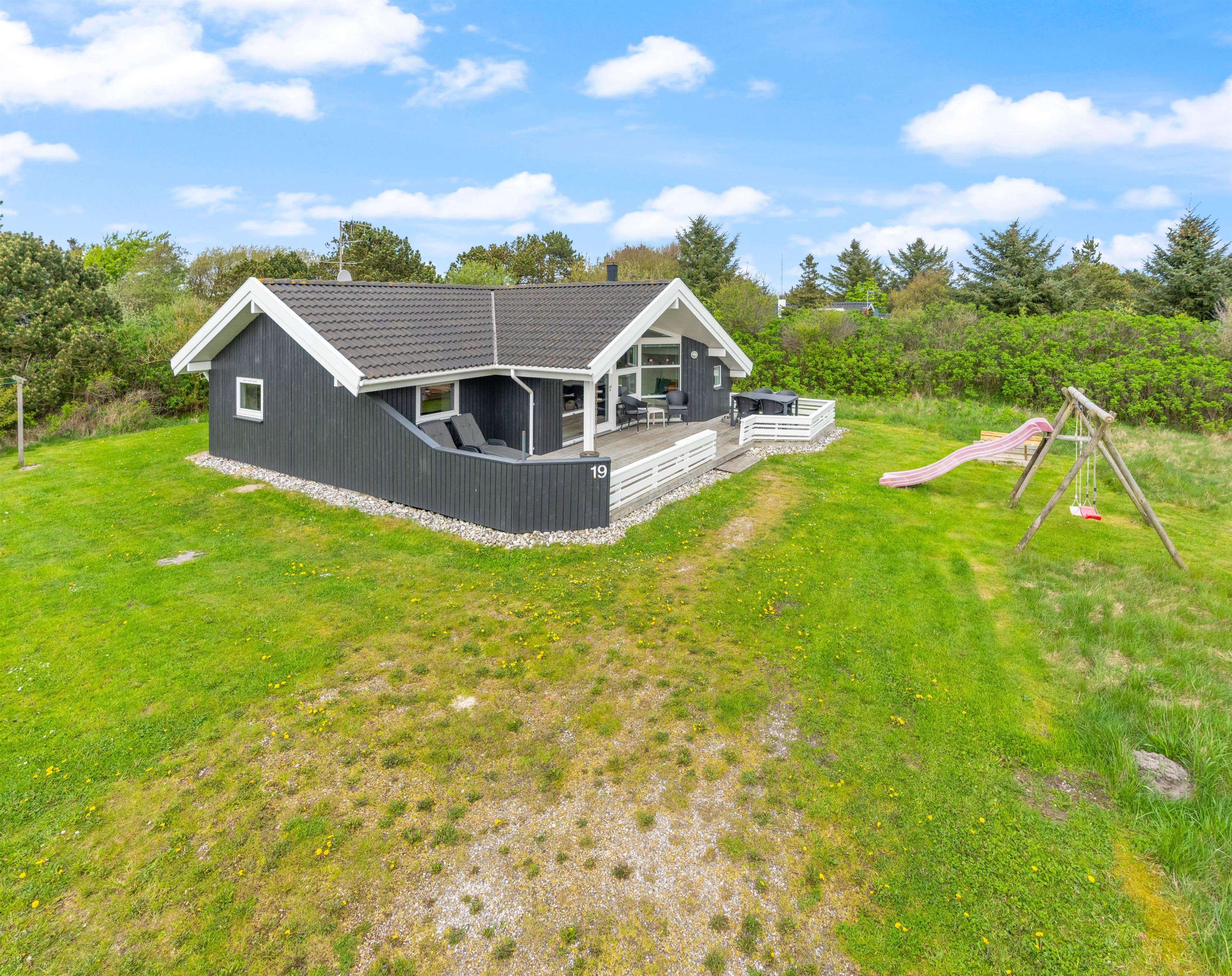 Åbn havelågen og træd ud på den fine grønne græsplæne. Her er plads til alt fra kongespil til boldspil med børn og hunde. Og der er også opstillet gynger og en sandkasse, som sikkert vil underholde de mindre børn. Mod nord er grunden afskærmet af træer og buske, så I kan nyde ferien i fred.