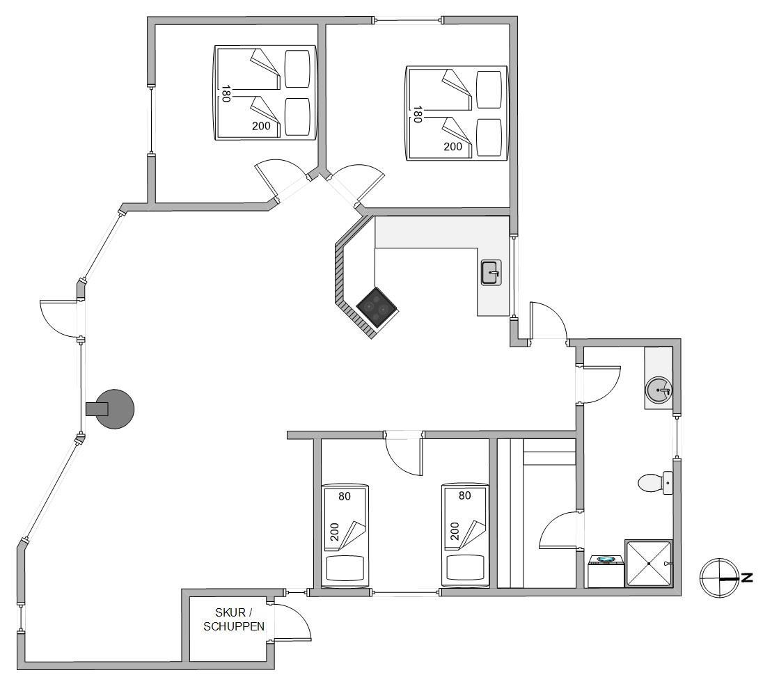 Sidst, men ikke mindst, har vi sommerhusets hjerterum stuen, der ligger i åben forbindelse med spiseområde og det velfungerende køkken. I det åbne køkken kan der kokkereres, mens resten af familien følger med fra stuen. Her kan I samle jer omkring et brætspil eller til filmhygge i sofaen, mens brændeovnen spreder hygge og varme. Den fine alkove er perfekt til en blunder, mens børnene vil elske at bygge hule her.