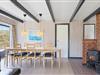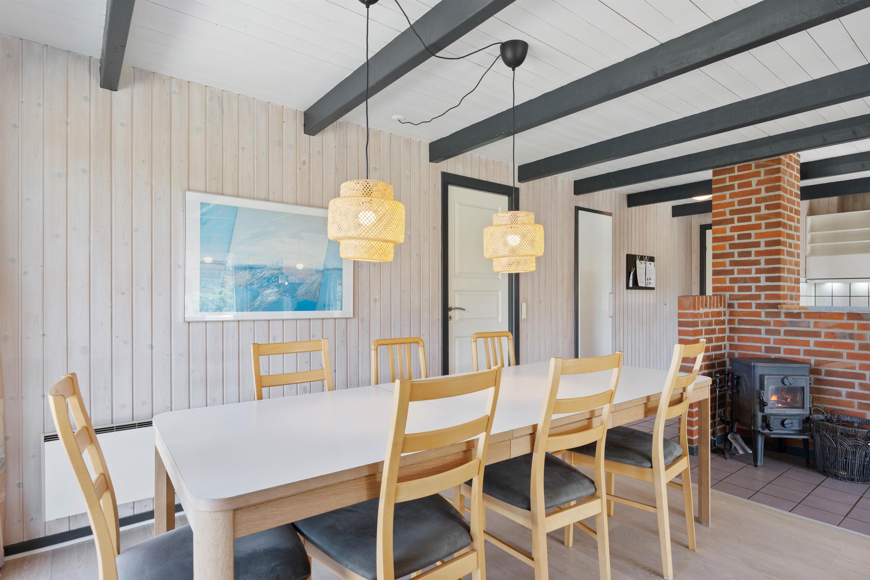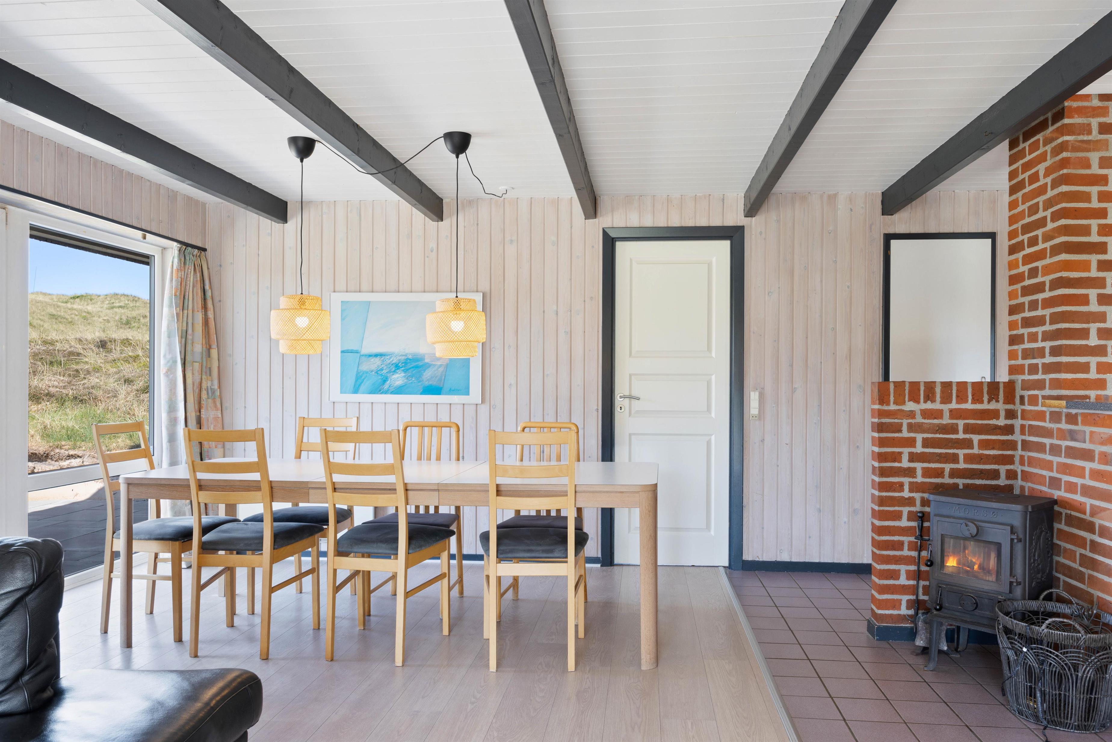 Det er et rummeligt og dejligt sommerhus med en hyggelig stemning i den store stue, hvor en rustik brændeovn luner og hygger. Køkkenet er i åben forbindelse med spiseafdelingen, hvor lyse vægge og trægulv gør et indbydende indtryk.