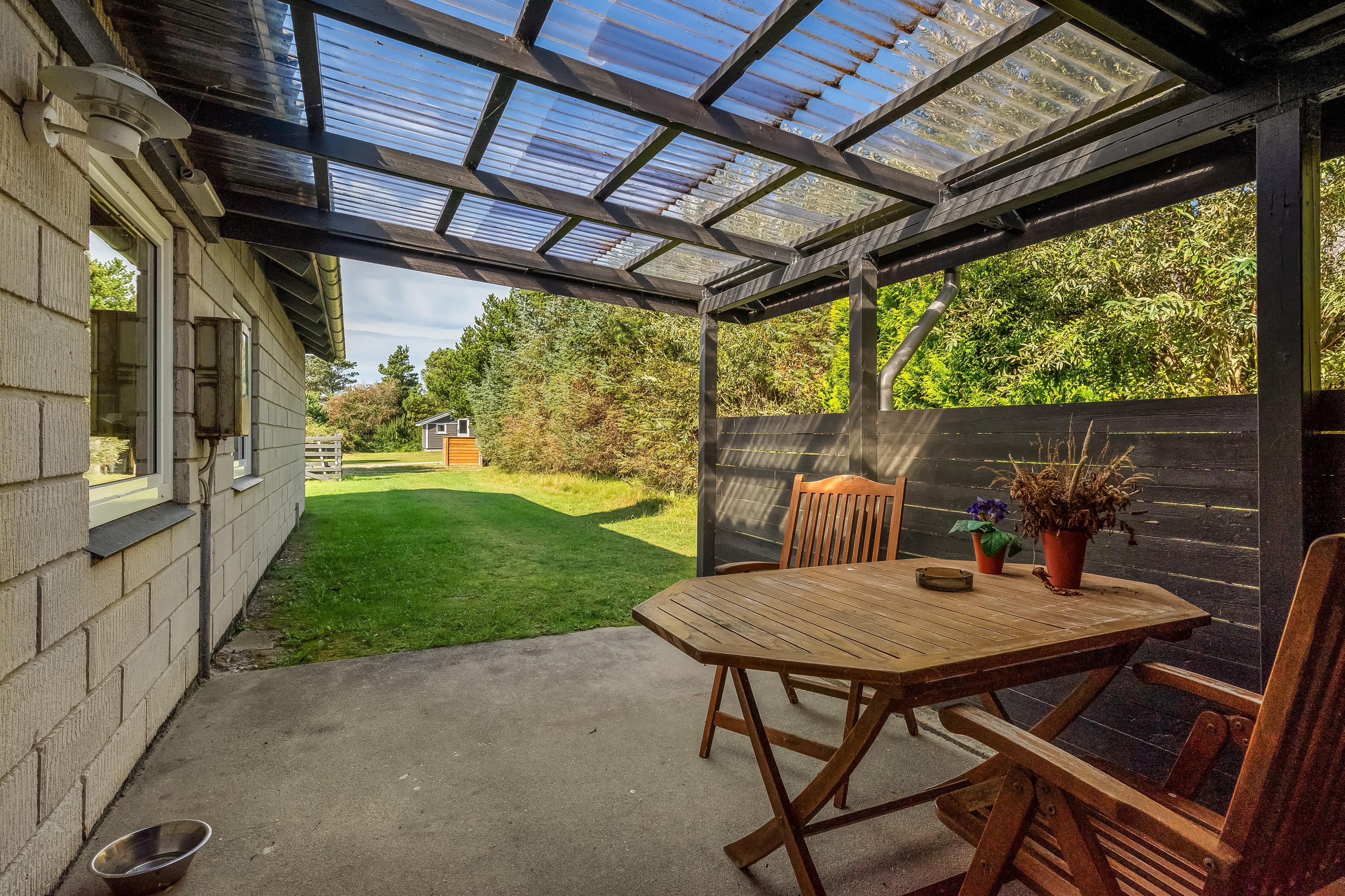 Udenfor er rig mulighed for at nyde solen og den friske luft. Her er en lukket terrasse, hvilket gør det muligt at lade hundene bevæge sig frit, mens I slapper af i liggestolene. Den overdækkede del af terrassen sikrer jer læ og er perfekt til morgenkaffen en stille forårsmorgen.