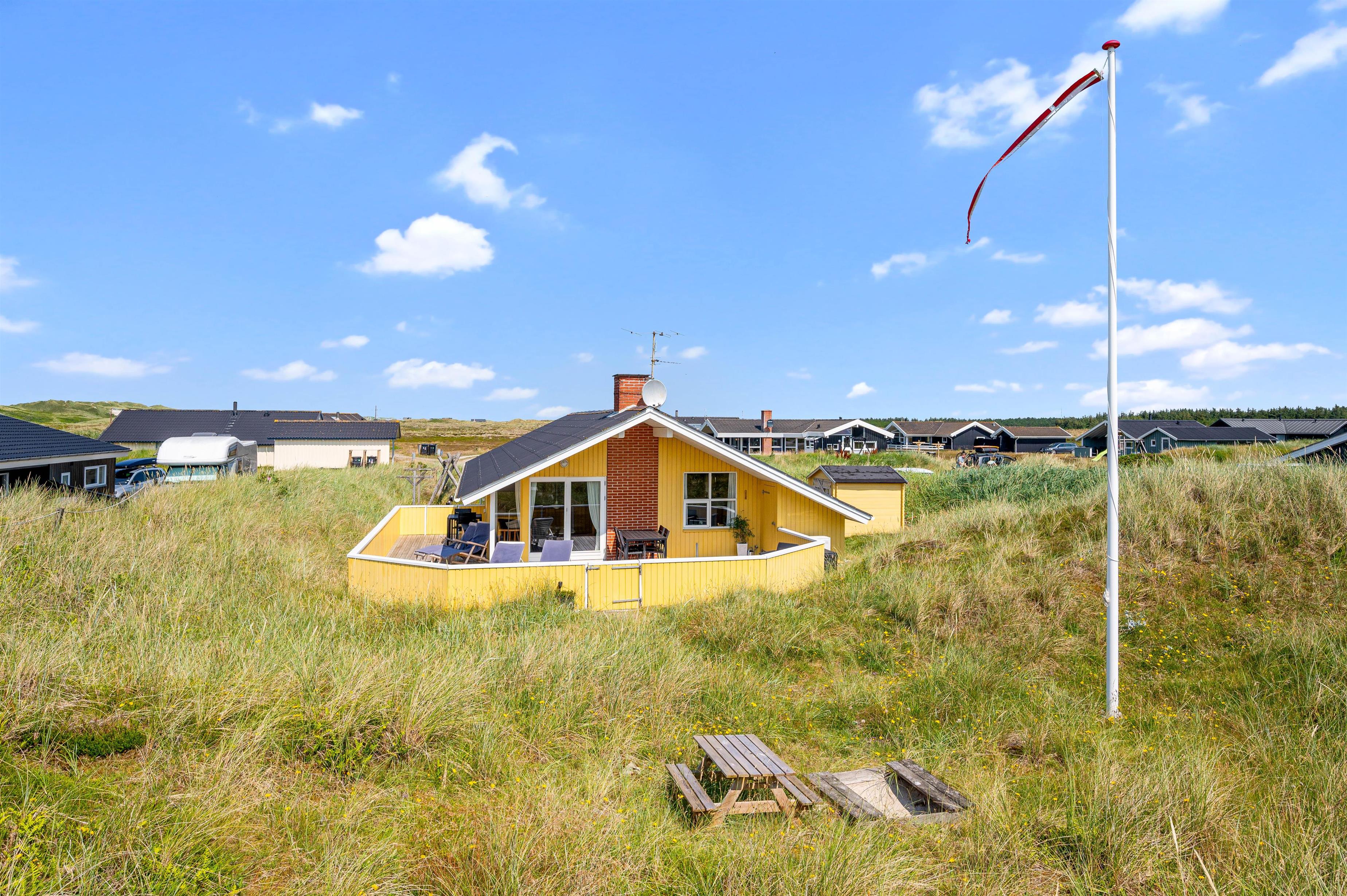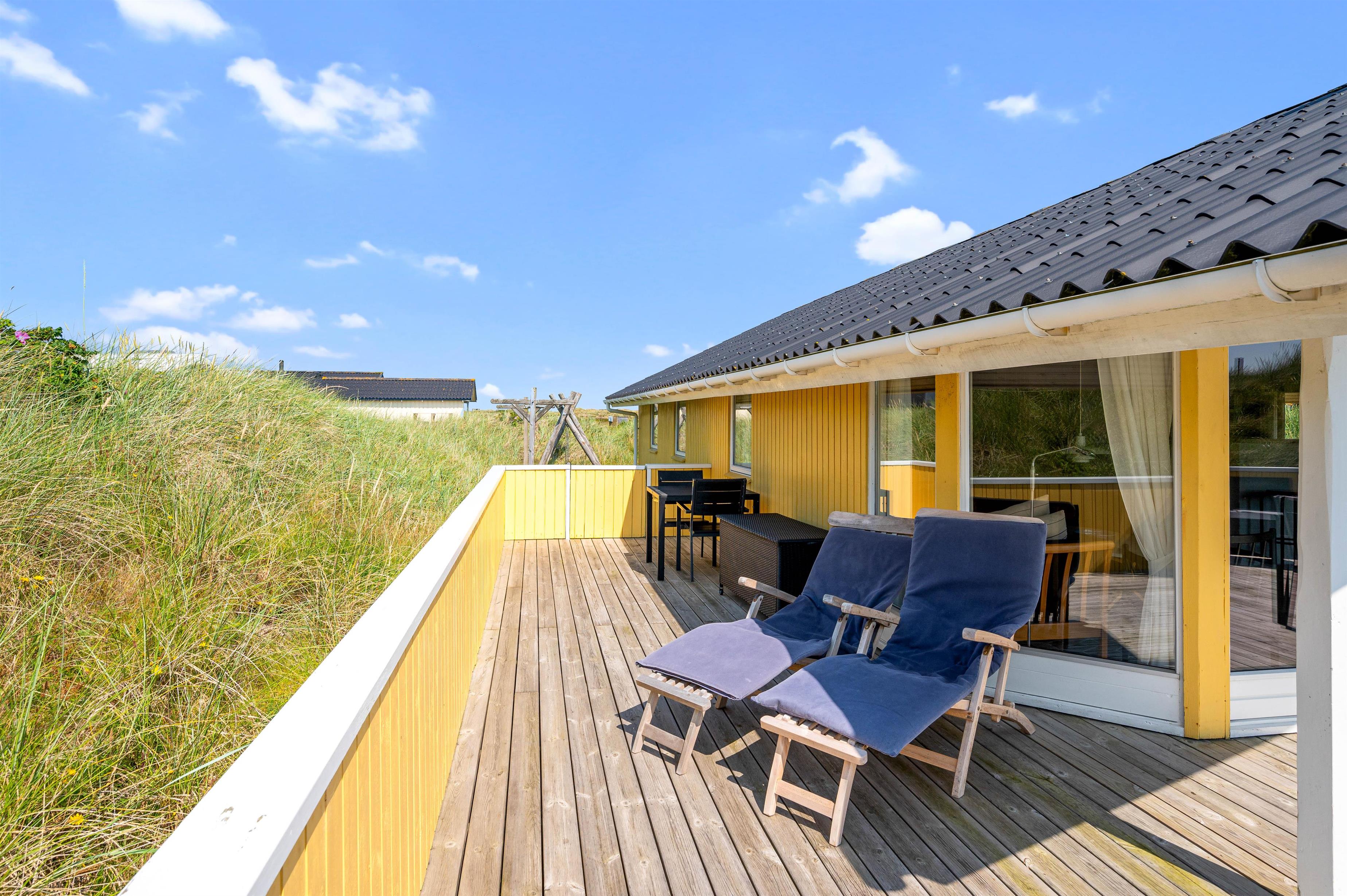 Dejlig lyst feriehus, med en helt særlig beliggenhed. På den ugenerte, delvist overdækkede terrasse mod syd giver klitterne på den kuperede naturgrund mulighed for en lækker afslappet ferie med base det fri.