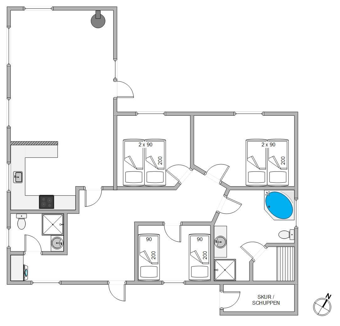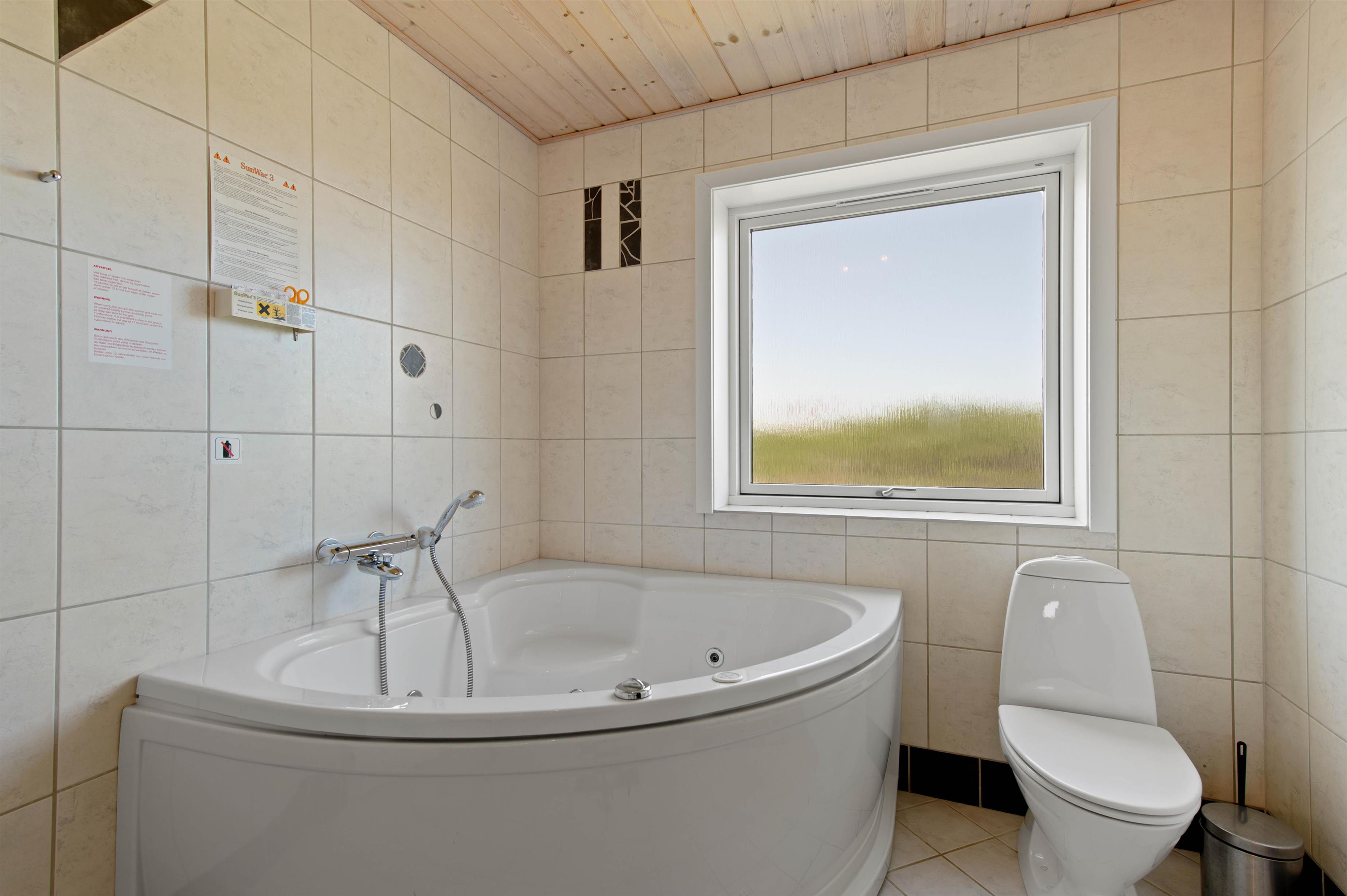 Rummeligt og særdeles velholdt byder sommerhuset dig velkommen. Der er en pæn indgang med garderobe og vaskesøjle samt indgang til lille gæstetoilet med bruseniche. Det store, flotte badeværelse er indrettet med spabad, bruser, gulvvarme og har indgang til sauna. Her kan I rigtig slappe af i løbet af ferien efter gode gåture i det naturskønne område.