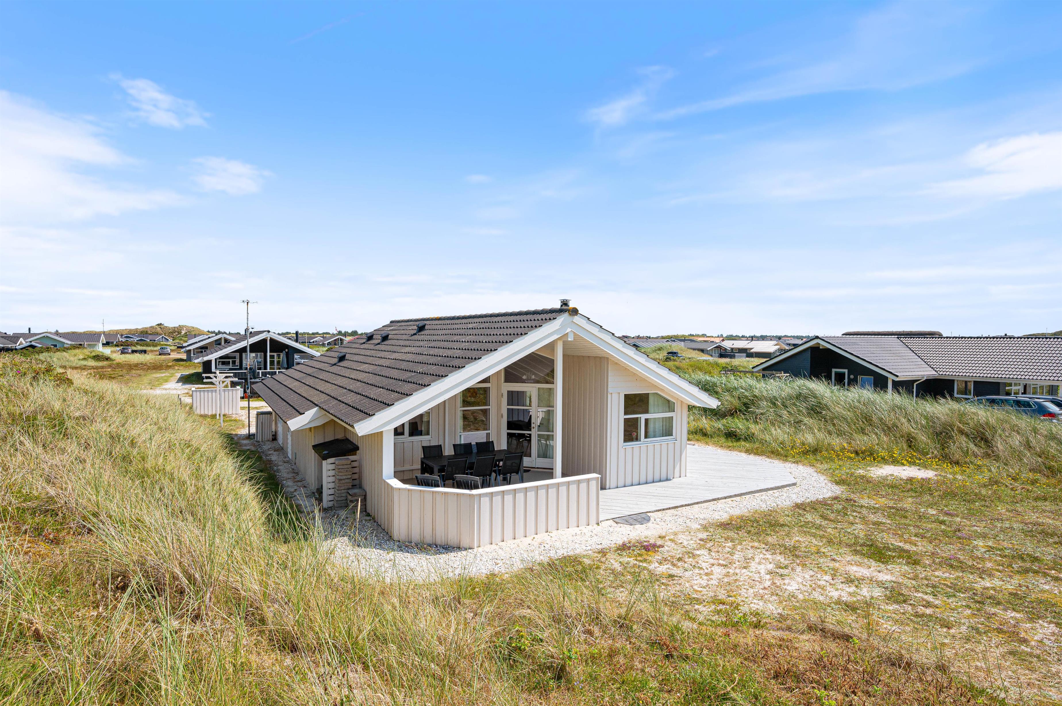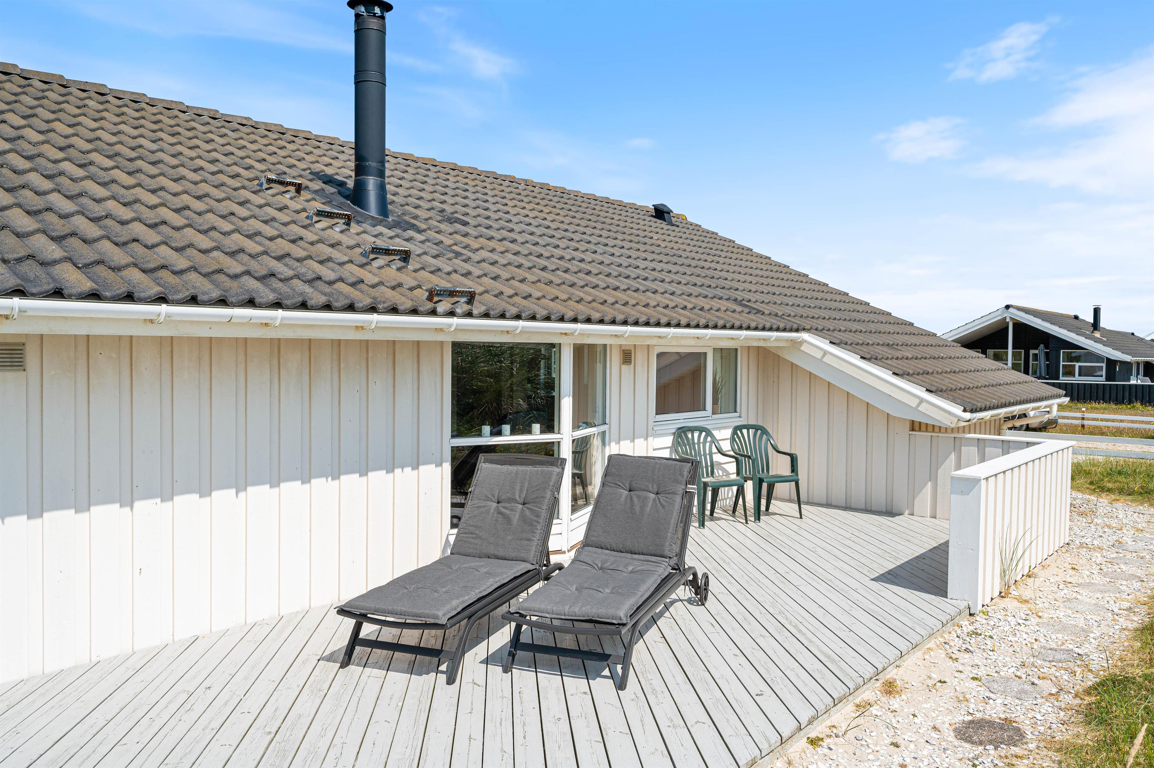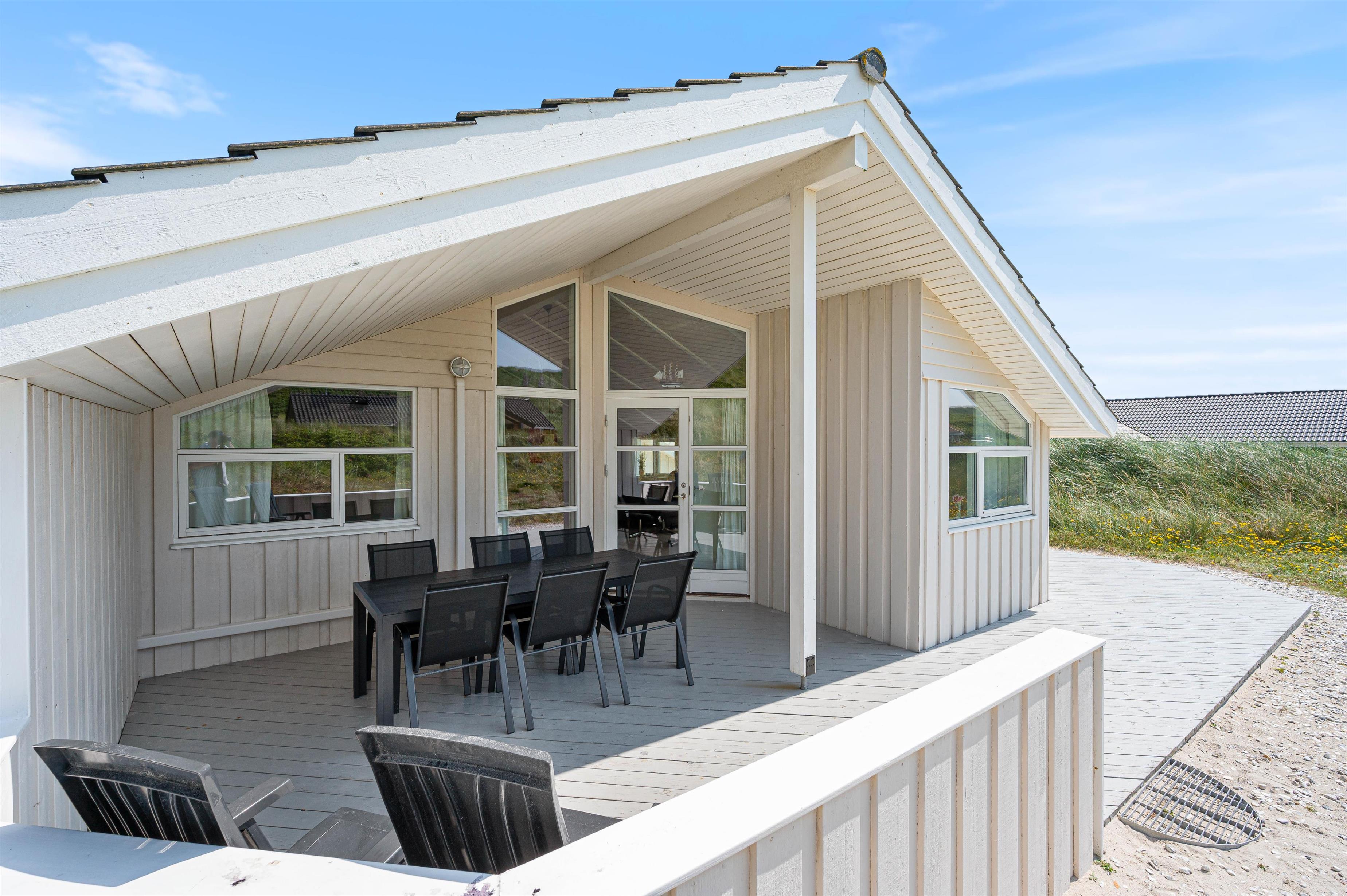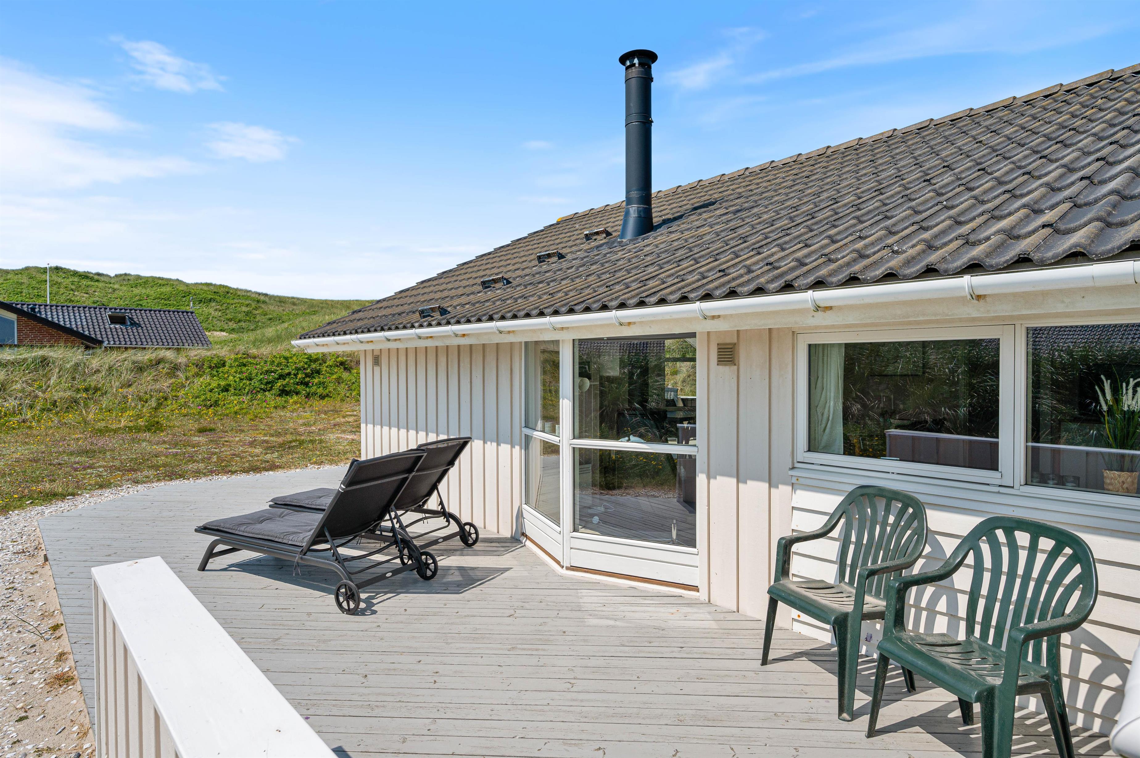 Sommerhuset har den perfekte beliggenhed, hvis du vil holde en ferie, hvor natur og afslapning er centrum. Feriehuset ligger på en dejlig naturgrund direkte ved stranden og det smukke Vesterhav. Mod vest kan du slappe af og nyde havets brusen på en dejlig overdækket terrasse, og også mod syd kan du slappe af på liggestolen på den åbne træterrasse.