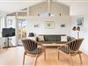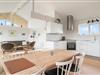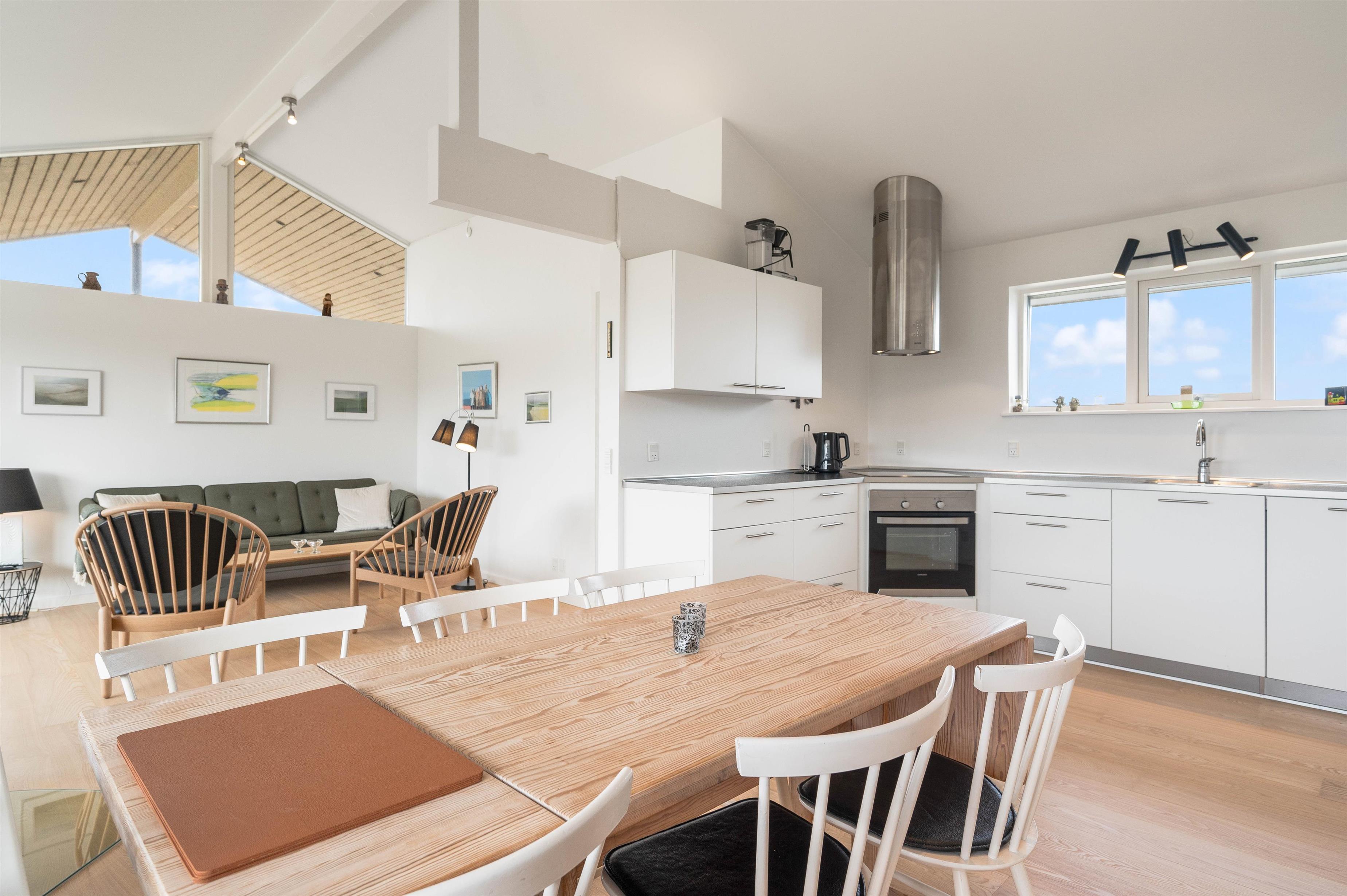 Huset er dejlig lyst og godt indrettet med åben køkken-opholdsrum, som er det centrale i huset. Her er hyggeligt og indbydende med godt lysindfald fra de store vinduespartier. Fra køkkenafdelingen kan man nemt følge med i samtalen i stuen, og her kan man, måske især på kolde dage, også hygge med en kop kaffe og en god bog foran brændeovnen, og lytte til havets brusen og den knitrende ild.