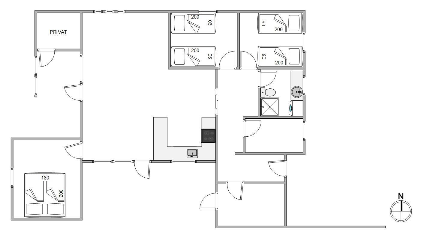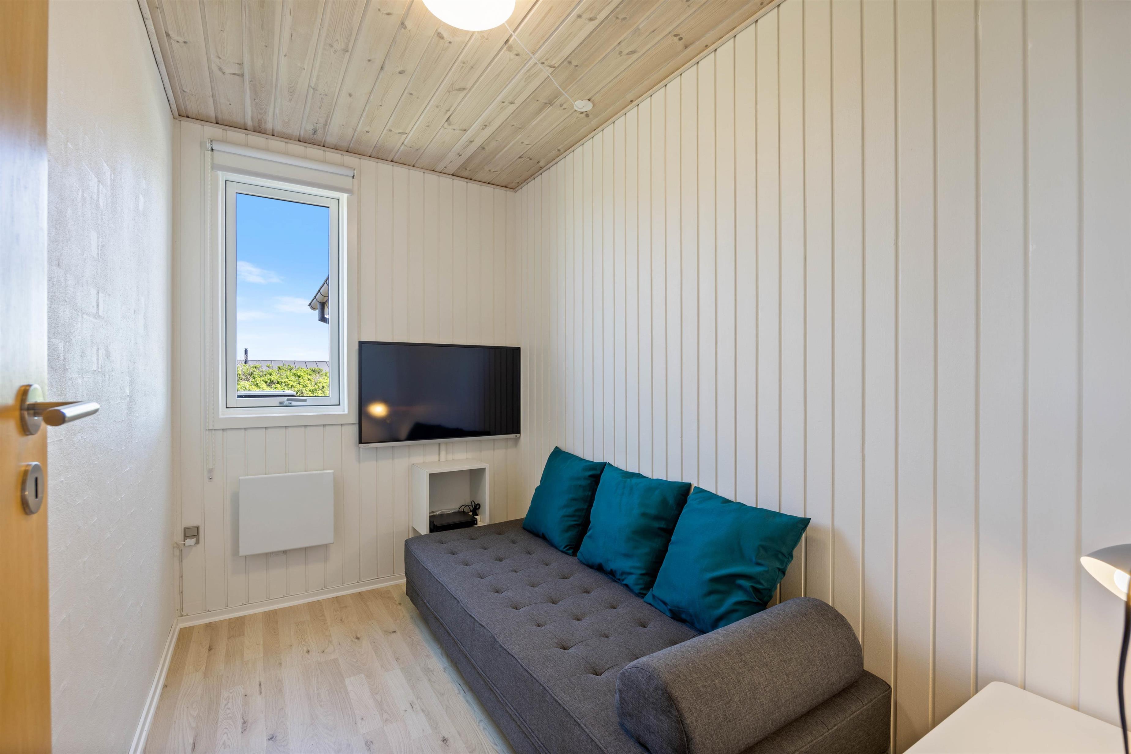 Feriehuset er indrettet til 6 personer, fordelt på 3 soverum, samt et mindre værelse med fladskærm med chromecast og dvd-afspiller. Der er ikke tv-kanaler på dette TV og værelset er ideelt til legeværelse for børn. Det flotte og praktiske badeværelse er naturligvis med gulvvarme – og desuden en vaskemaskine, hvilket nok især småbørnsfamilierne vil sætte pris på. Indgangen byder på meget plads til overtøj og barnevogne.
