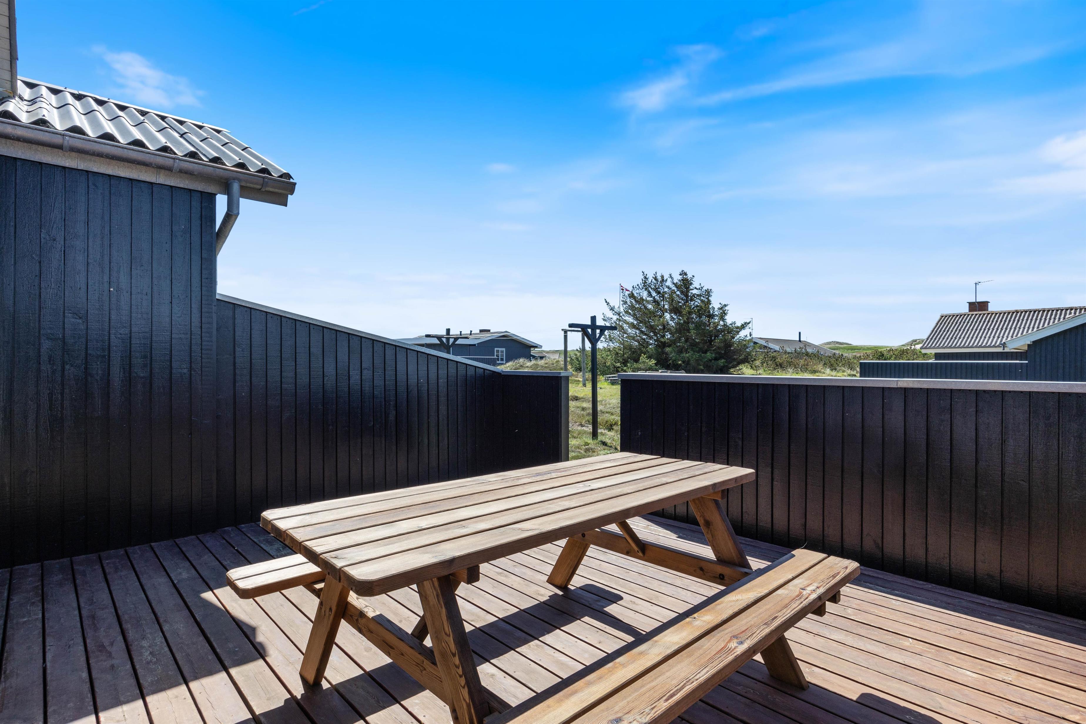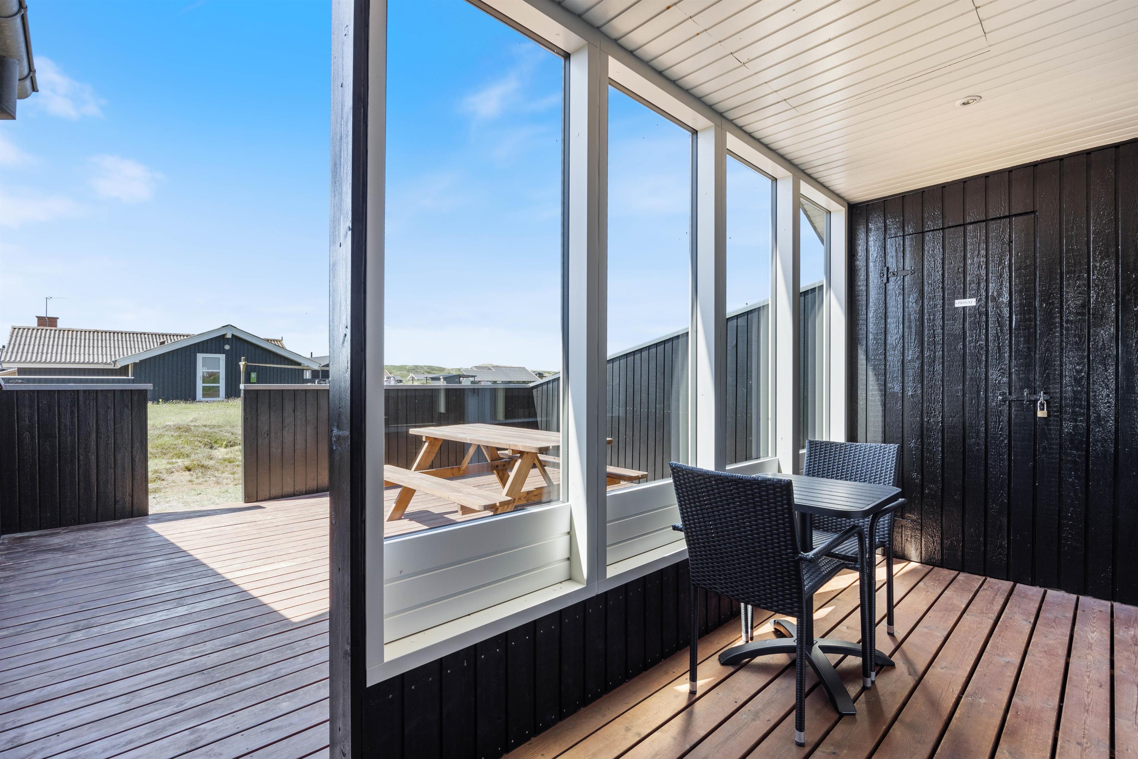 De lukkede og delvist overdækkede terrasser med masser af læ inviterer til masser af udeliv omkring sommerhuset. Nyd en lækker grillmiddag på den sydvestvendte terrasse, alt imens I ser solen gå ned over klitterne, med havets salte duft og brusen i baggrunden.
