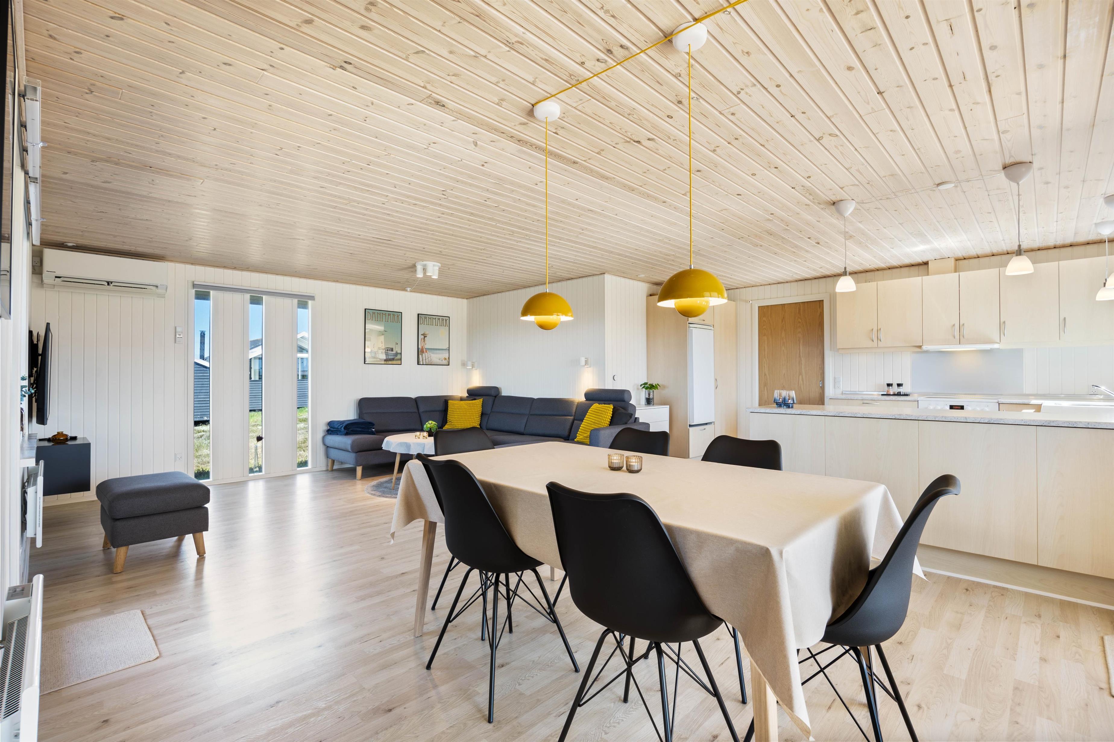 Opholdsrummet har også en god, stor spiseplads og en hyggelig stor sofa, hvor I kan hygge inden døre med 55'' Smart TV med chromecast. Vil I høre musik, kan I benytte bluetooth-enheden i feriehuset – måske imens I dyster i diverse familiespil.