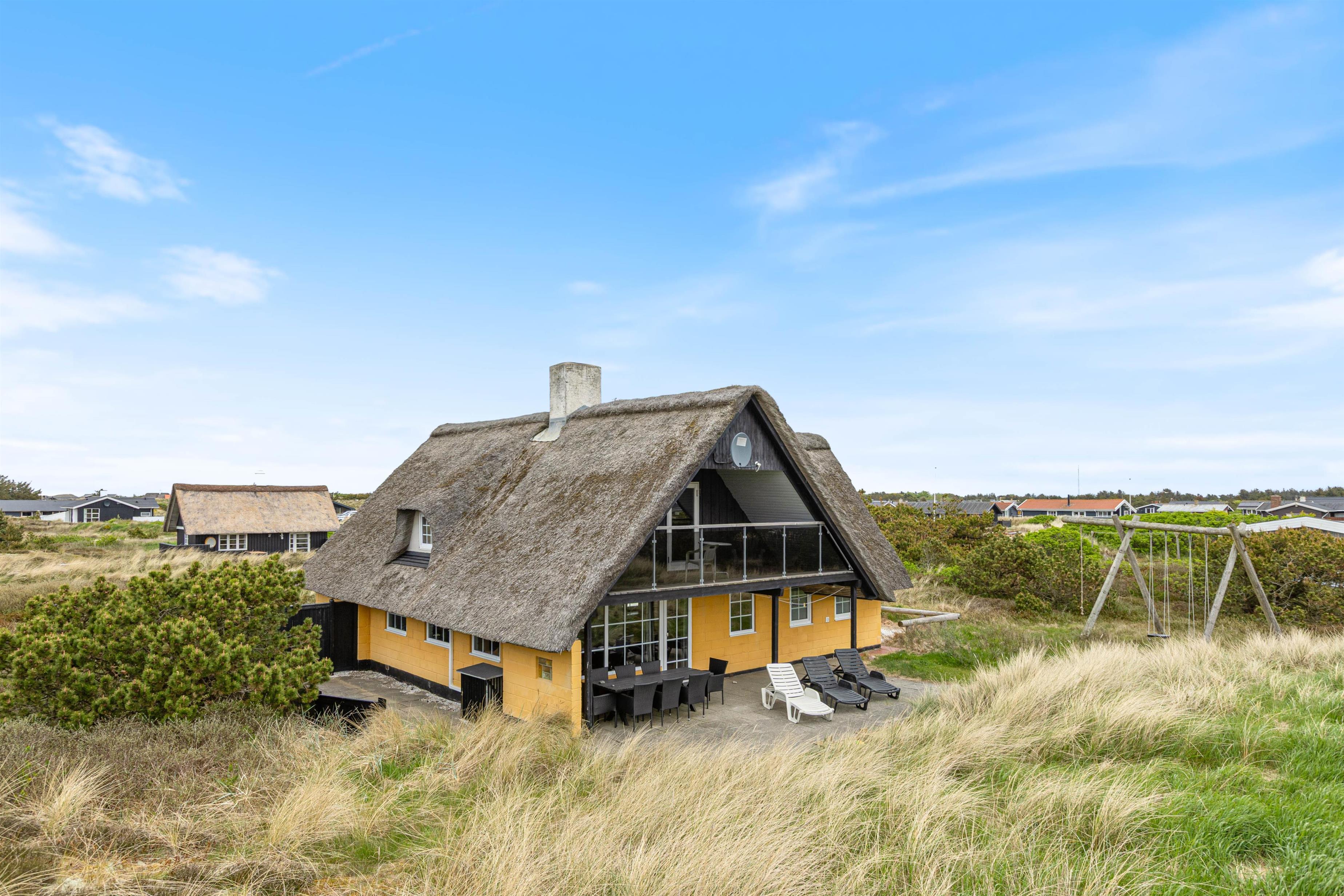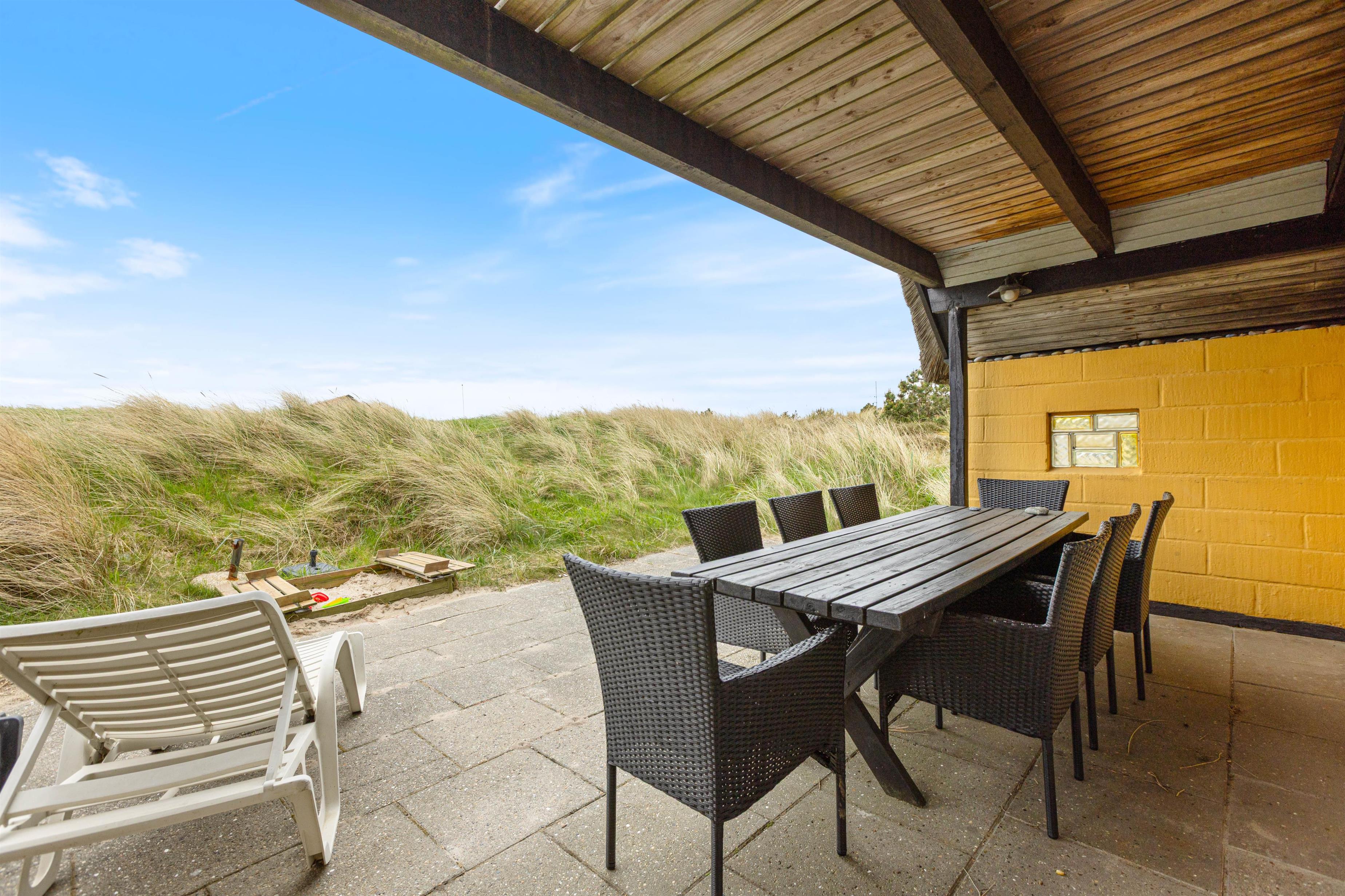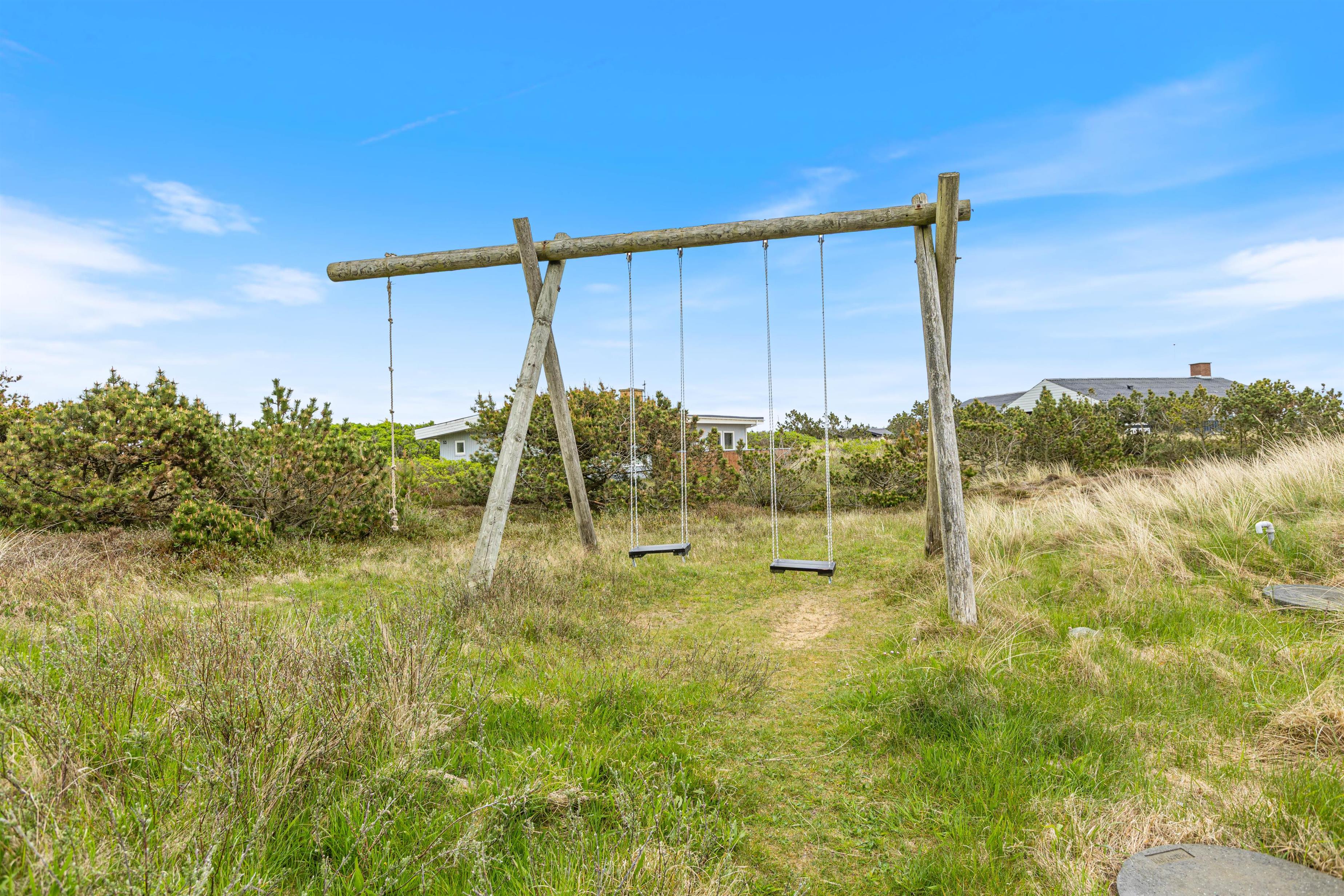 Sommerhuset har en naturlig afskærmet terrasse mod syd, som er udstyret med havemøbler, liggestole og grill. På grunden er der desuden opstillet gynge og sandkasse til de mindste, så de kan brænde krudt af, mens I nyder en kop kaffe i det gode vejr. Fra terrassen har I god udsigt til ’haven’, så I kan holde øje med børnene.