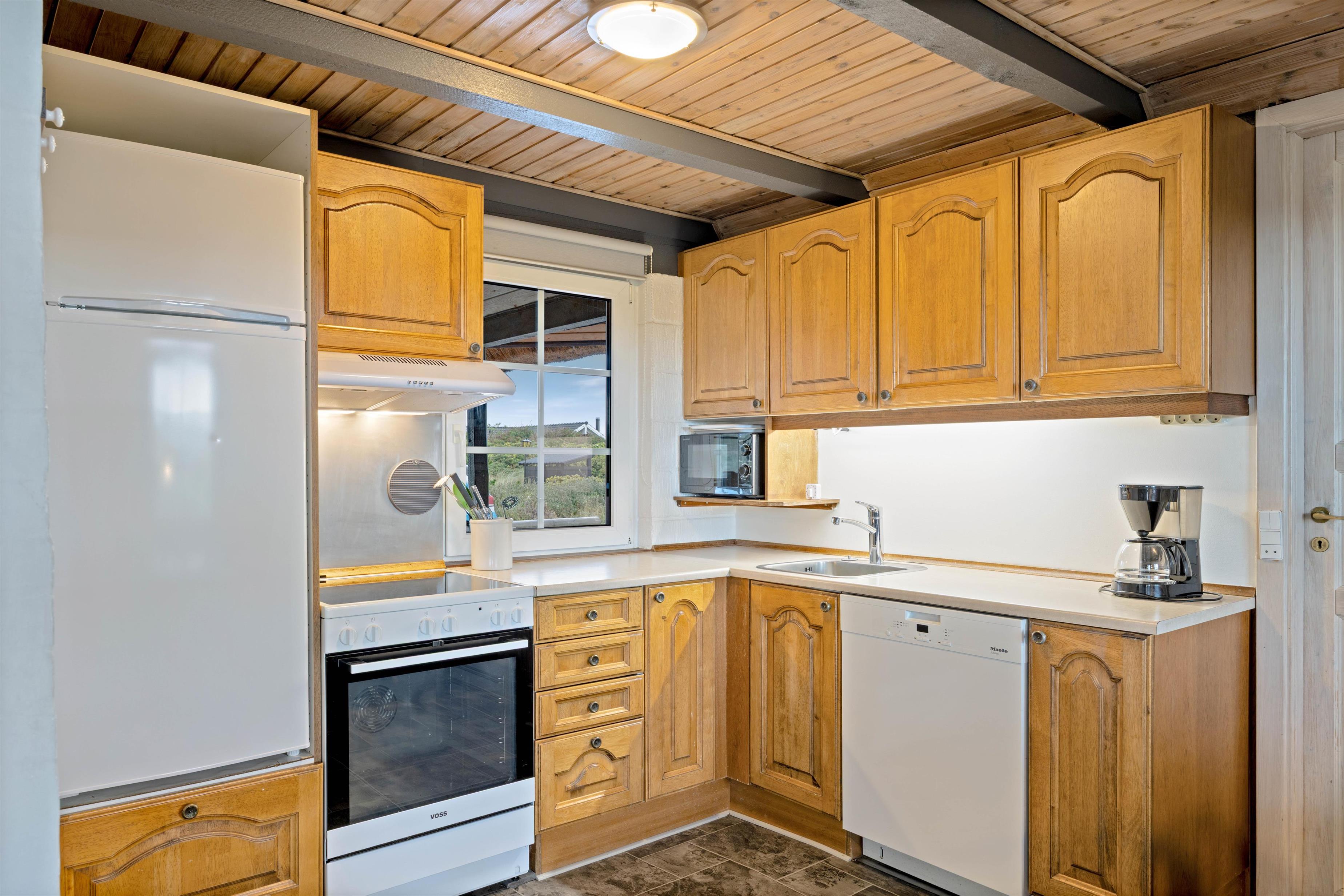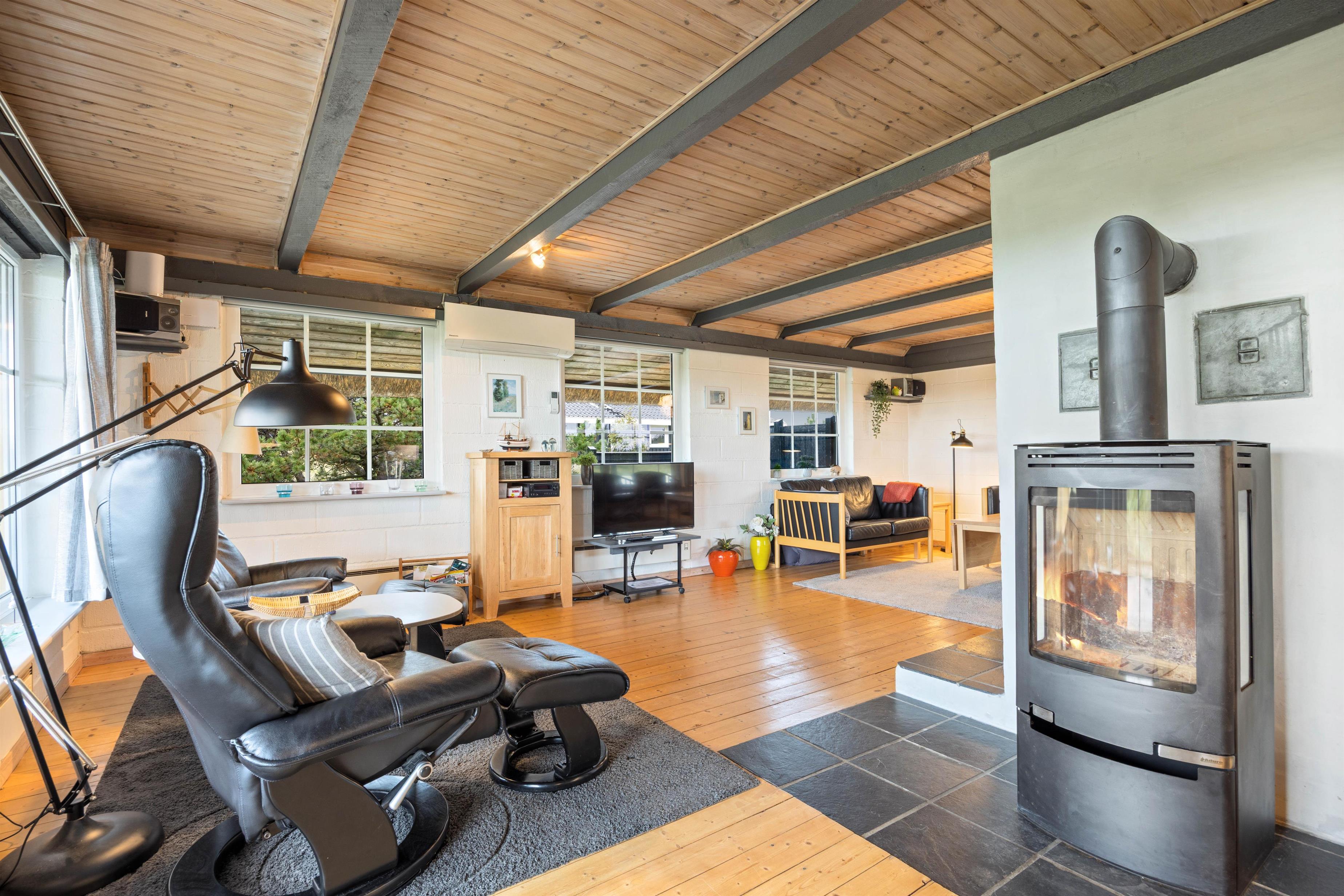 Ved spisestuen står brændeovnen centralt placeret, og i stuen kan I tænde op i den åbne pejs. Stuen har trægulv og er hyggeligt indrettet med magelige møbler. Feriehuset har en gratis trådløs internetforbindelse, du skal blot medbringe din bærbare computer og mobiltelefon.