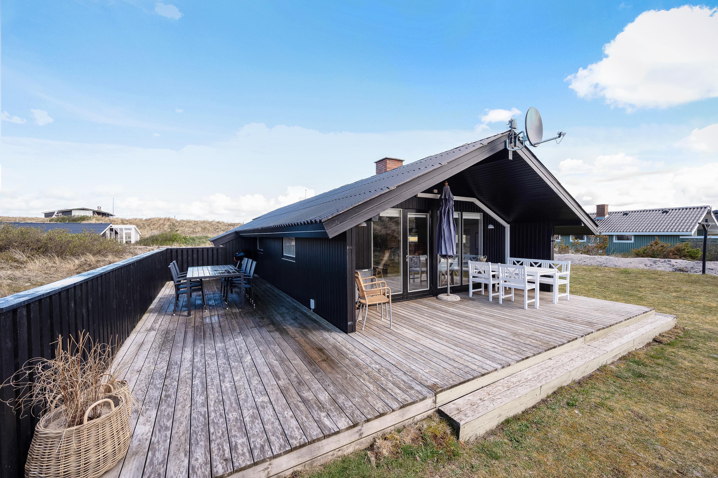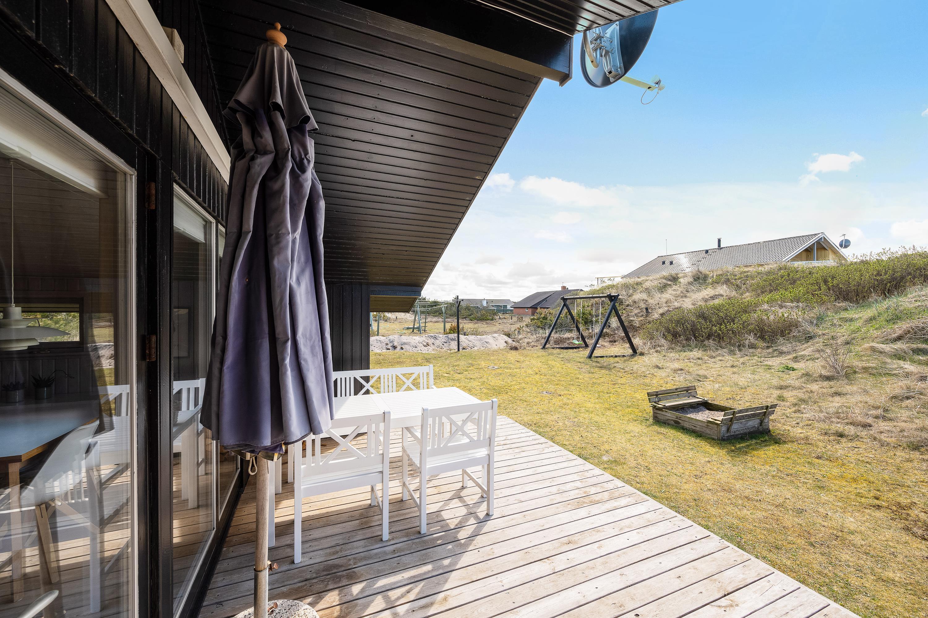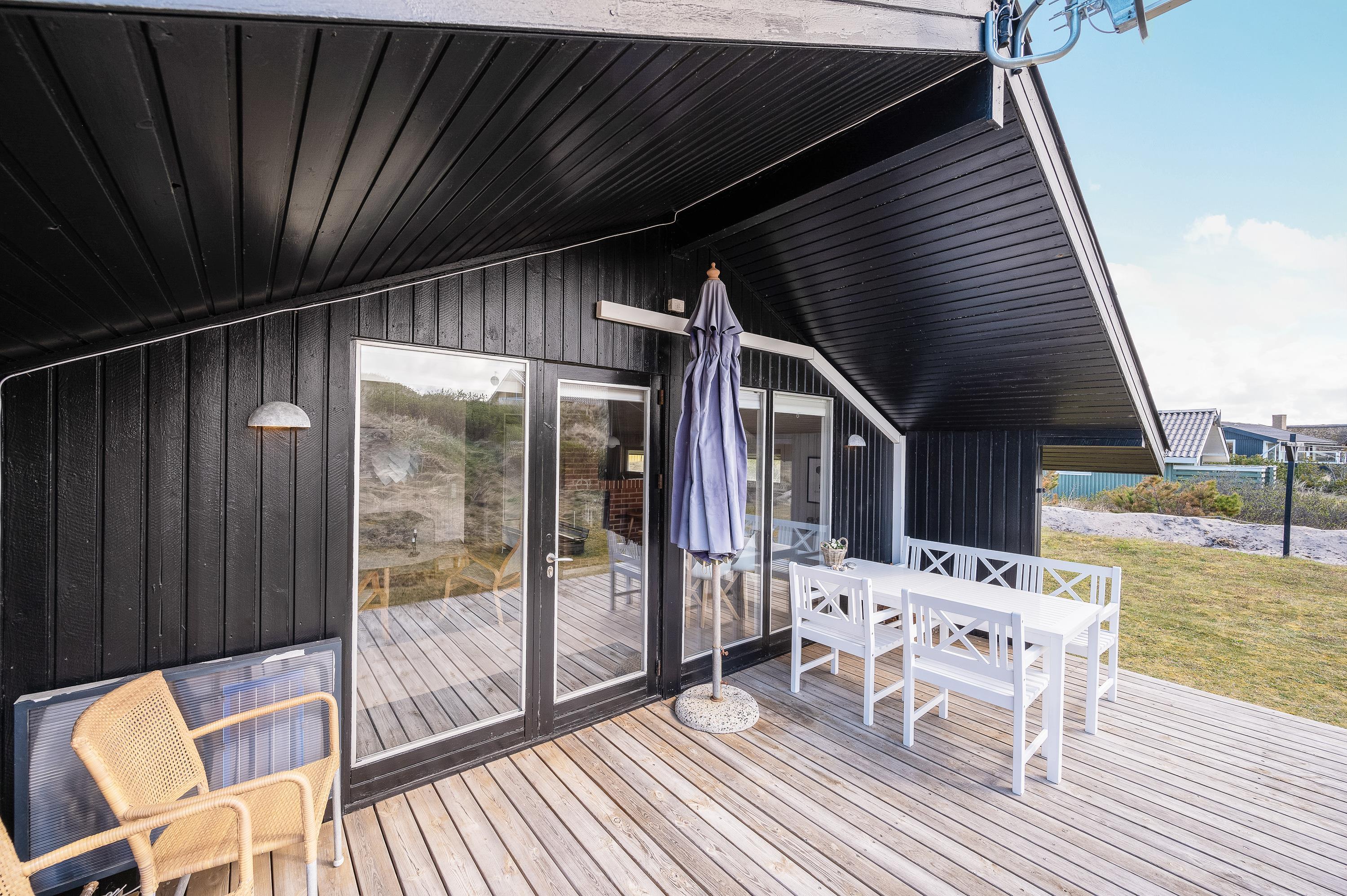 Med direkte udgang fra det hyggelige opholdsrum kommer I til den sydvendte træterrasse, som både er afskærmet og delvist overdækket. Terrassen fortsætter til vestsiden af sommerhuset, hvor I kan nyde den sidste aftensol. På den mindre terrasse mod nordvest kan I også finde en plads i skyggen på en varm sommerdag.