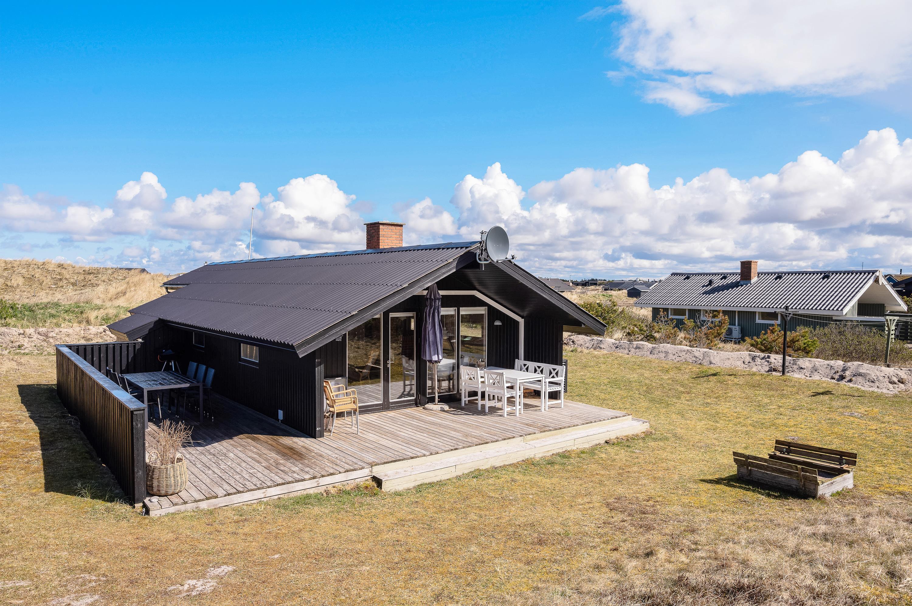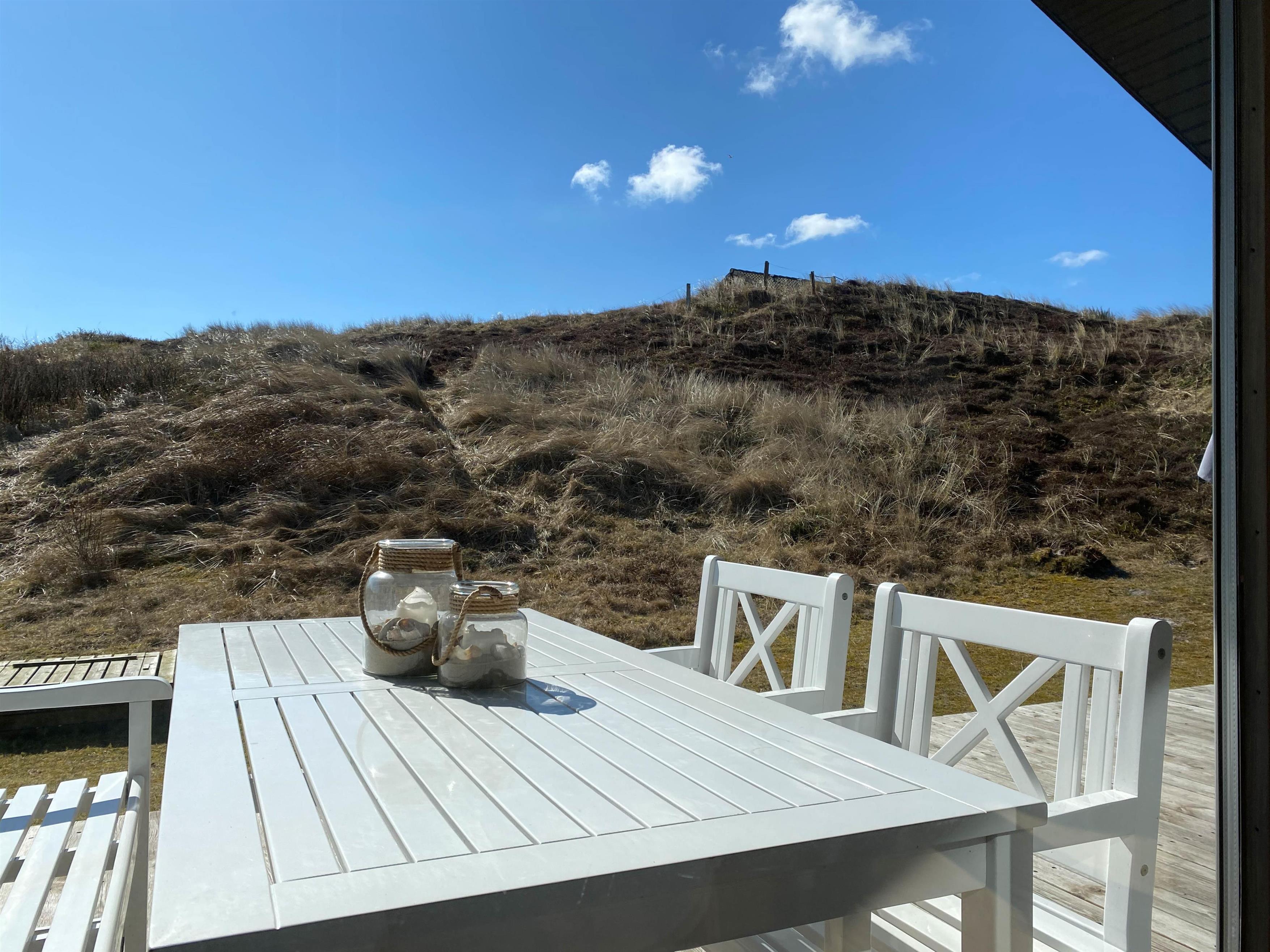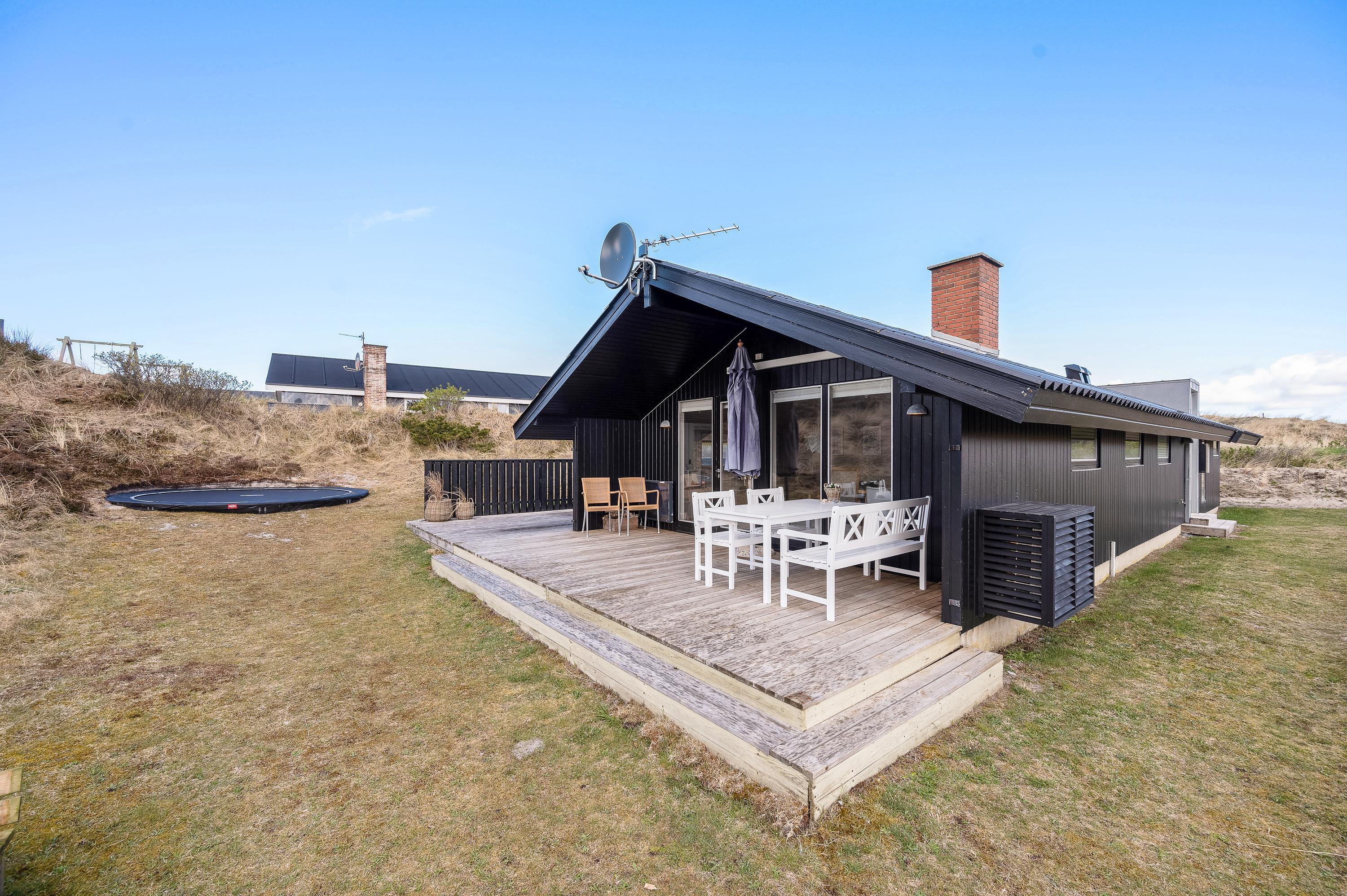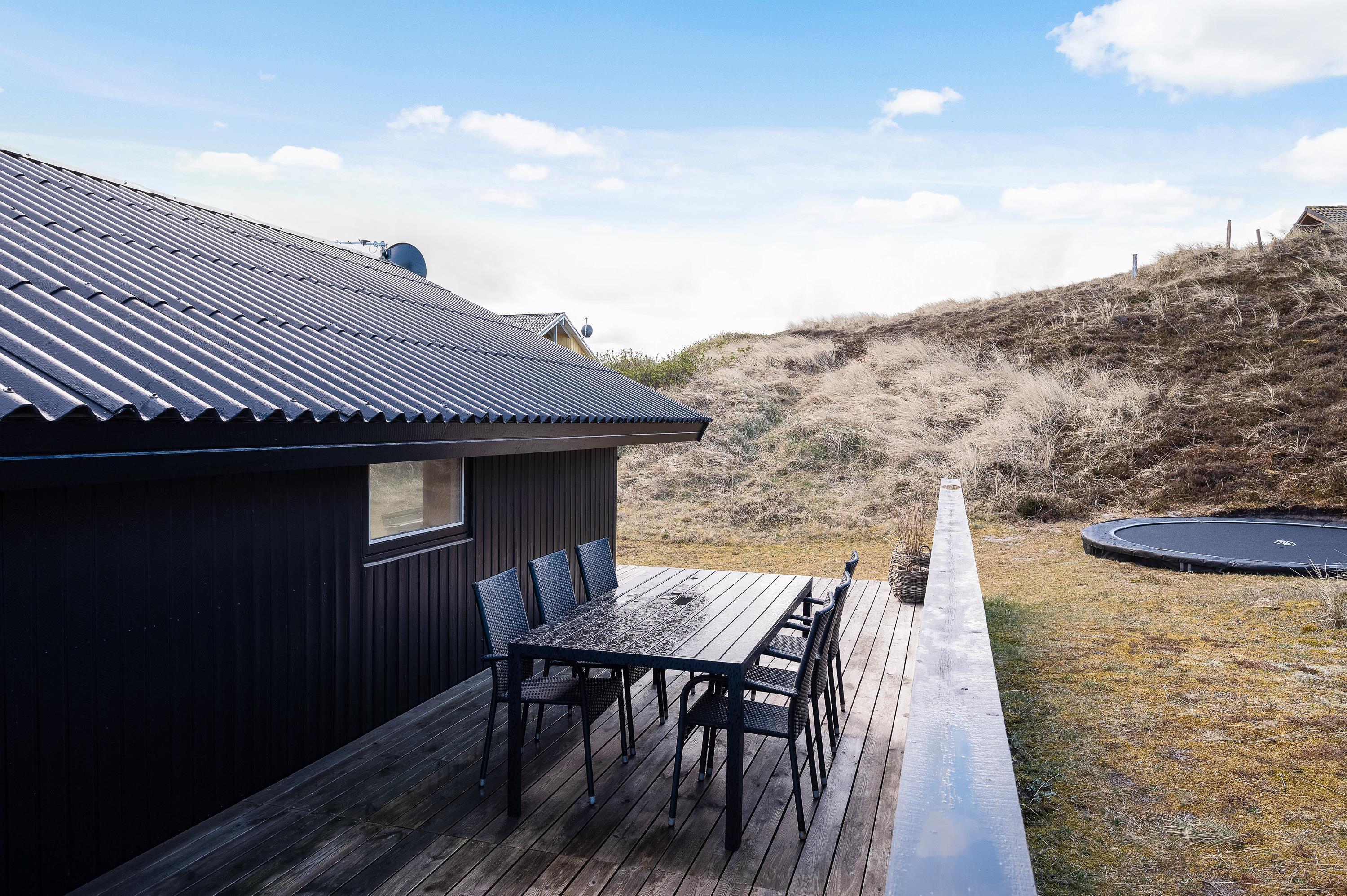 Med direkte udgang fra det hyggelige opholdsrum kommer I til den sydvendte træterrasse, som både er afskærmet og delvist overdækket. Terrassen fortsætter til vestsiden af sommerhuset, hvor I kan nyde den sidste aftensol. På den mindre terrasse mod nordvest kan I også finde en plads i skyggen på en varm sommerdag.