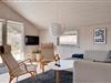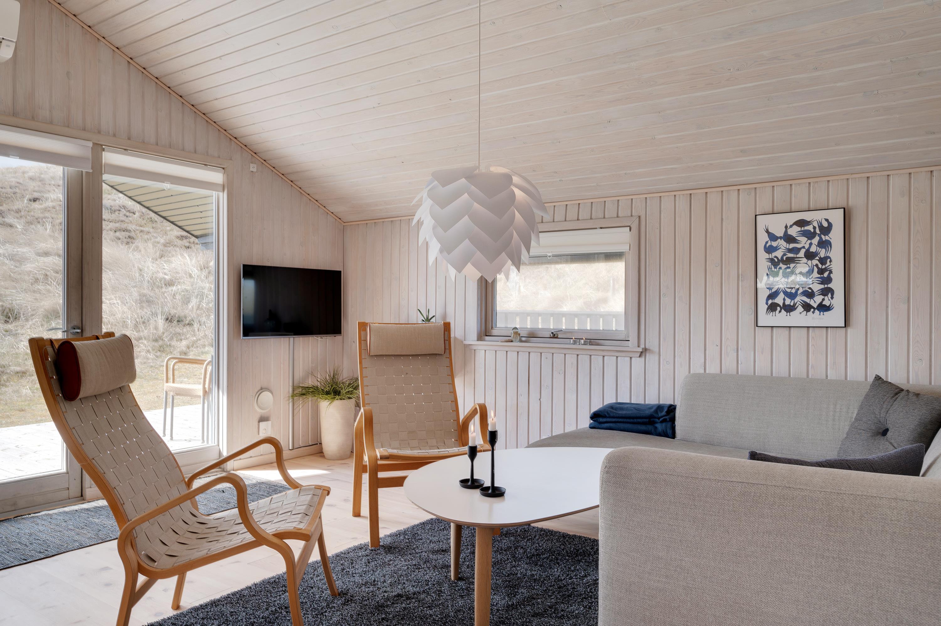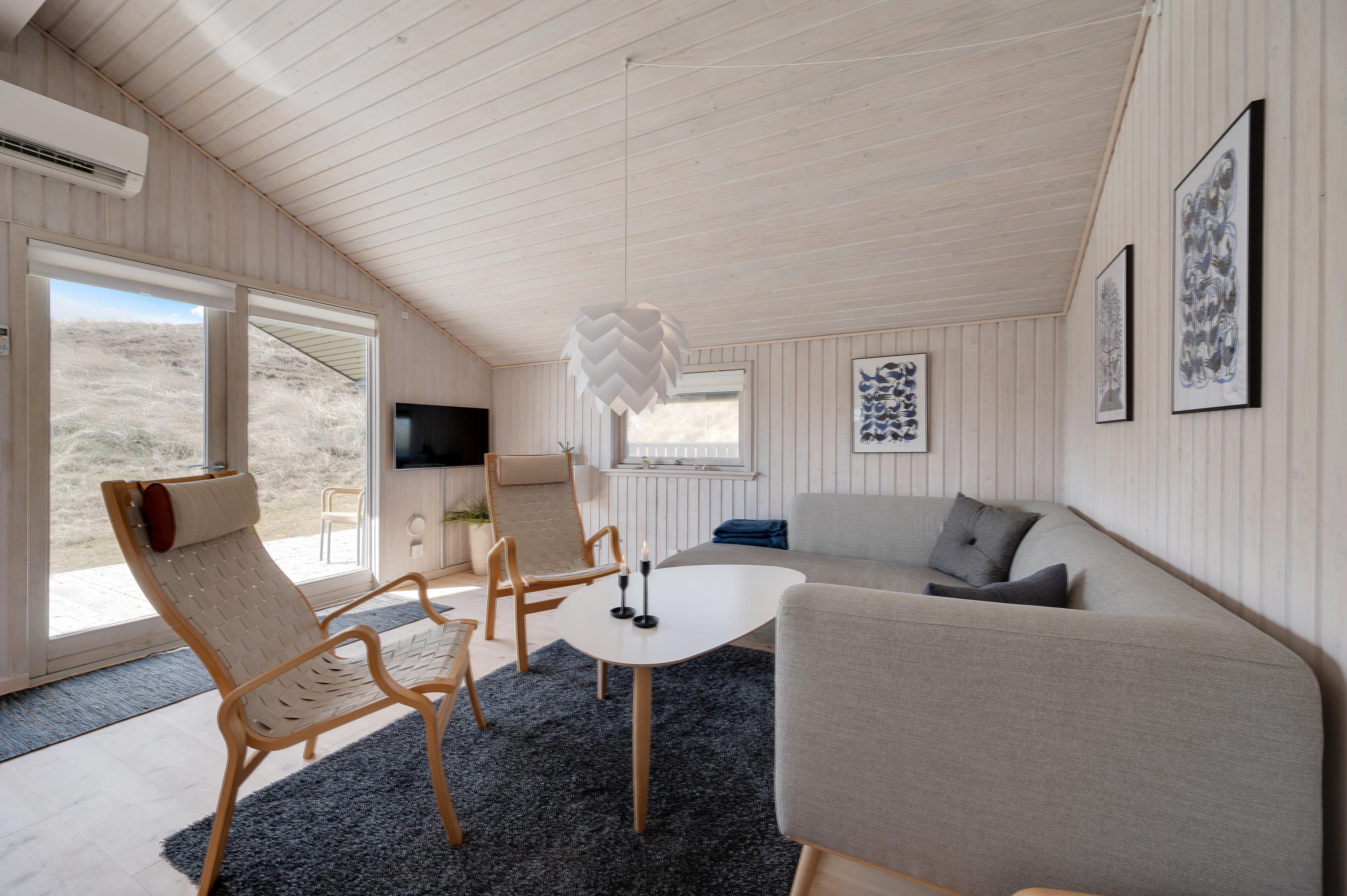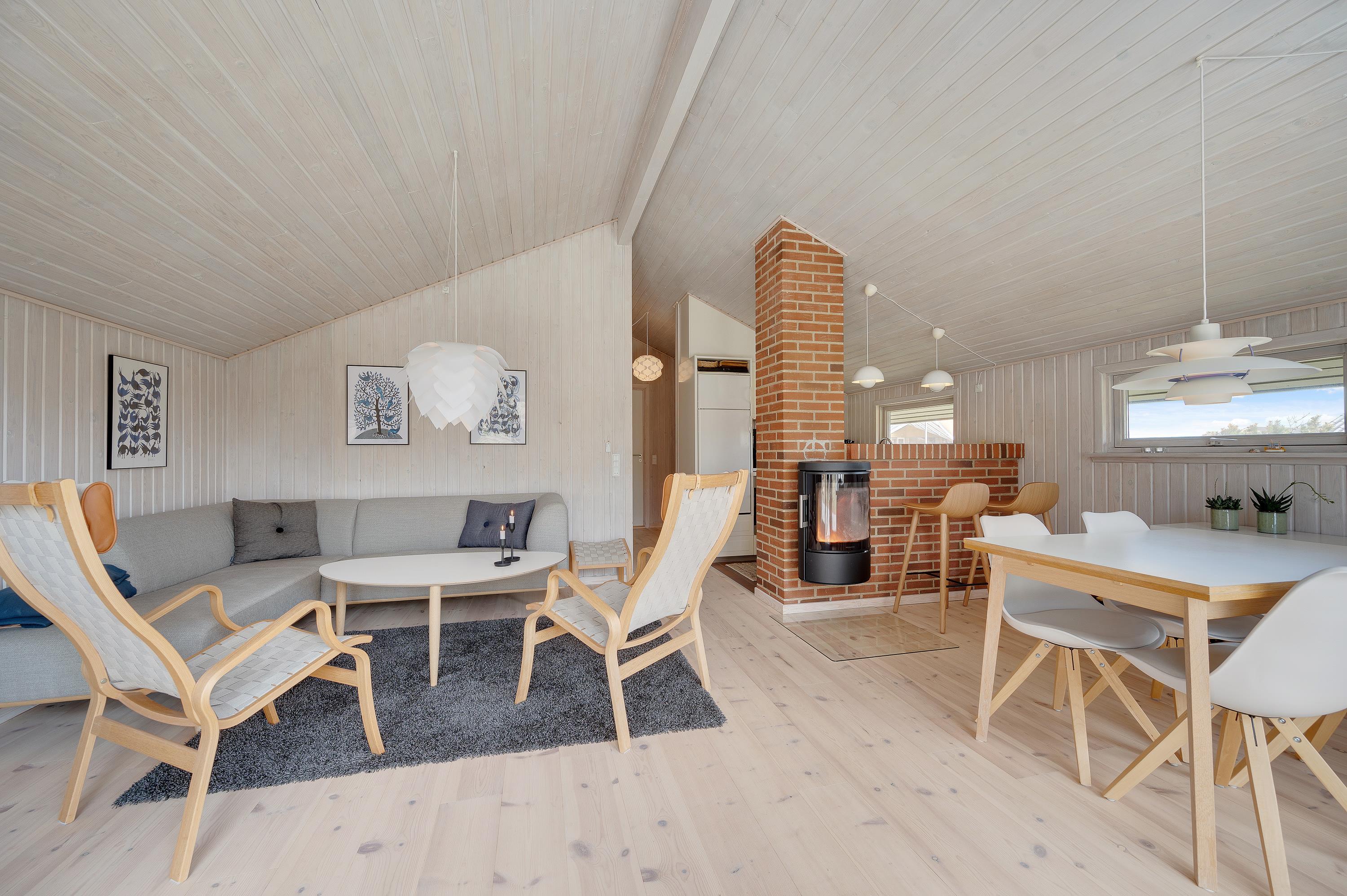 Det store og lyst indrettede opholdsrum er sommerhusets hjerte. Her er køkken og stue i åben forbindelse, så de yngste i familien kan lege og spille under opsyn i stuen, imens de voksne tilbereder et lækkert aftensmåltid i køkkenet.