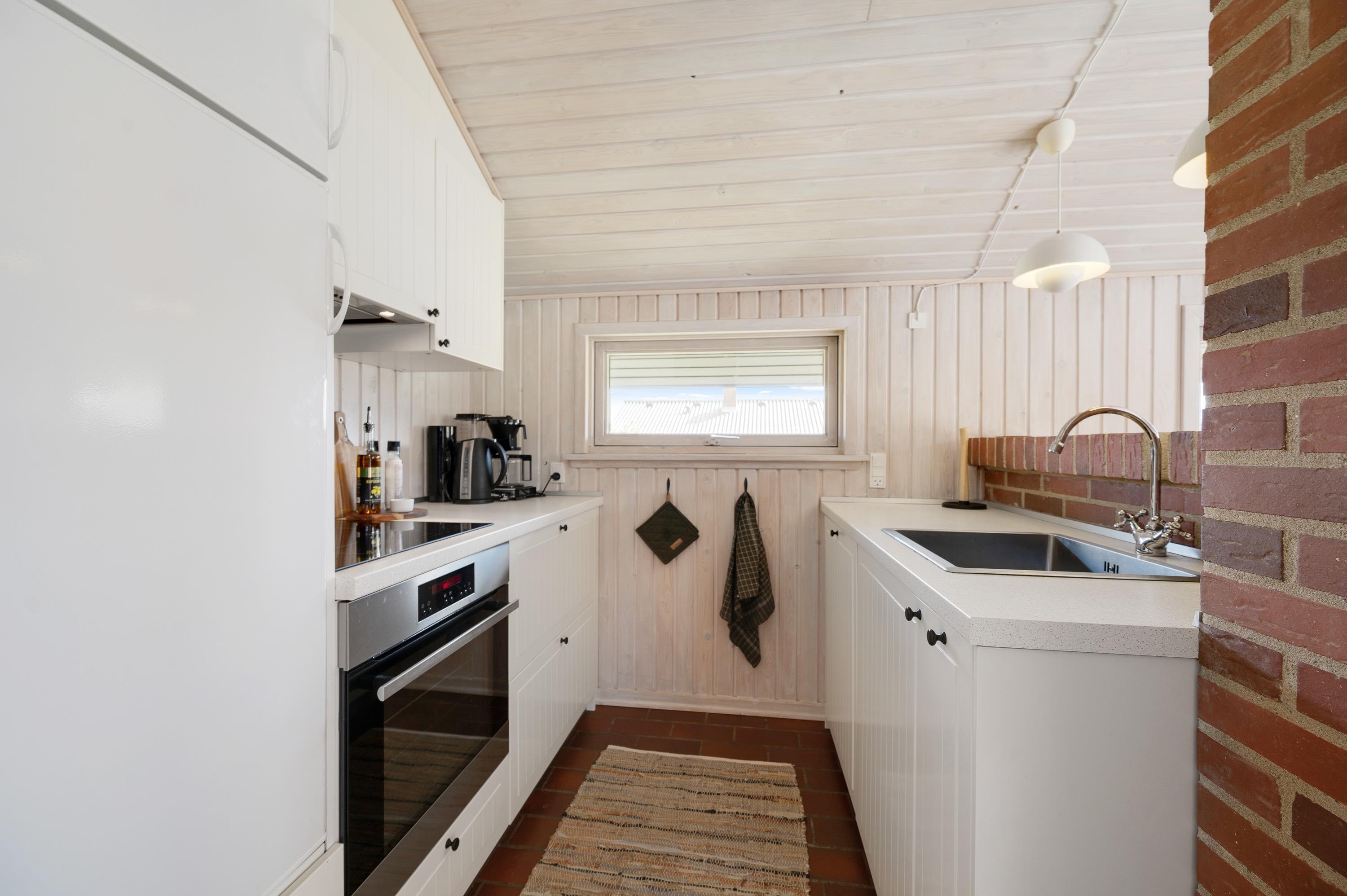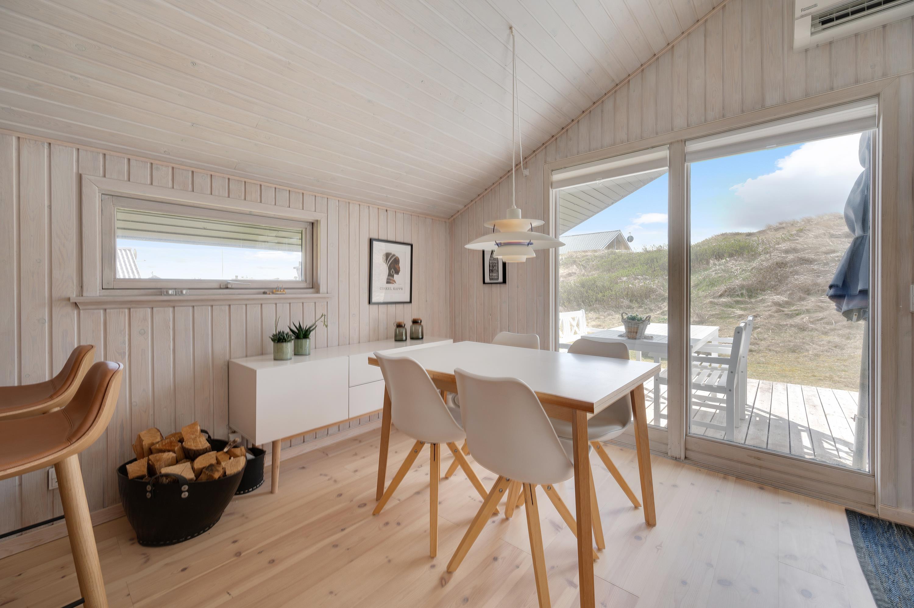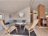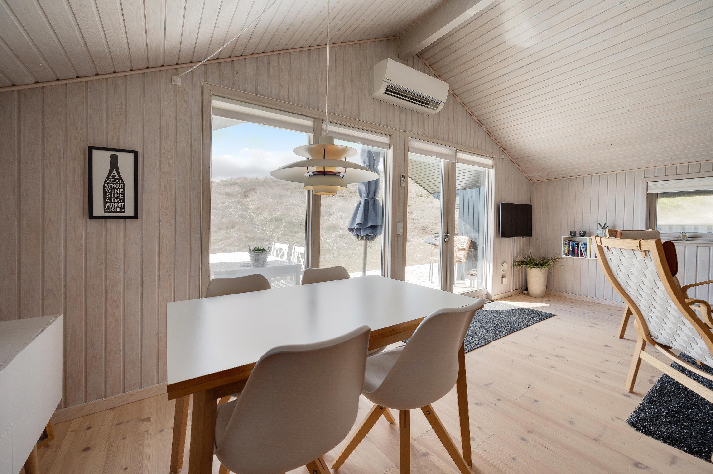Det store og lyst indrettede opholdsrum er sommerhusets hjerte. Her er køkken og stue i åben forbindelse, så de yngste i familien kan lege og spille under opsyn i stuen, imens de voksne tilbereder et lækkert aftensmåltid i køkkenet.
