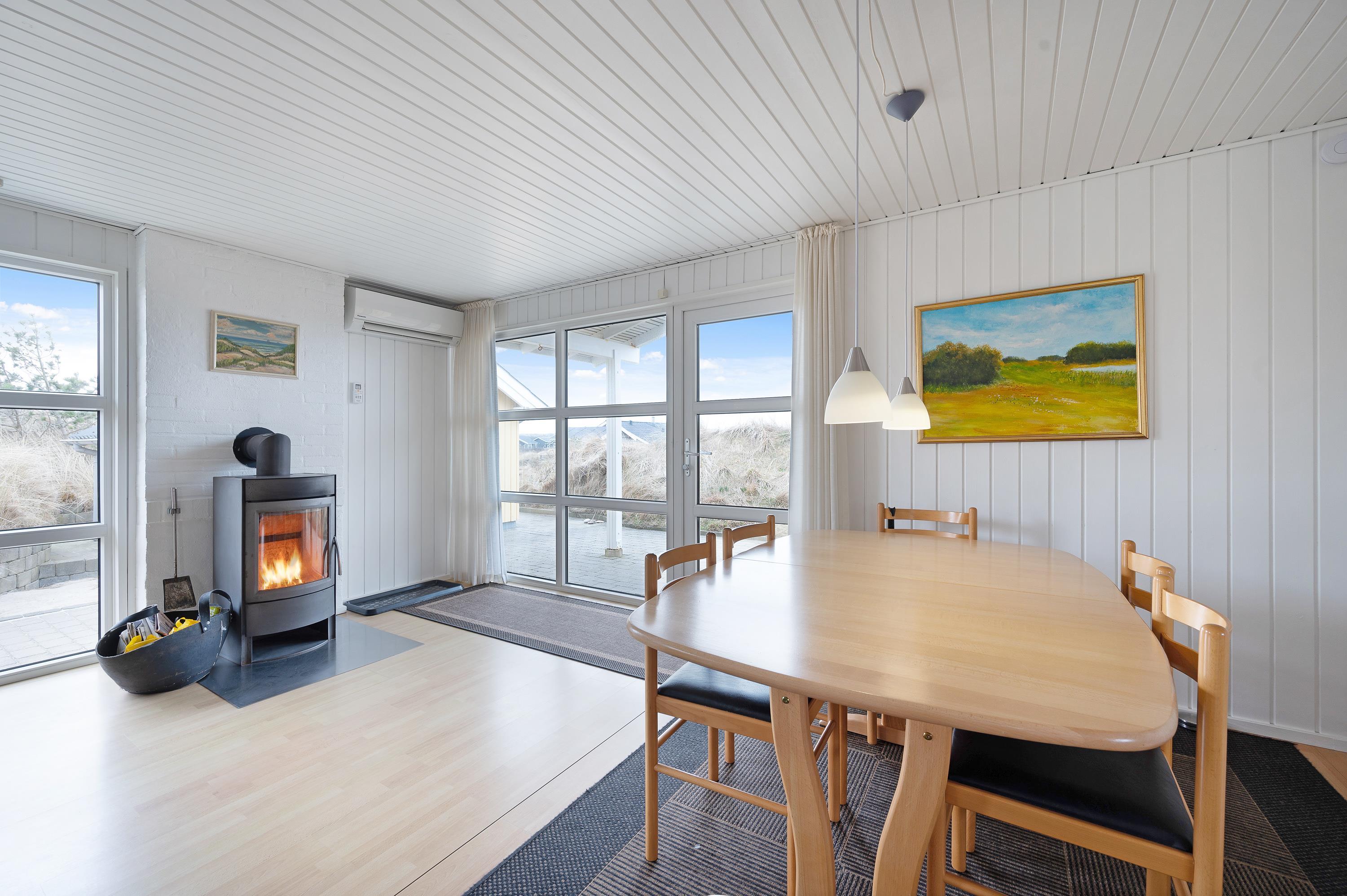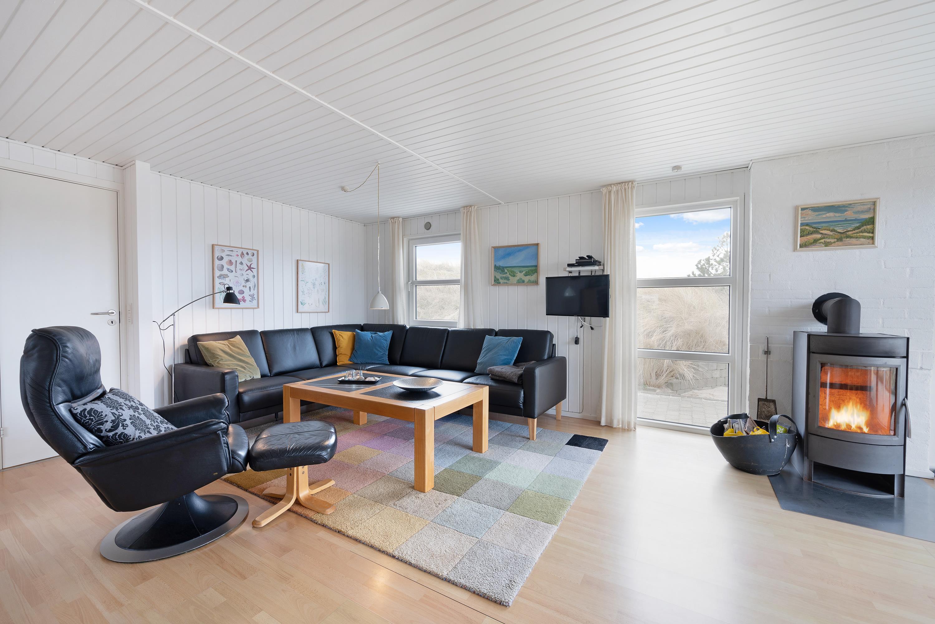 Feriehuset fremstår lyst og rummeligt, så I alle kan være samlet i den hyggelige stue med brændeovn, hvorfra der også er helt åbent til det flotte køkken, så “kokken” også kan være med i fællesskabet, når måltiderne forberedes.