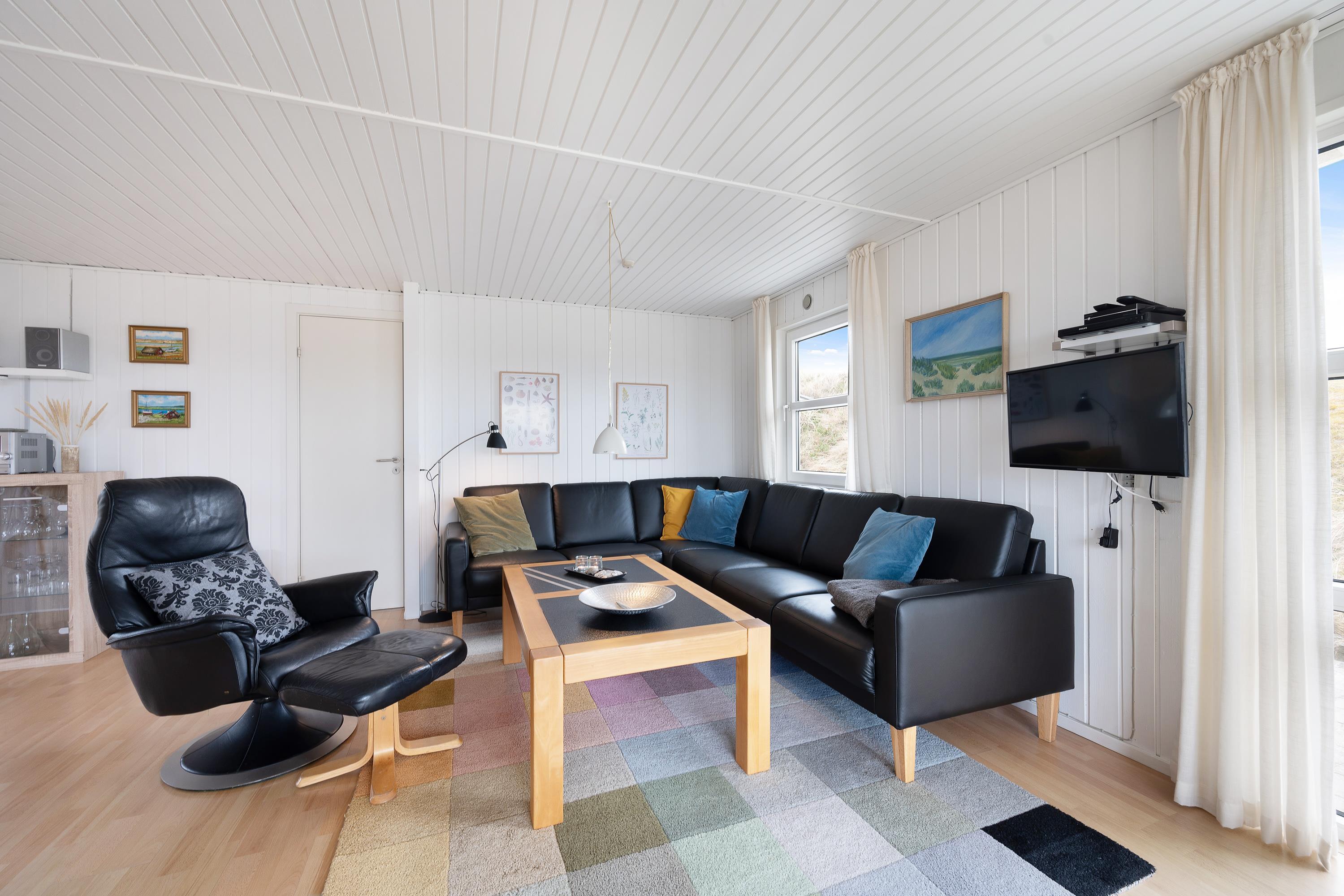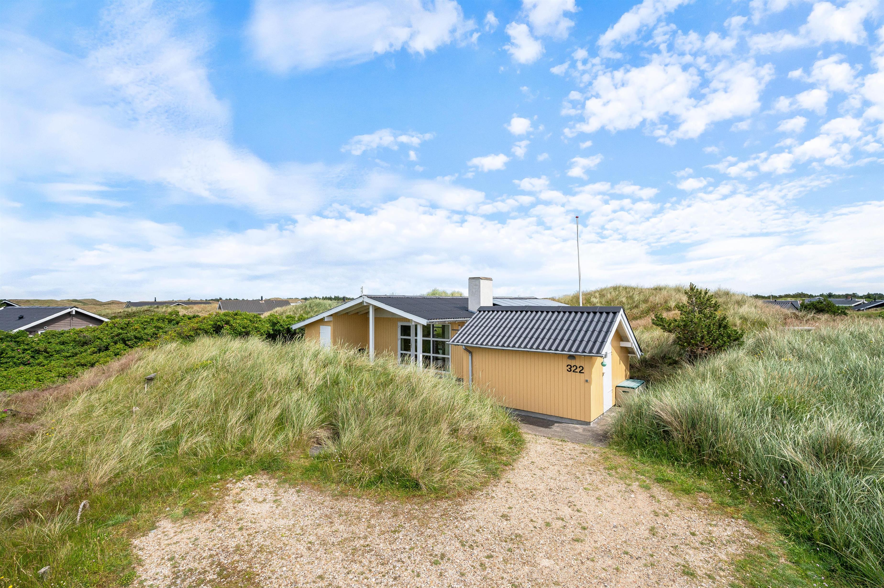 Feriehuset ligger på en kuperet naturgrund på Bjerregårdsvej 322 i et dejligt roligt område med flot natur, ikke langt fra Vesterhavet. Feriehuset er rummeligt og godt indrettet og på de to gode terrasser vil I kunne sidde i læ og ly, så vejret ikke spiller nogen rolle for de hyggelige dage og grillaftener i det fri.