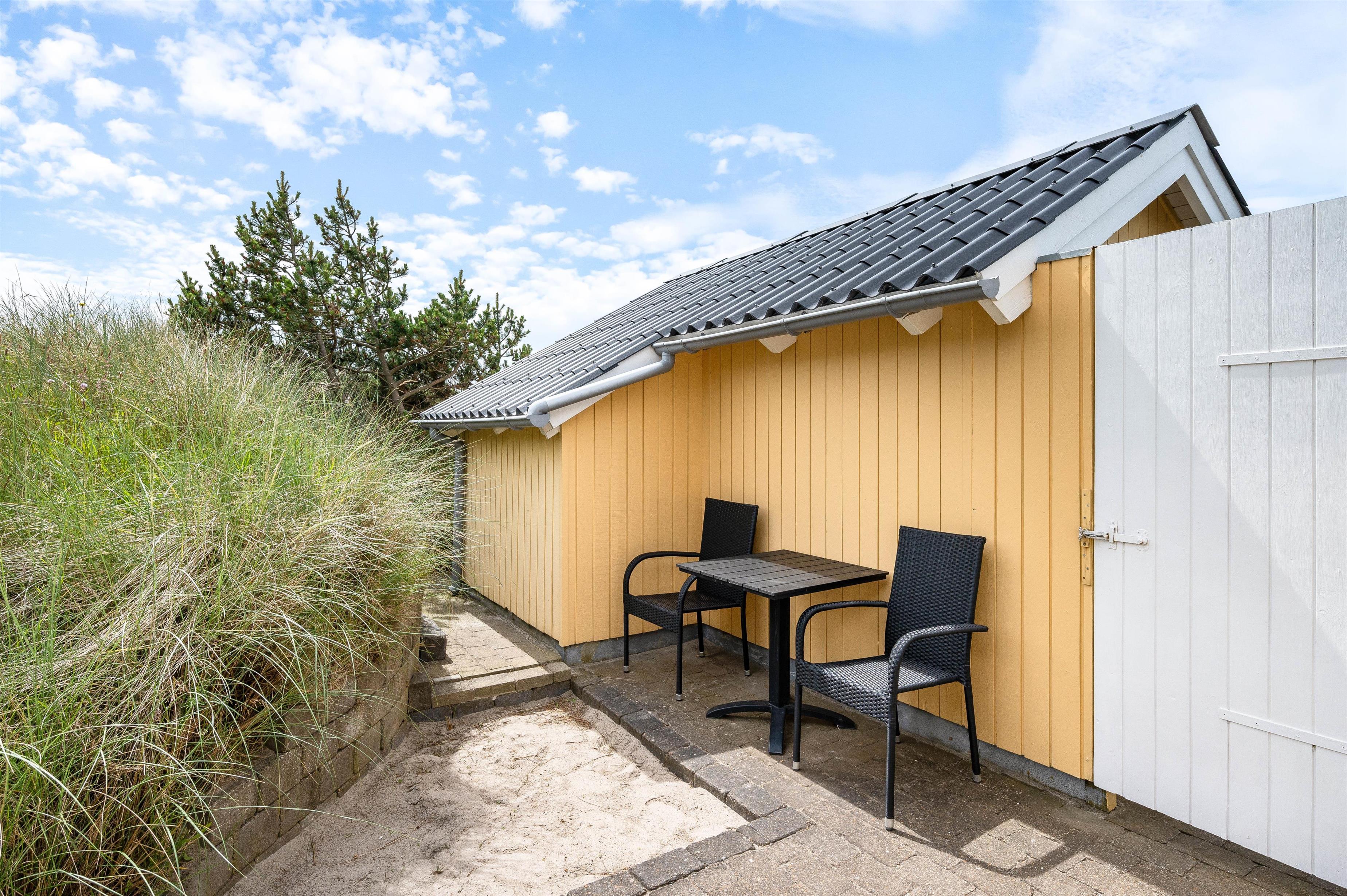 Feriehuset har to skønne terrasser med gode læforhold, så I stort set altid vil kunne sidde ude og nyde omgivelserne og den friske luft. Da den ene terrasse er sydvestvendt, vil I her kunne nyde solen langt det meste af dagen og hen på aftenen, for til sidst at slutte dagen af med en hyggelig grillaften. Og den anden terrasse har et praktisk halvtag, så I her kan søge i skygge fra middagssolen eller i ly, hvis der skulle komme en lille byge.