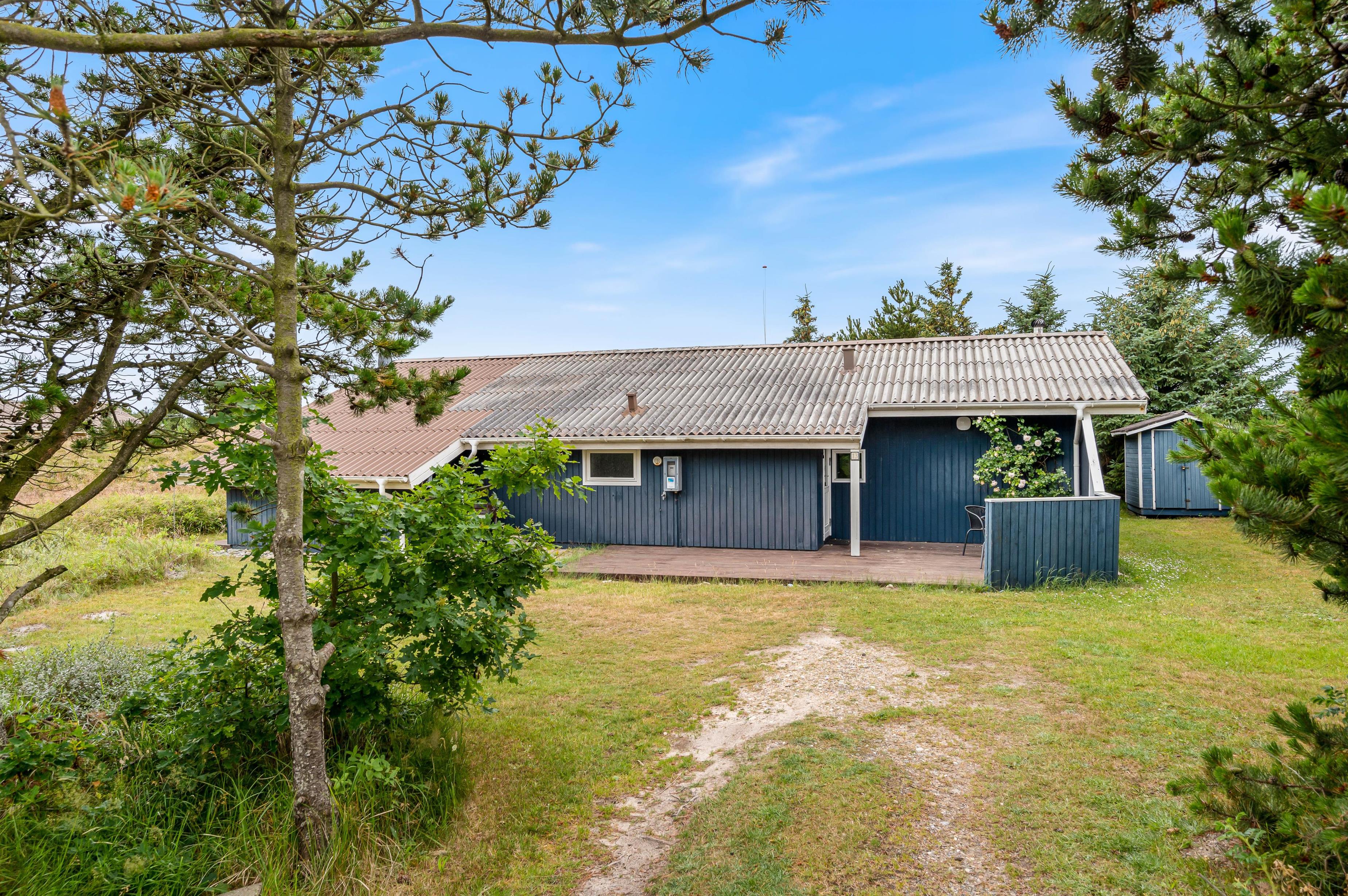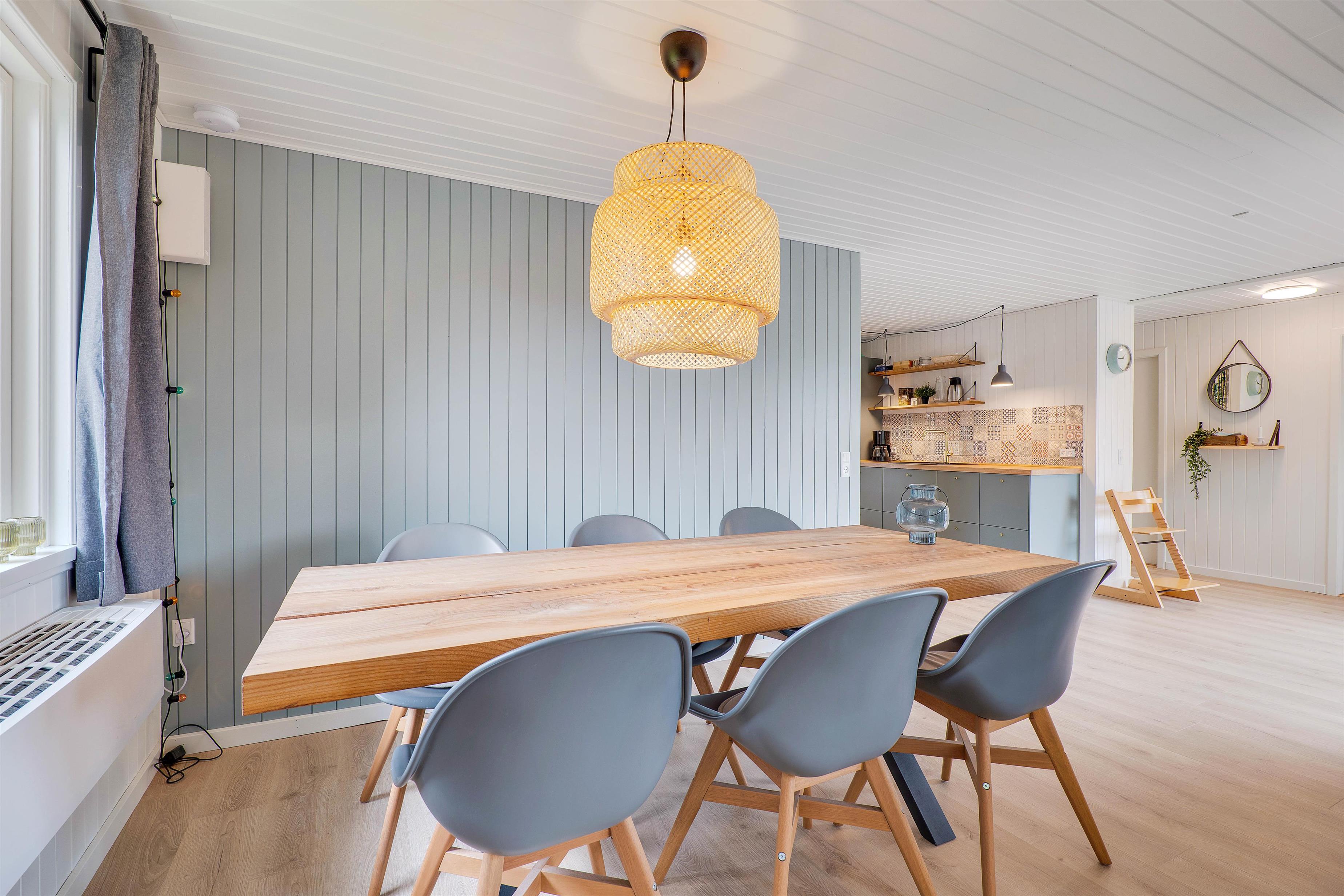 Inde i det blå sommerhus finder I 3 gode soverum og et køkken i forbindelse med det skønne leverum, hvor der er plads til hygge med hele familien. Her er både plads til brætspil, plads til at nyde et veltilberedt måltid og efterfølgende plads til at se en god film på langs i sofaen. Ekstra hygge spredes, når I tænder op i sommerhusets brændeovn – især efter en tur ved stranden eller netop hjemkommet med friskfanget fisk fra Hvide Sande, er det skønt.