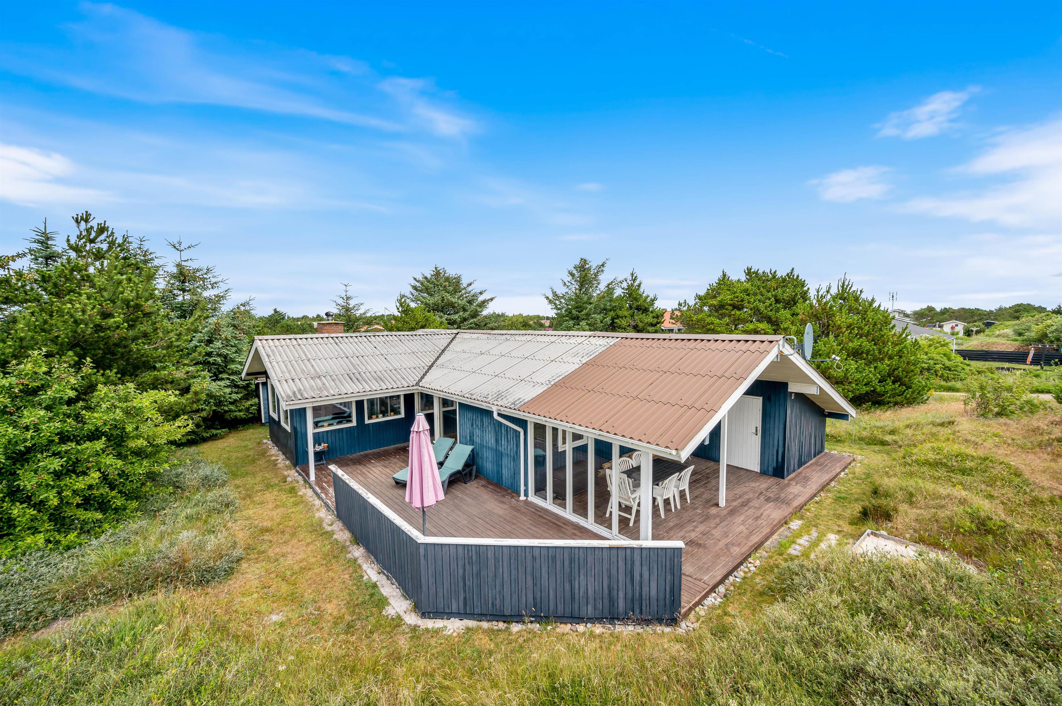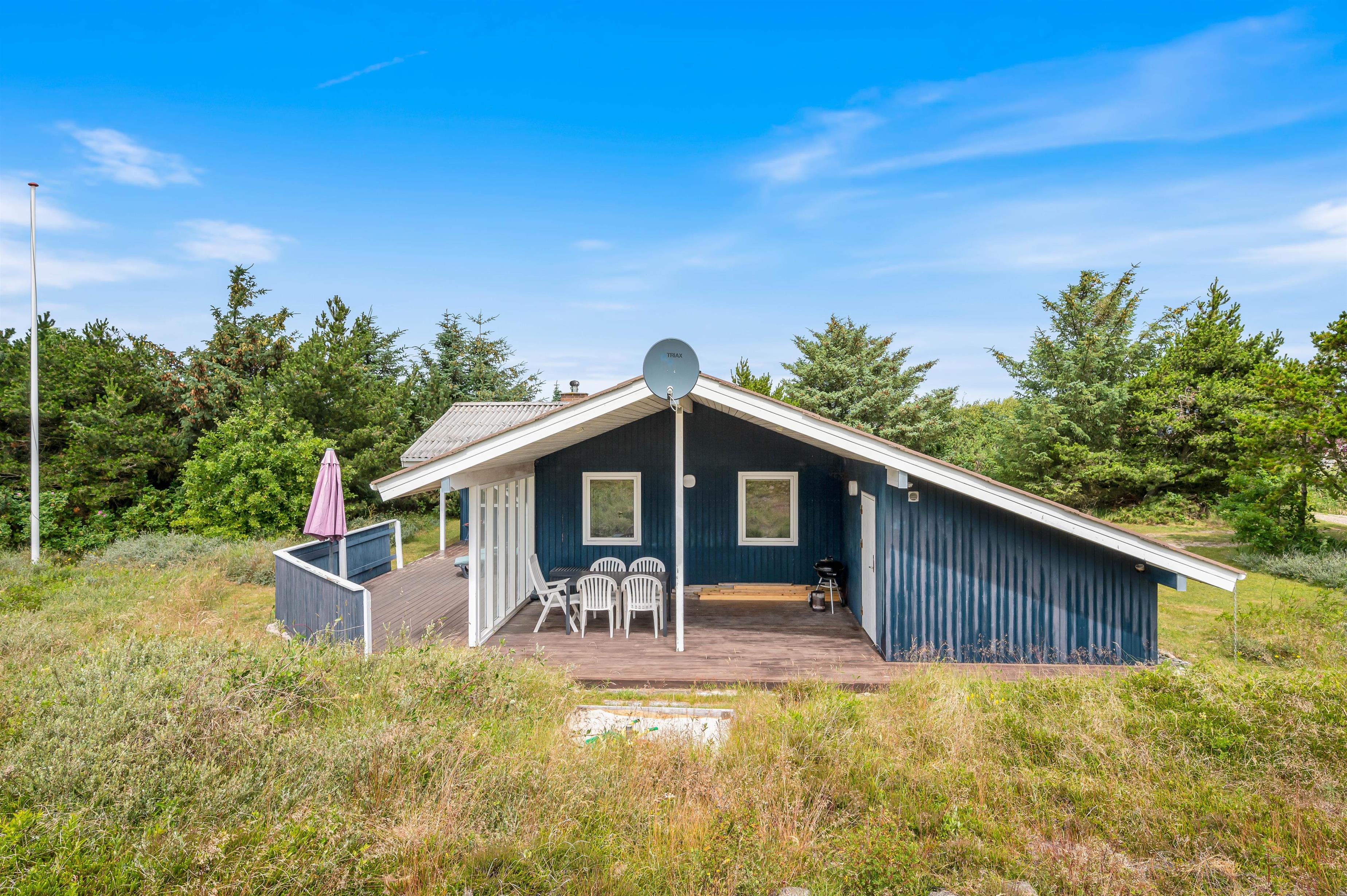 Her kan I holde ferie i et sommerhus beliggende på en fredelig, læfyldt grund med skøn overdækket terrasse, både mod syd og mod øst. Der er god plads til 5 personer, gratis internet og brændeovn i sommerhuset på Dortheasvej 13. Fra sommerhuset er der hverken langt fra Vesterhavet eller indkøb, mens Hvide Sande også kun er 10 minutter væk i bil.